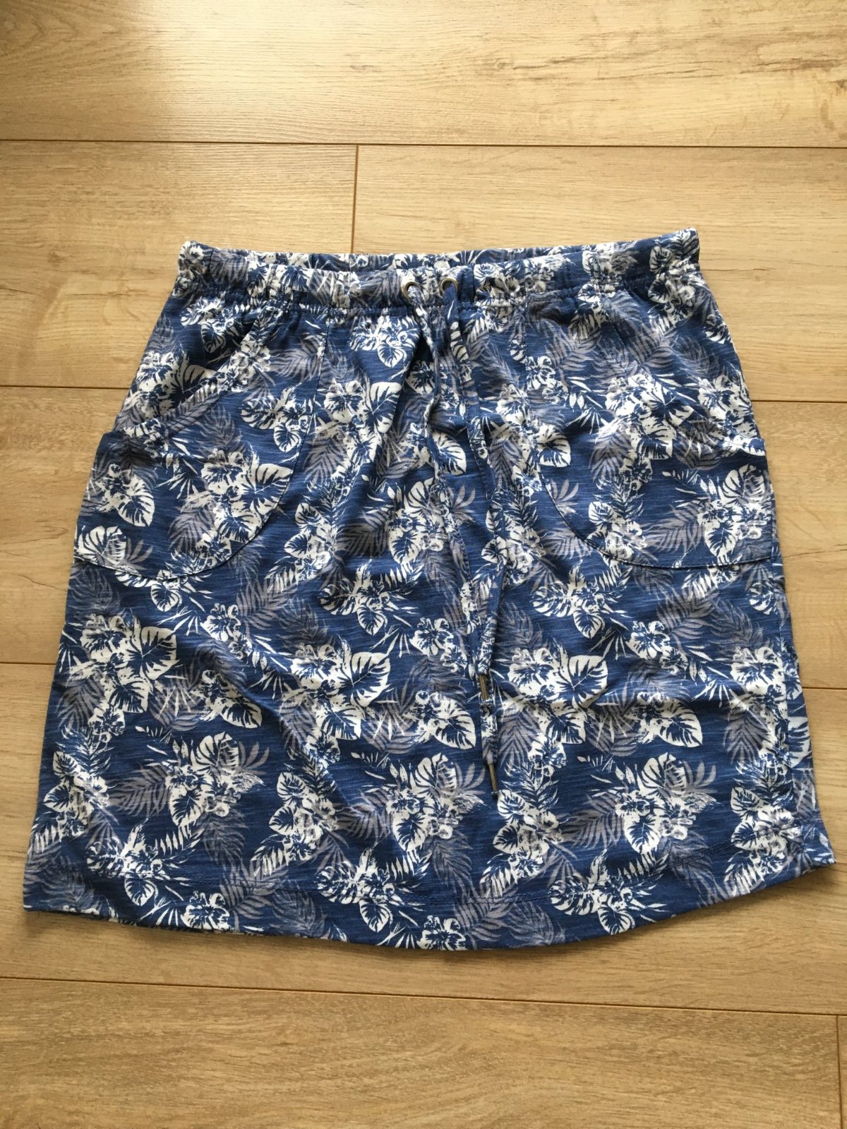 Predám dámsku letnú sukničku. Sukňa má na prednej strane z oboch strán vrecká. Pas sukne je gumičkový a ešte je možnosť stiahnuť šnúrkou.