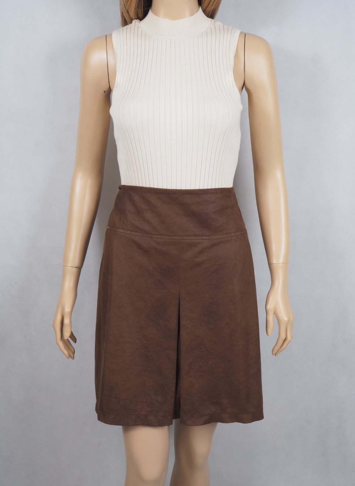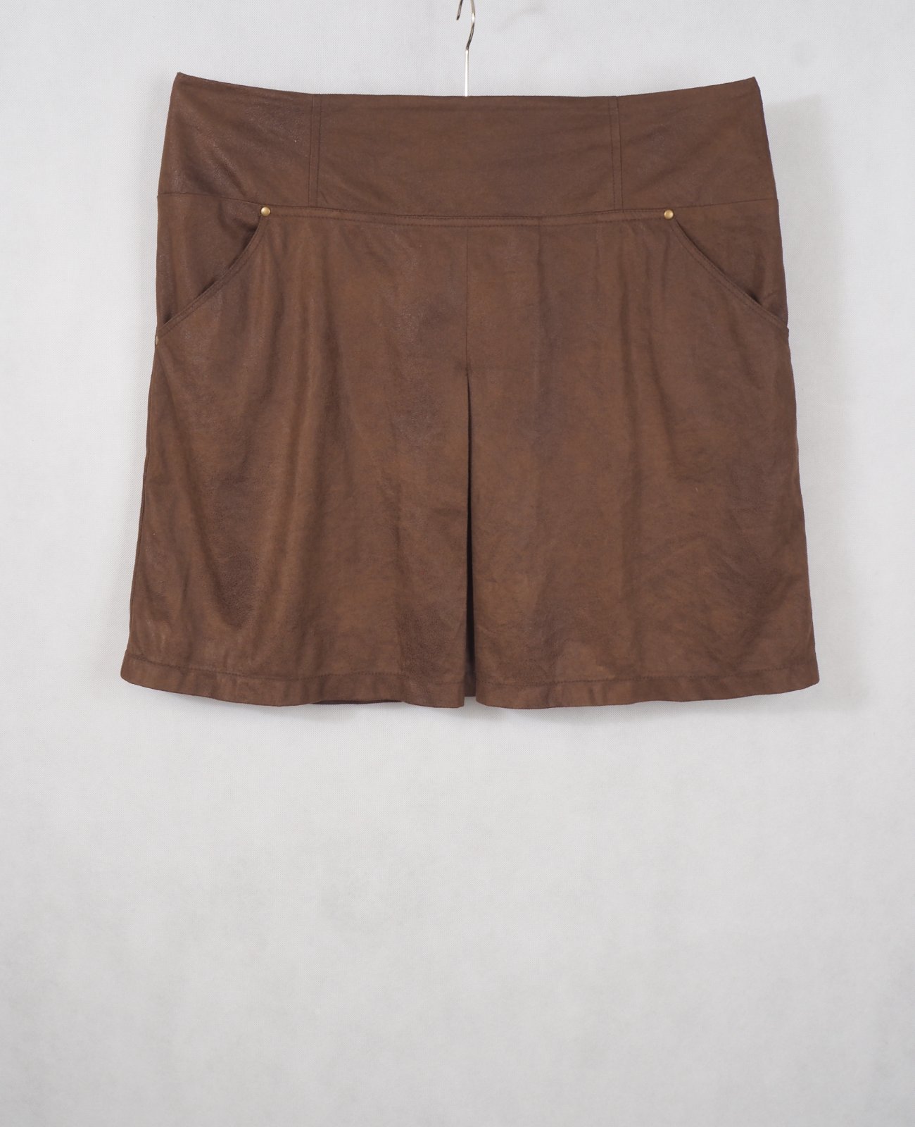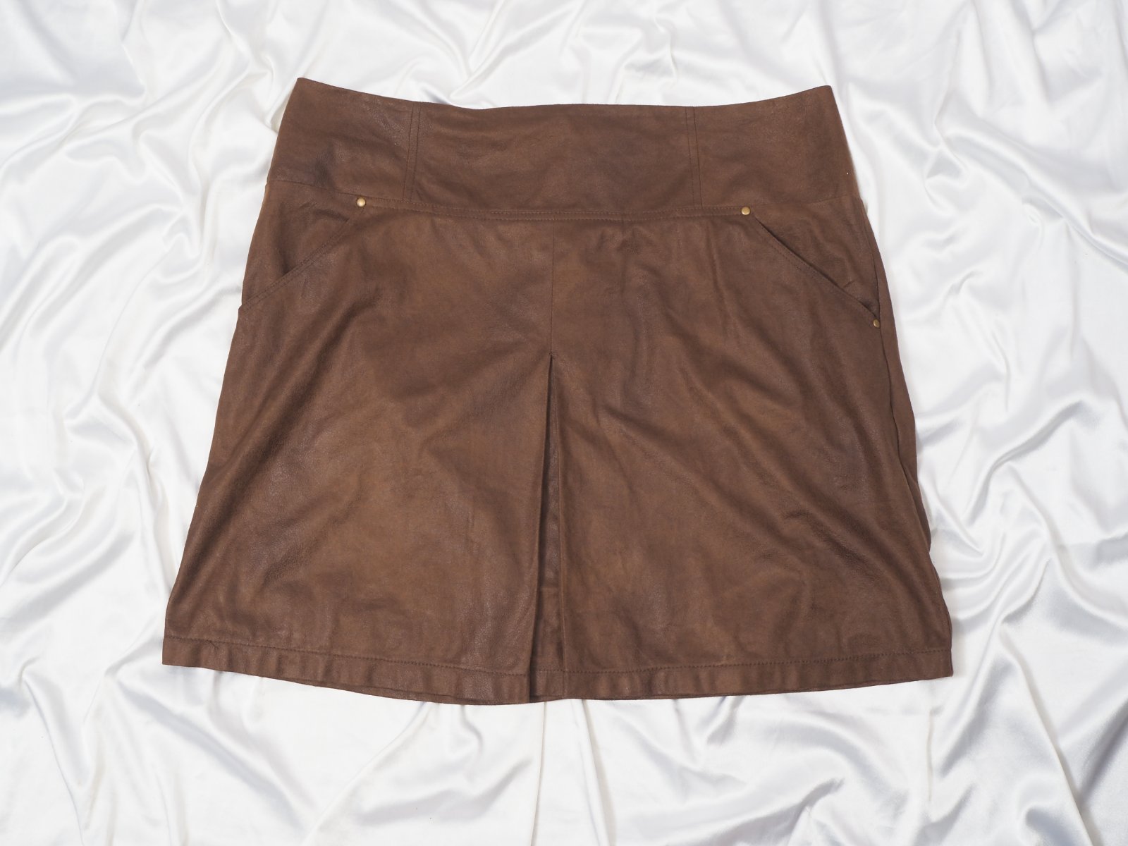 Kvalitná tmavohnedá sukňa, vzhľad kože, vpredu všité vrecká, vzadu zips, materiál 100% polyester, super stav.