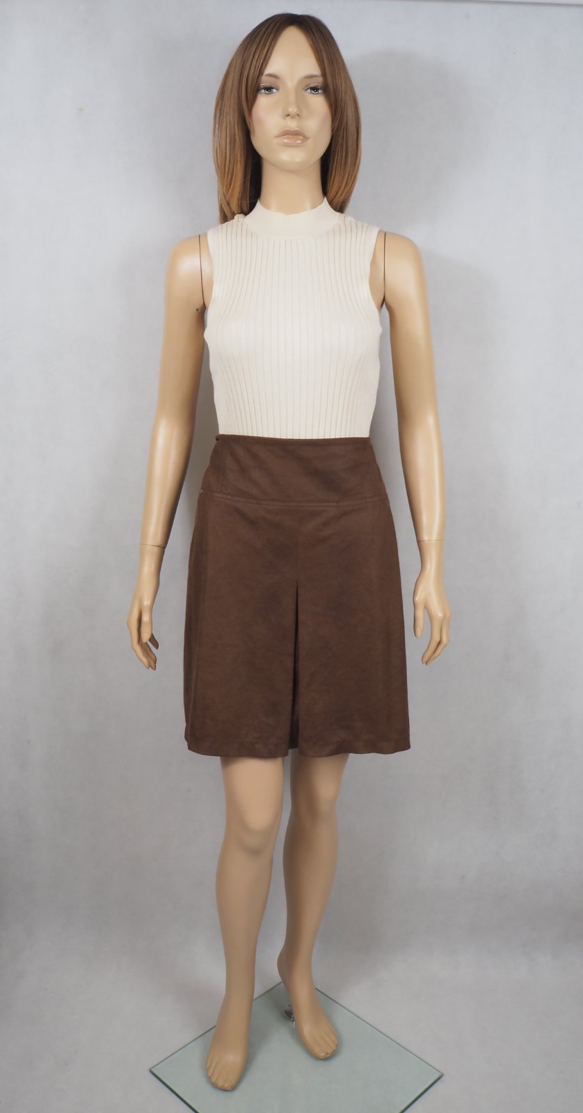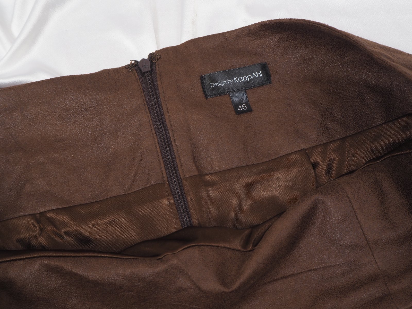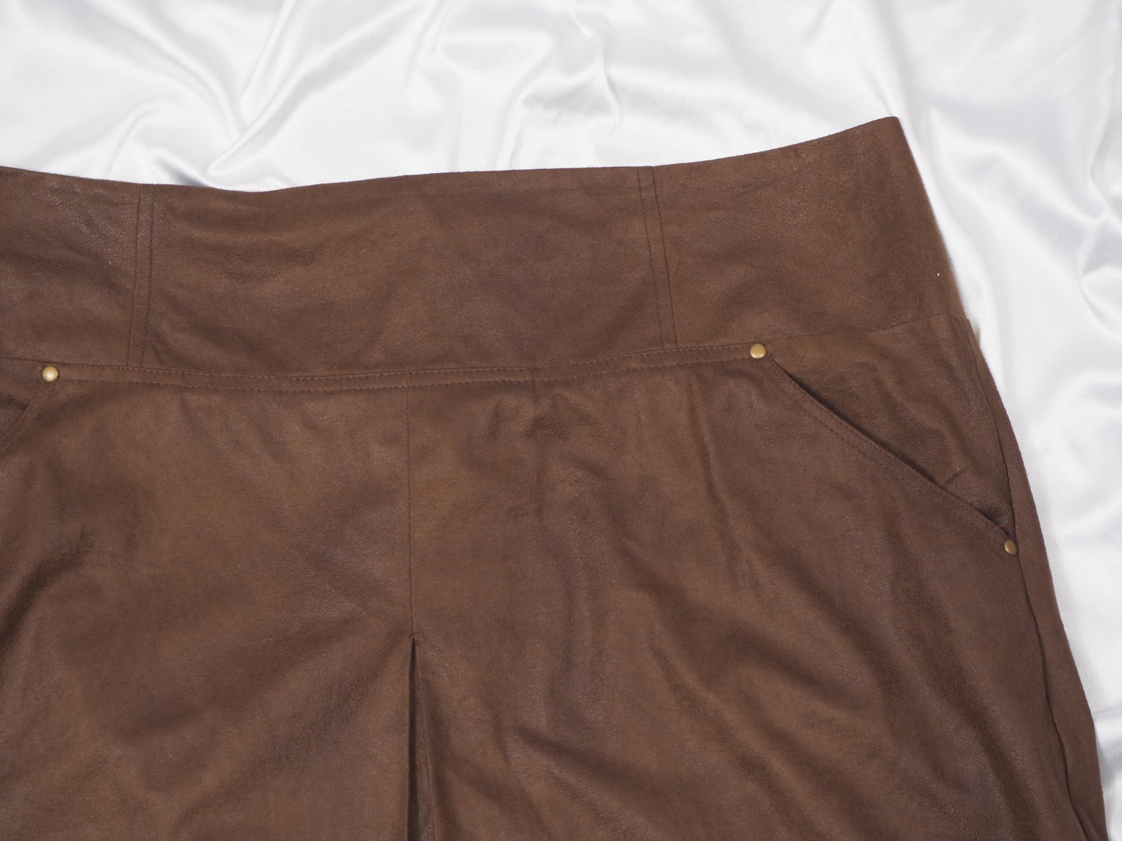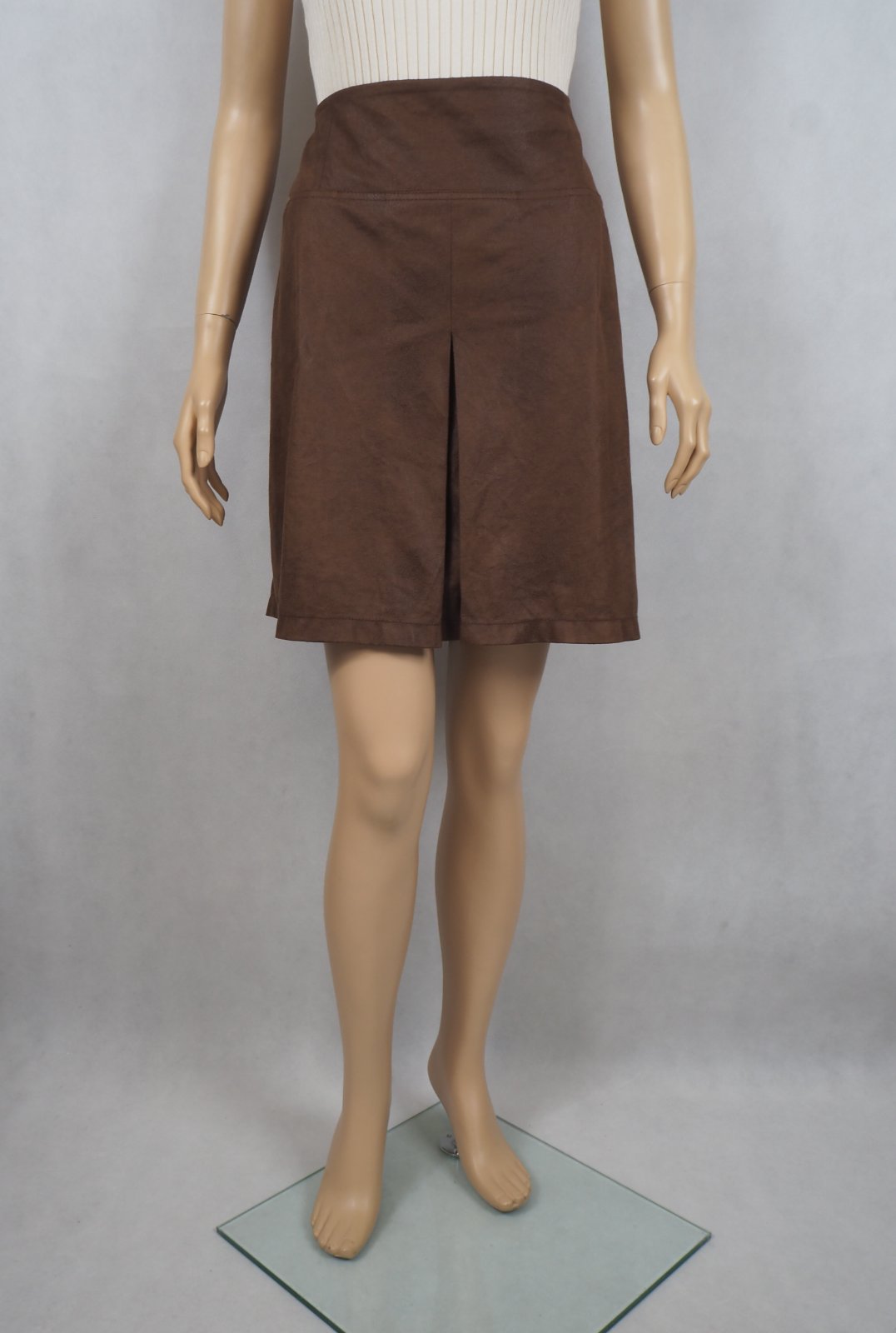 Kvalitná tmavohnedá sukňa, vzhľad kože, vpredu všité vrecká, vzadu zips, materiál 100% polyester, super stav.