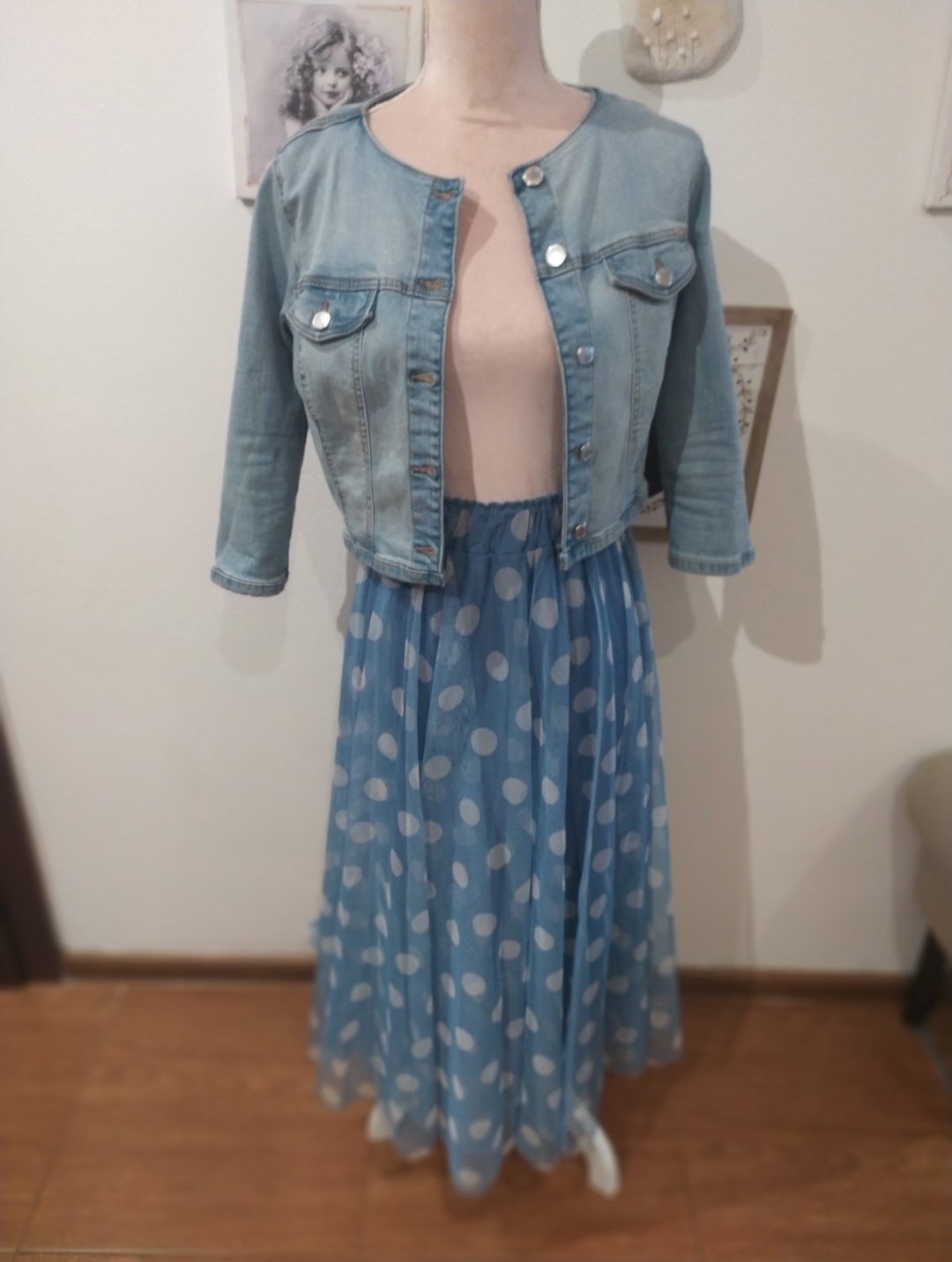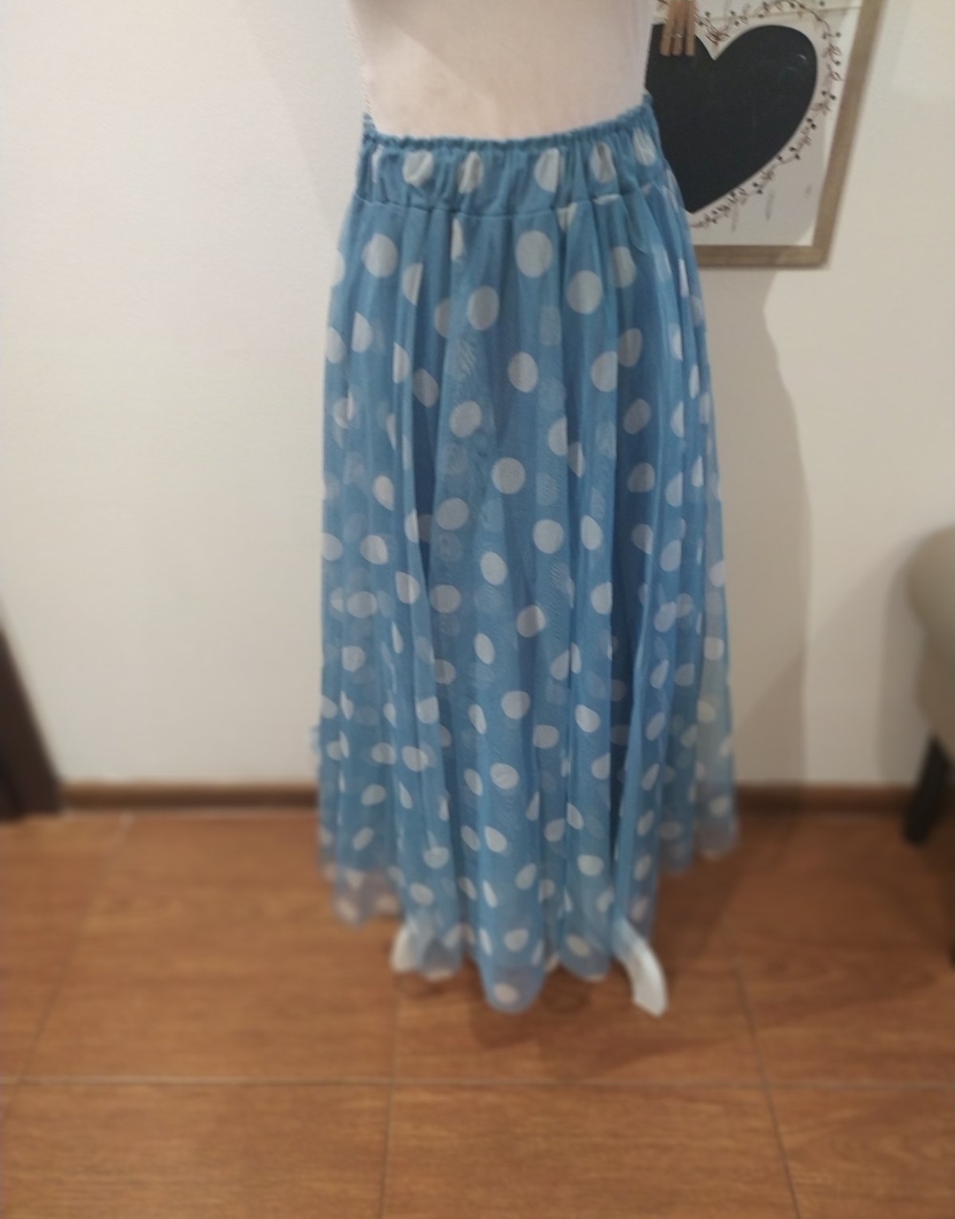 Nenosene. Krasna tylova sukna, trblietava spodnicka, velkost UNI. K bielemu topu sedi krasne. Ja si nechavam vsak ruzovu. Tak dve nevynosim.farba je to sivomodra