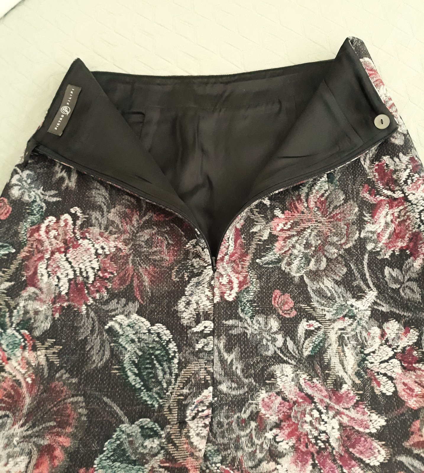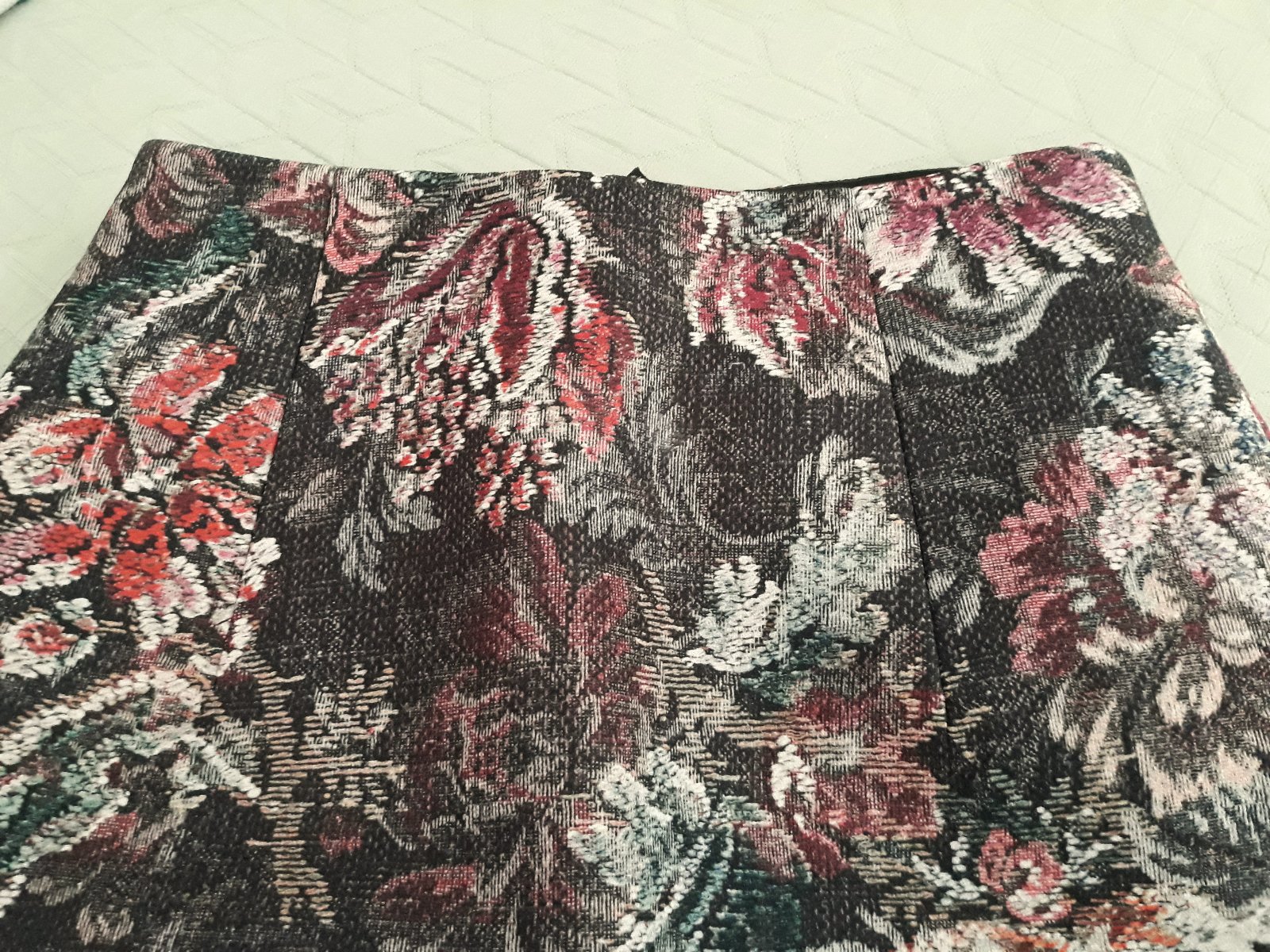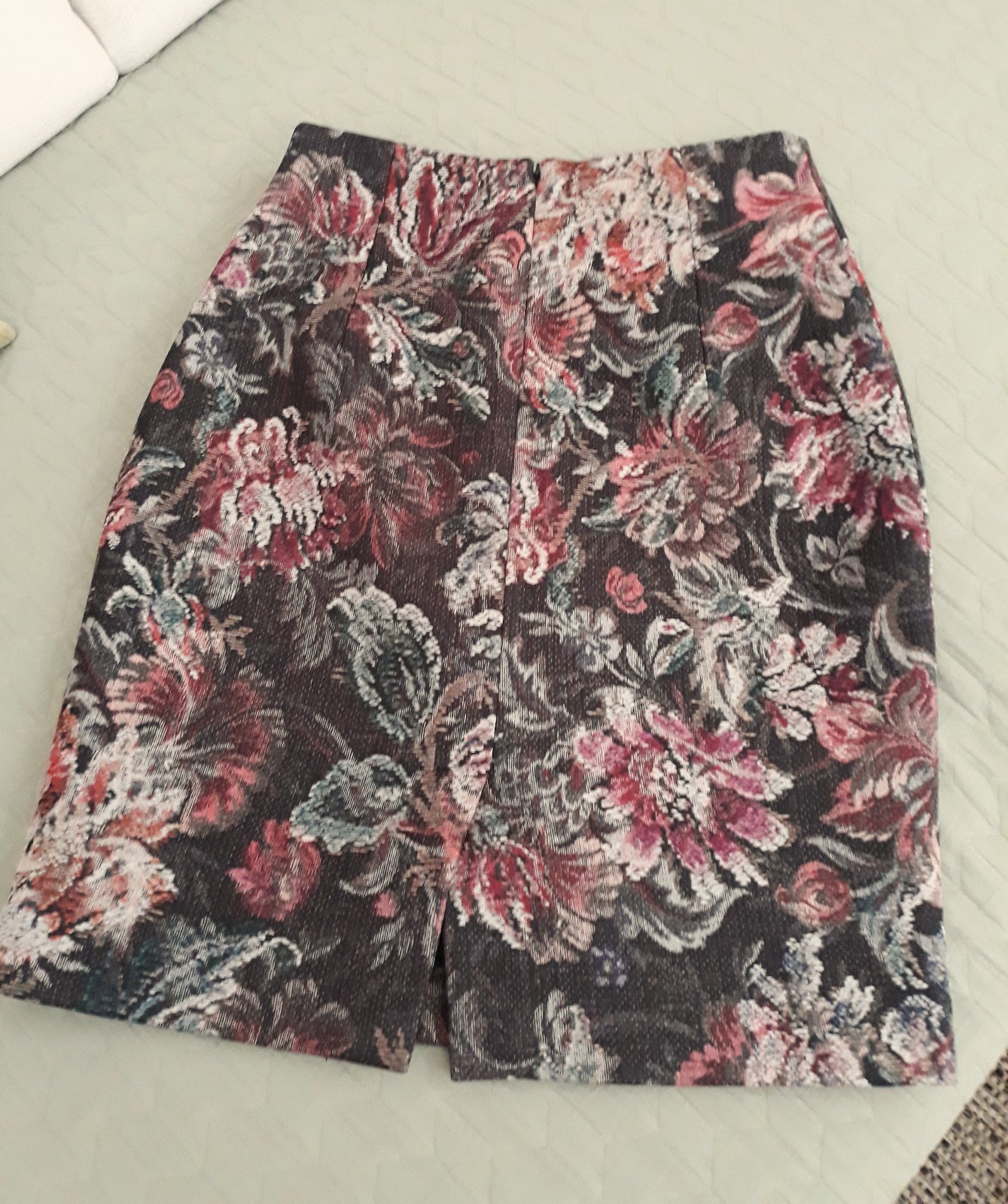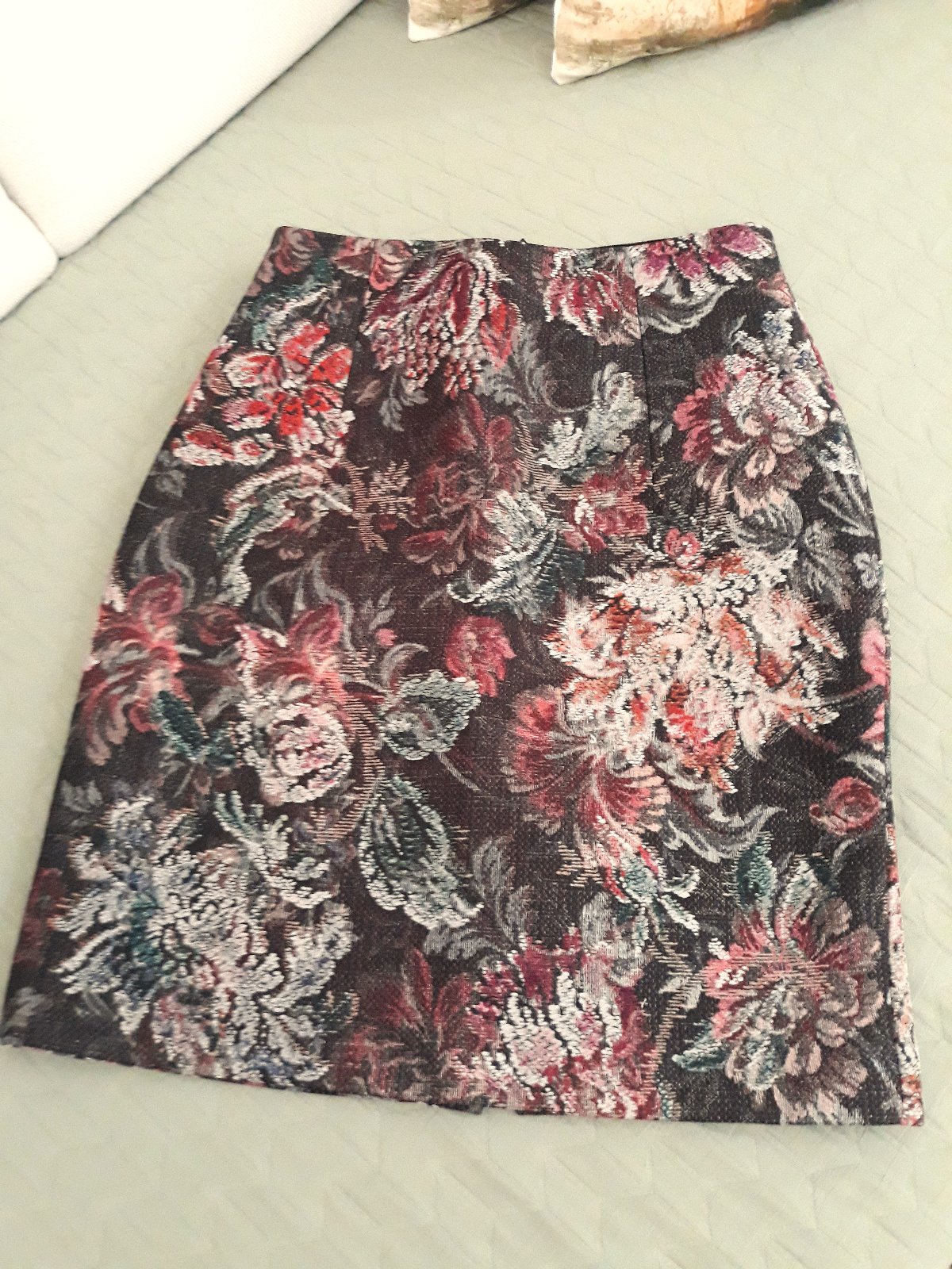 Predám krásnu, úplne novú elegantnú sukňu zn. Pietro Filipi, veľkosť S. Sukňa je skôr vhodná na slávnostnú príležitosť, ale aj na bežné nosenie, kto sa ako rozhodne :) Vysoko kvalitná pevná hrubšia štruktúrovaná látka. V páse je gombík a krytý zips. Sukňa má čierne futro, vzadu rázporok. Šírka v páse 34cm. Dĺžka vrátane pásu 55cm. Farby sú rôzne, prevažujú bordovo ružové kvety (rôzne odtiene), rôzne odtiene zelených listov, čiernej, hnedej šedej.... Krásne stojí na postave.