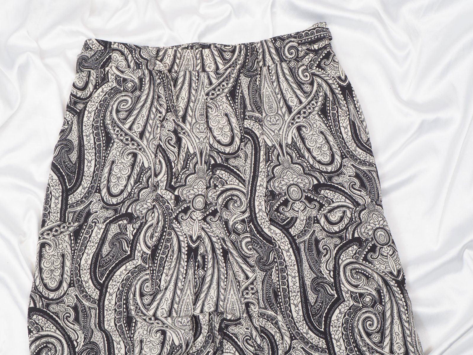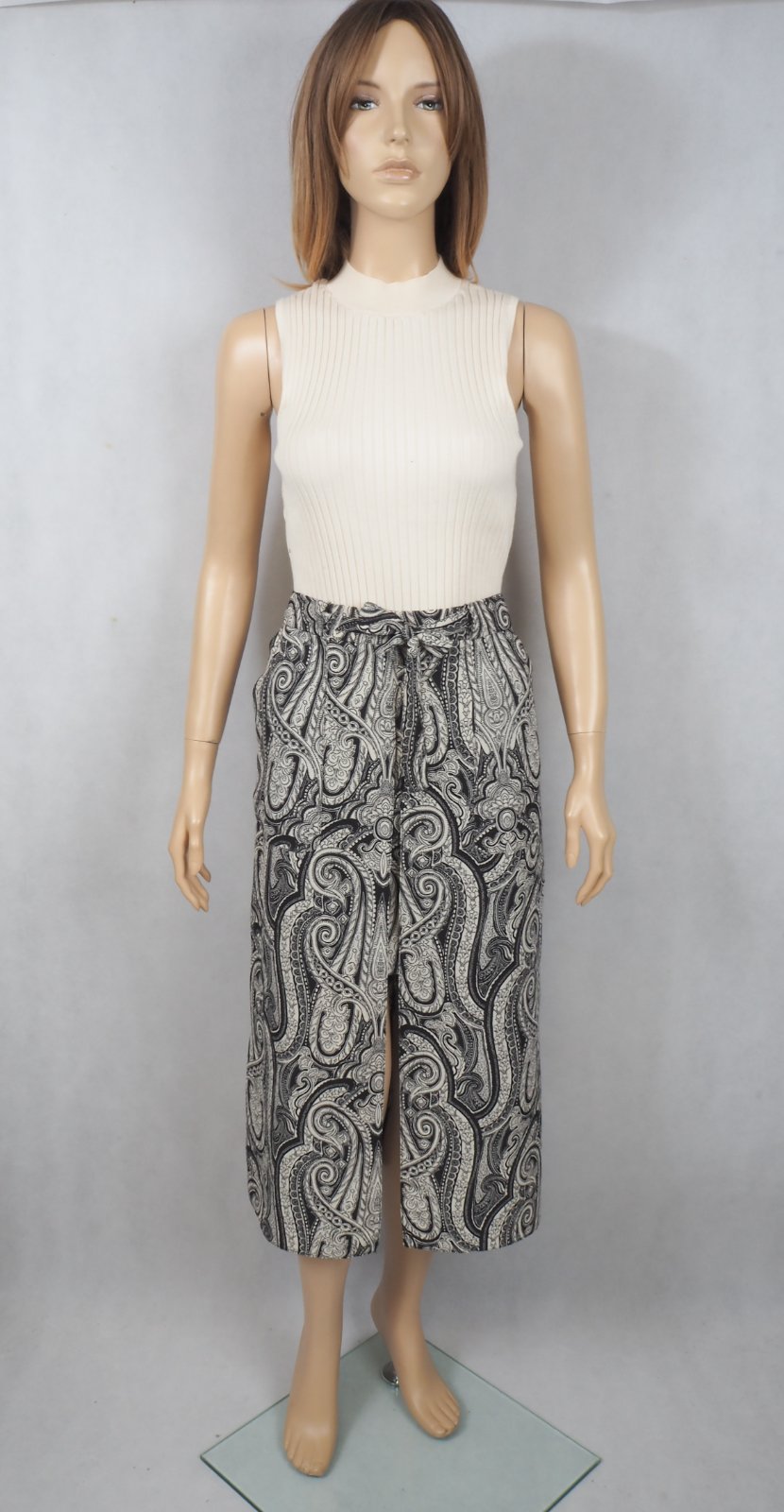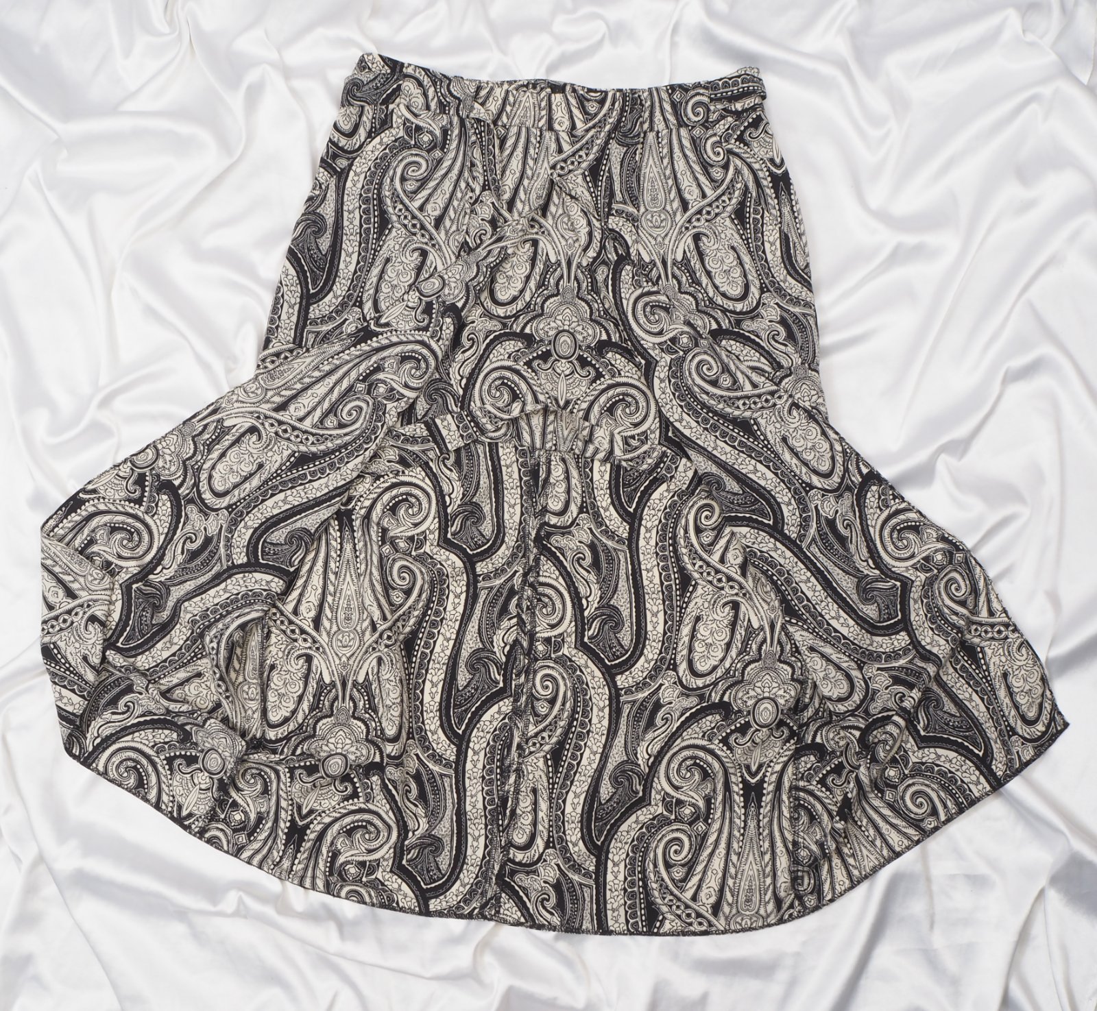 Kvalitné vzorovaná sukňa čierno-béžovej farby, dvojitý vzhľad, vpredu rozparok, bočné našité vrecká, materiál 100% polyester, bez podšívky, vzadu zips, v páse opasok, super stav.