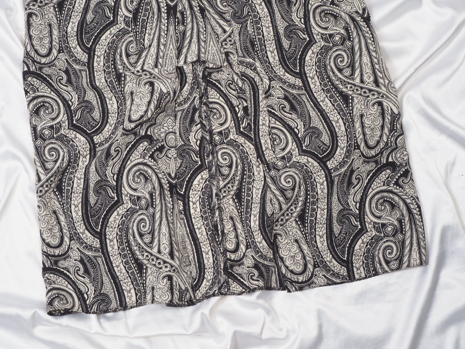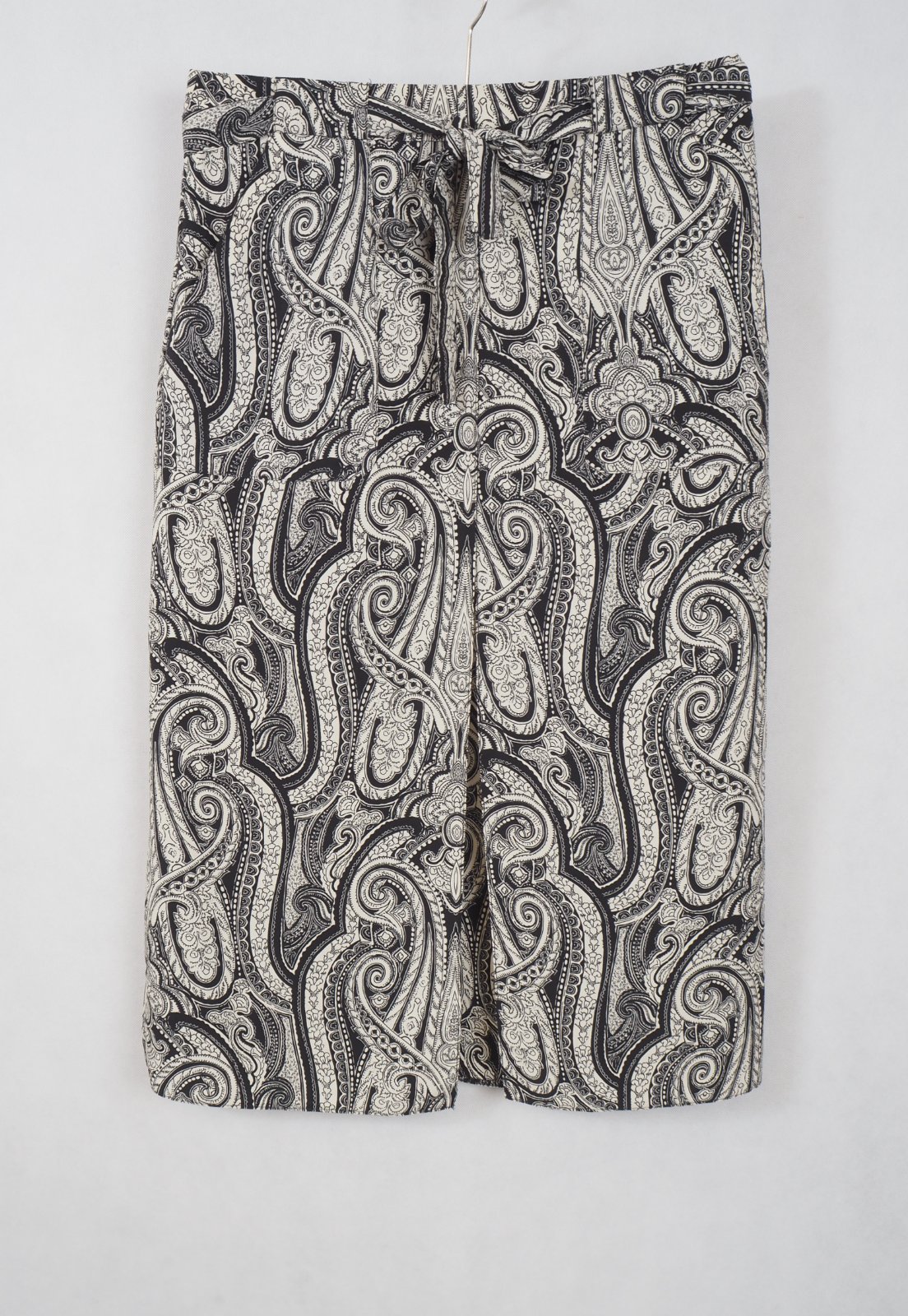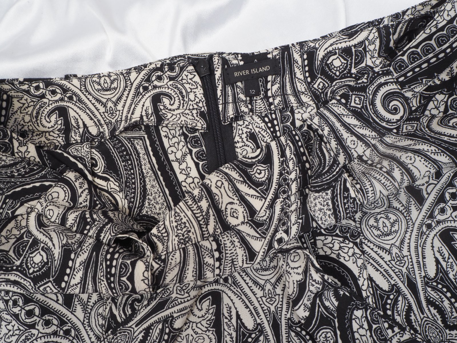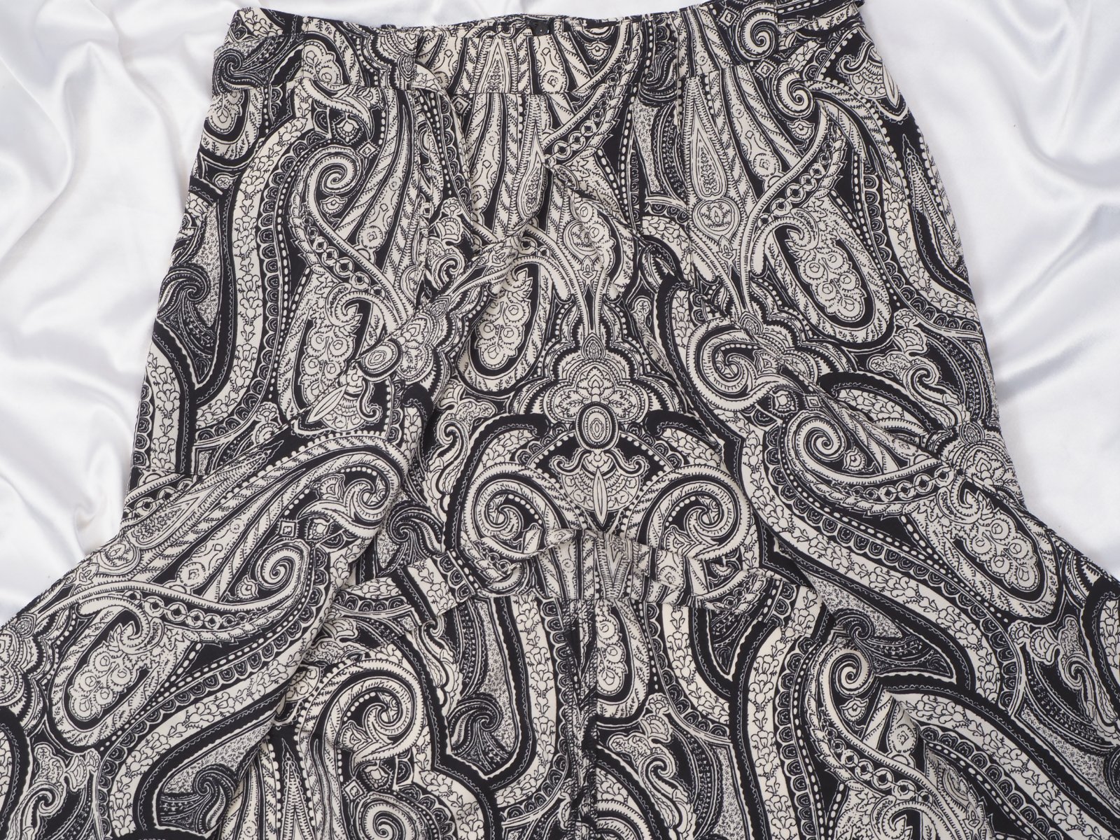 Kvalitné vzorovaná sukňa čierno-béžovej farby, dvojitý vzhľad, vpredu rozparok, bočné našité vrecká, materiál 100% polyester, bez podšívky, vzadu zips, v páse opasok, super stav.