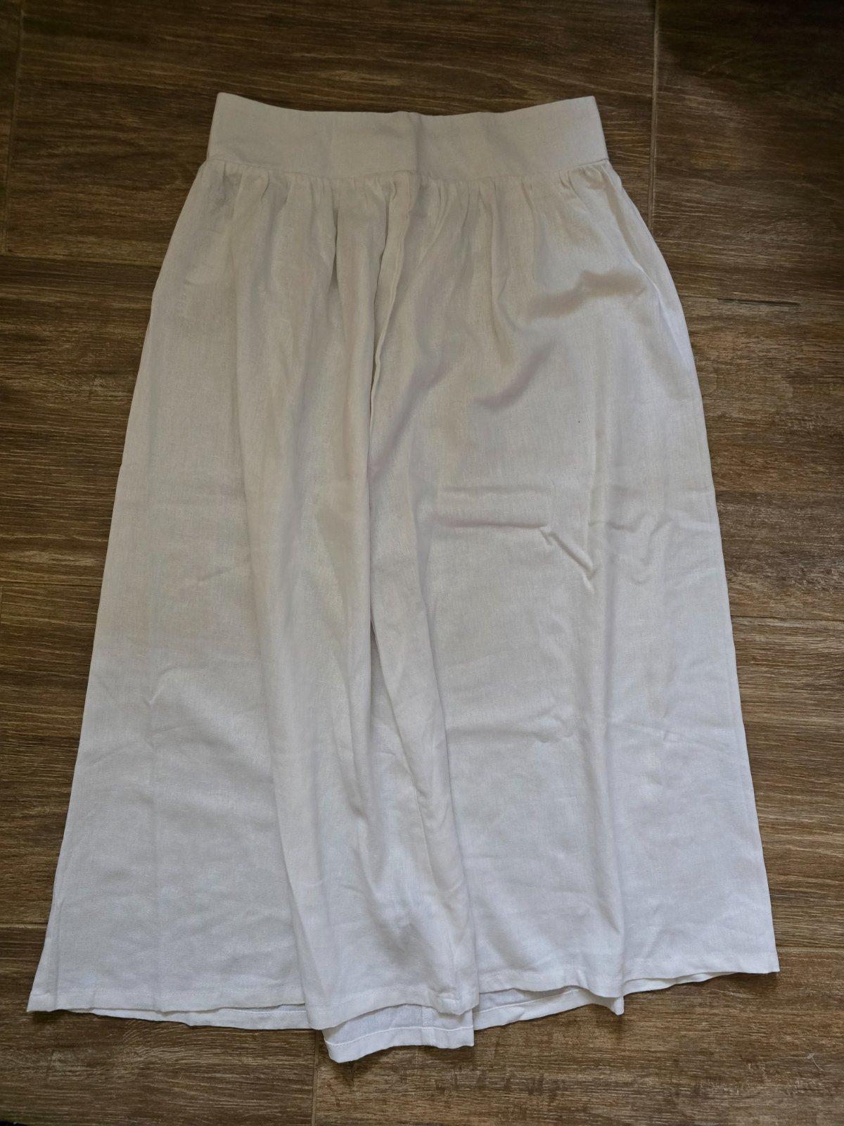 dámska biela ľanová sukňa na leto, v páse šnúrka na zatiahnutie, príjemný kvalitný materiál, zloženie: 55 % ľan, 45 % viscoza, stav: výborný, málo nosený, uvádzaná veľkosť na štítku 42,12, zodpoved...