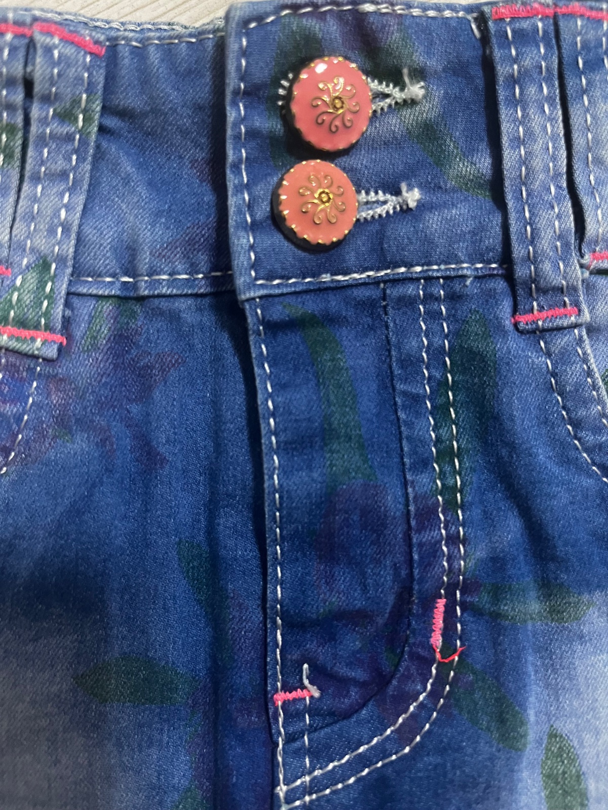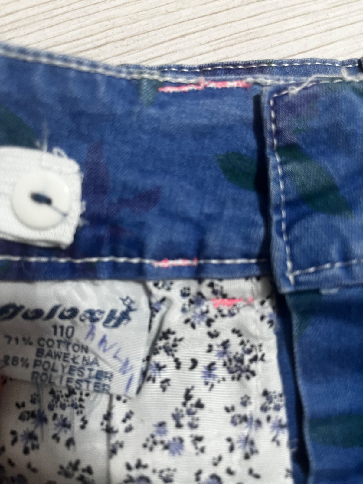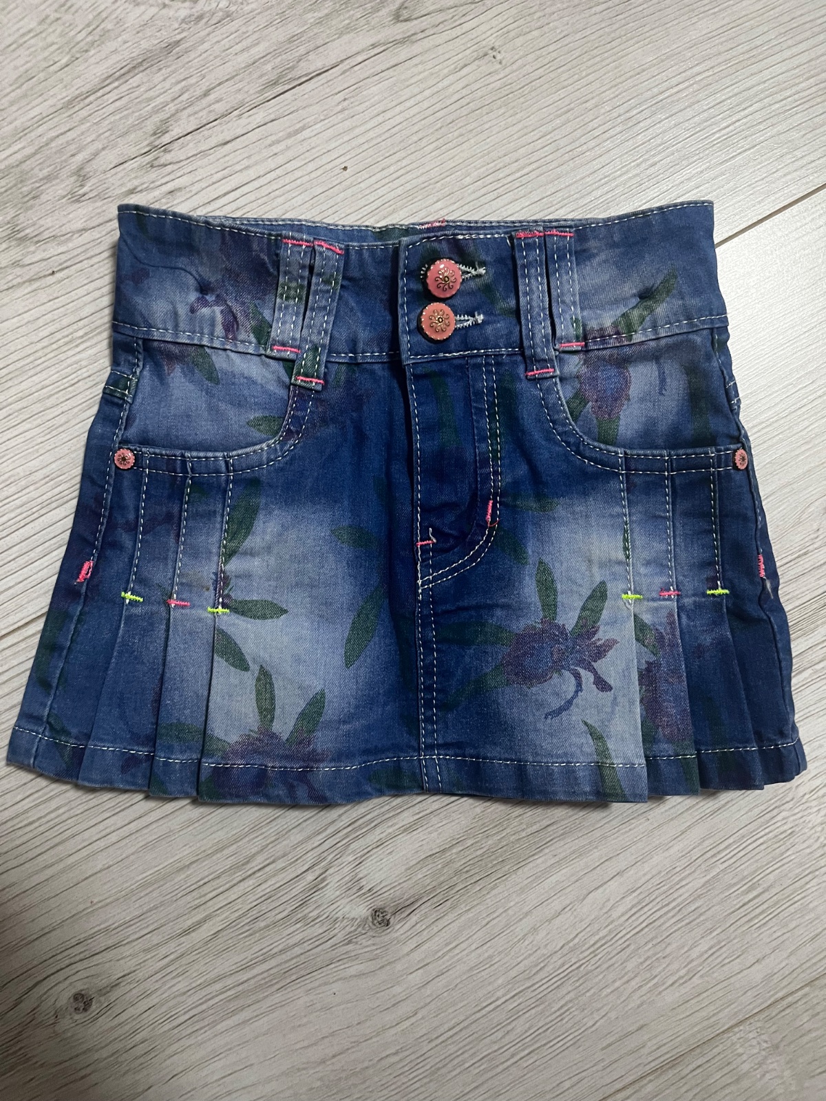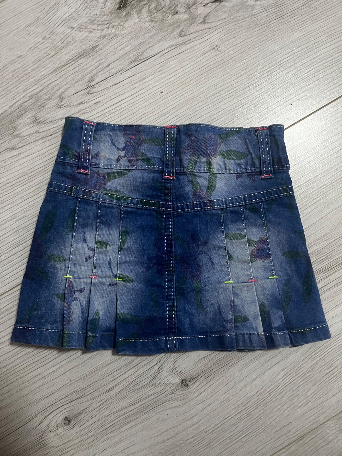 Predám skladanu rifľovú sukňu so vzormi kvetov značky: galaxy, veľkosť: 110. Sukňa ma reguláciu v pase. Dĺžka: 22 cm.