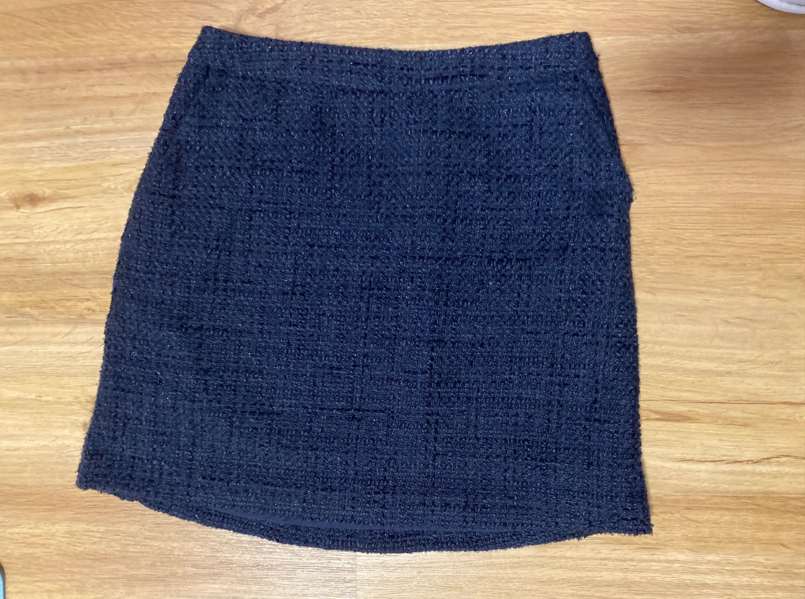 Tmavě modrá sukně z hrubší látky s všitou spodničkou, decentně prošitá lesklou nití, na stranách malé kapsy, na zip na boku.