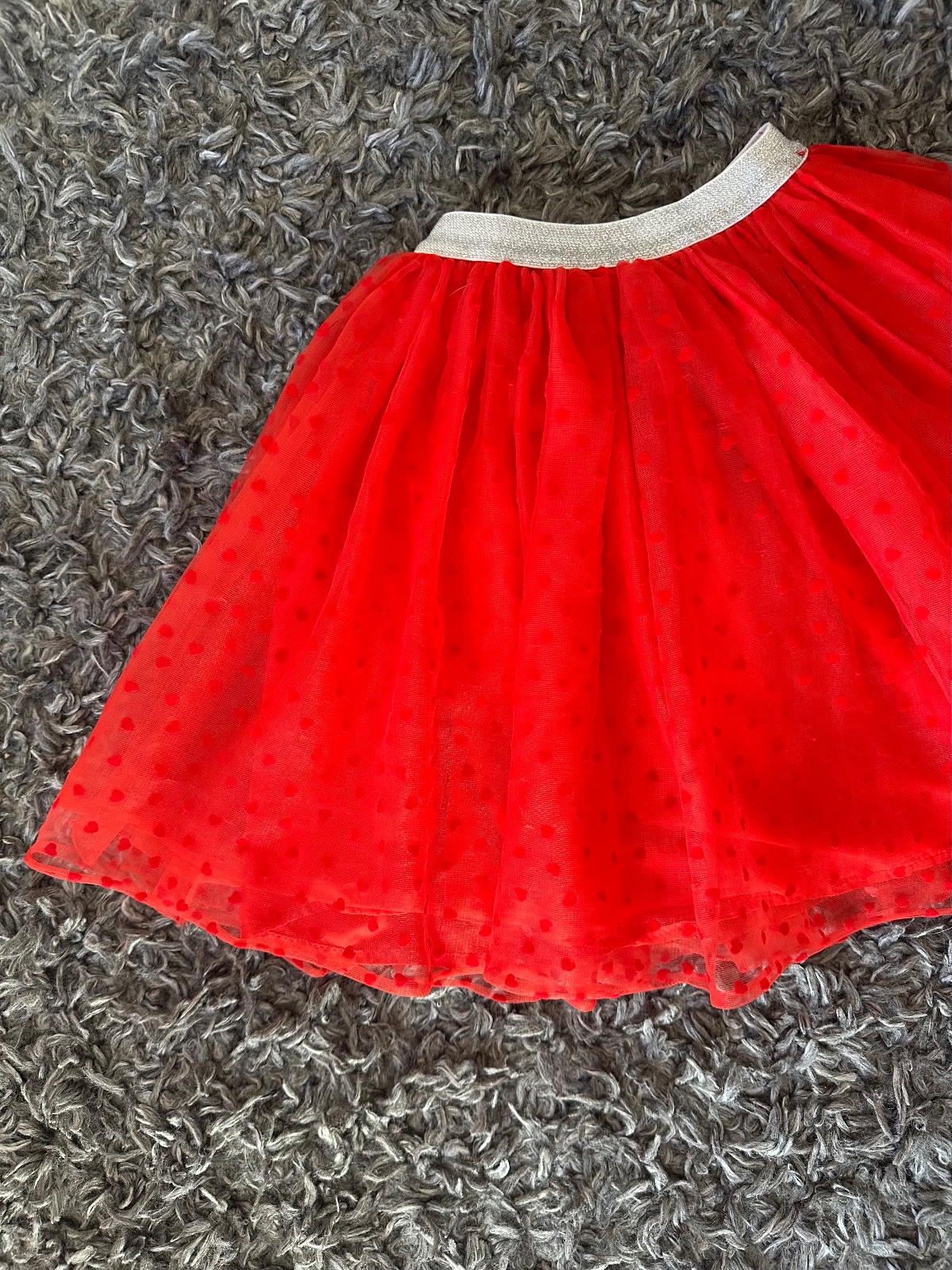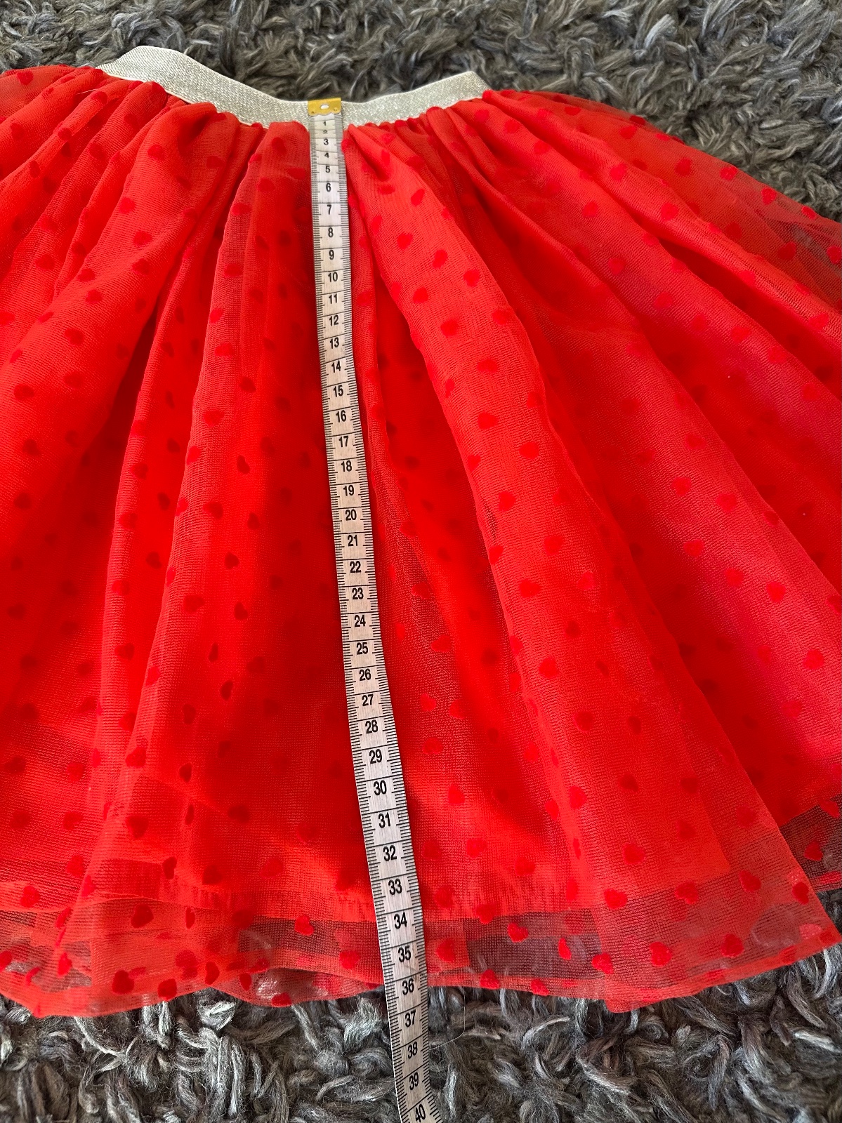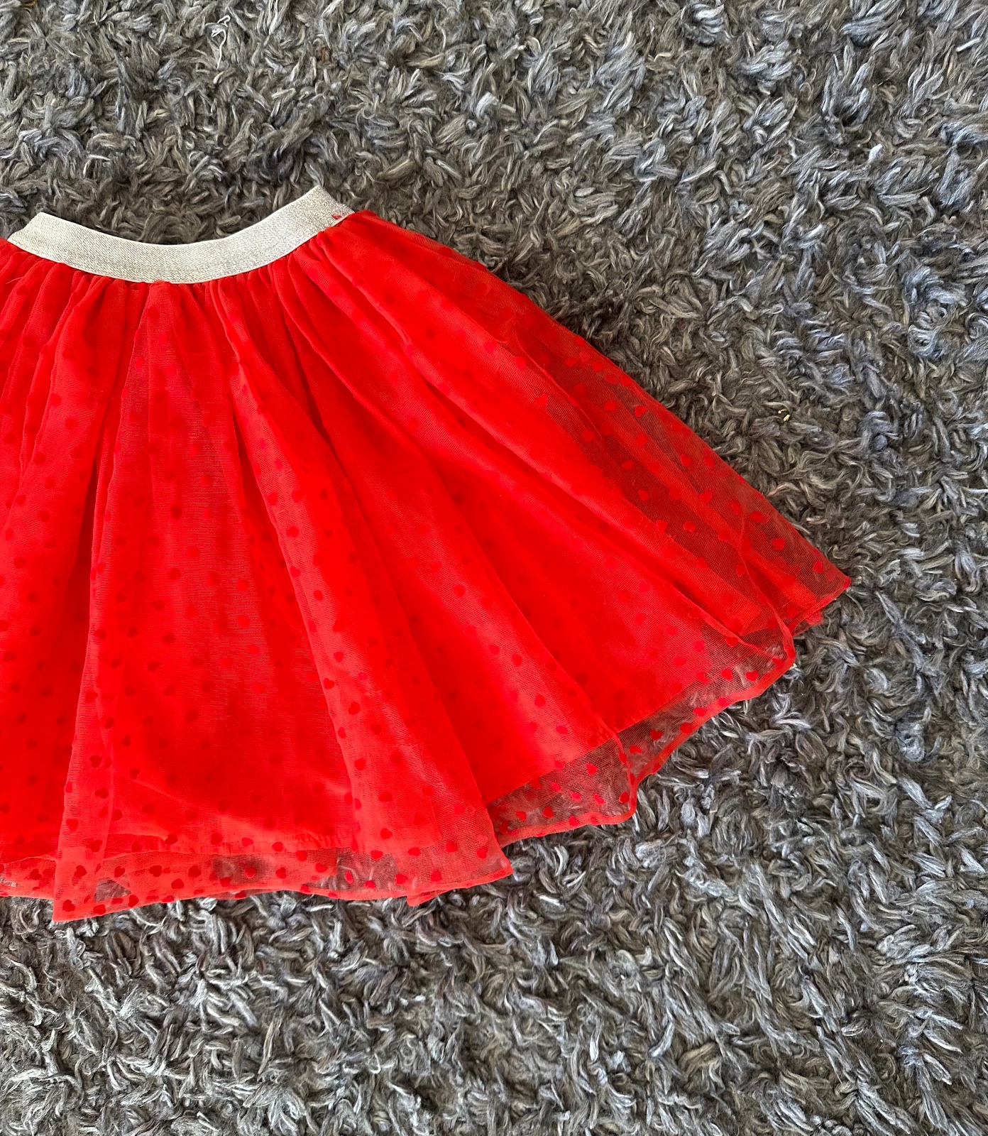 Nádherná jasno-červená tylová suknička so srdiečkami, so striebornou dostatočne naťahovacou gumou v páse. Veľkost písaná 110, my sme ju nosili od 4-8 rokov; treba si prizrieť len šírku pásu (nie je vhodná pre deti s plnším bruškom). Pri veľkosi 110 je pod kolená, moje dievčatá ju nosili ešte teraz na jesen (ked mali 7 a 8 rokov, 130 cm) a takto im bola nad kolená. Mám 2 velkosti - 110 a 116, obe sú v inzerátoch.