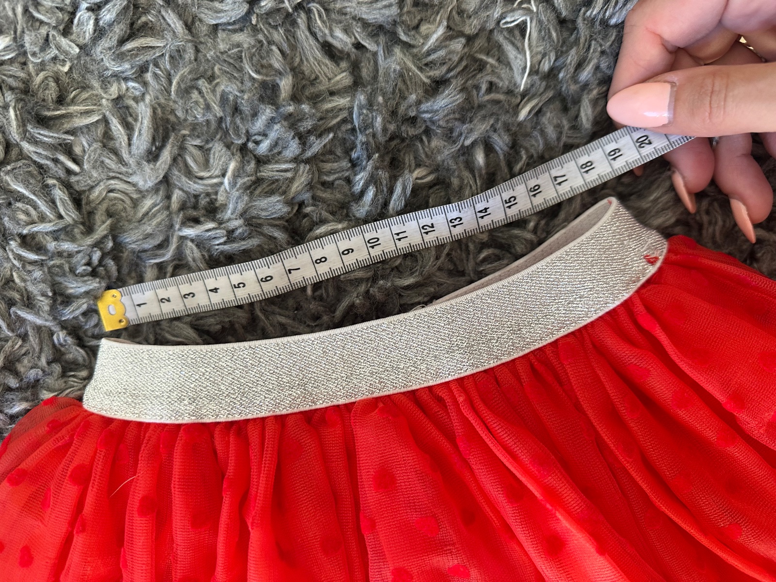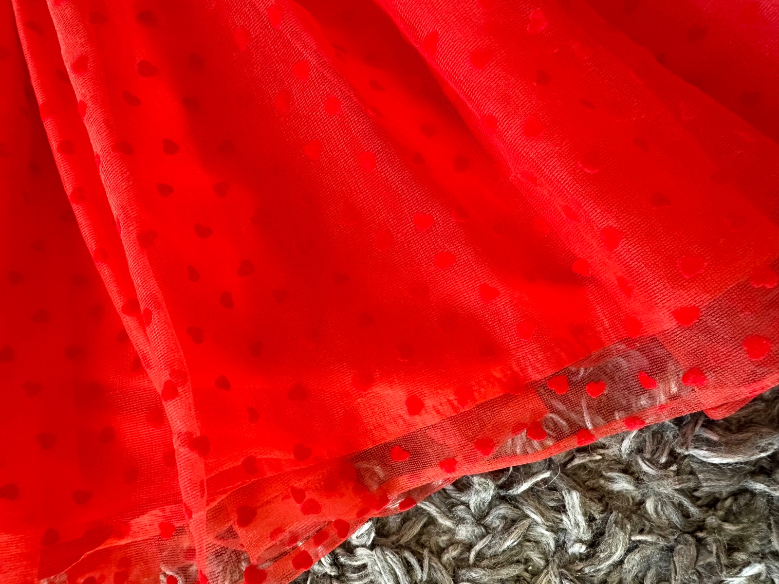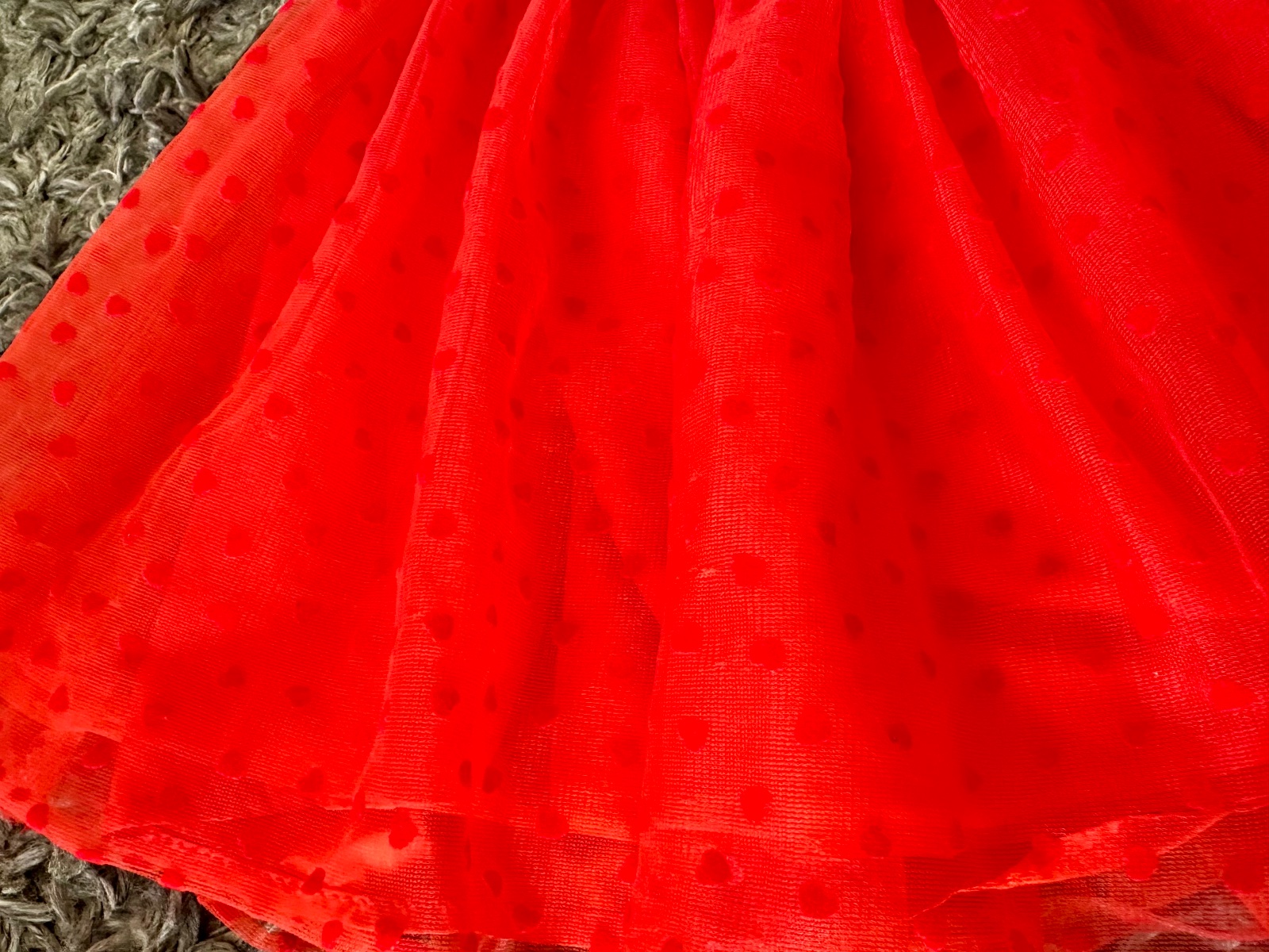 Nádherná jasno-červená tylová suknička so srdiečkami, so striebornou dostatočne naťahovacou gumou v páse. Veľkost písaná 110, my sme ju nosili od 4-8 rokov; treba si prizrieť len šírku pásu (nie je vhodná pre deti s plnším bruškom). Pri veľkosi 110 je pod kolená, moje dievčatá ju nosili ešte teraz na jesen (ked mali 7 a 8 rokov, 130 cm) a takto im bola nad kolená. Mám 2 velkosti - 110 a 116, obe sú v inzerátoch.