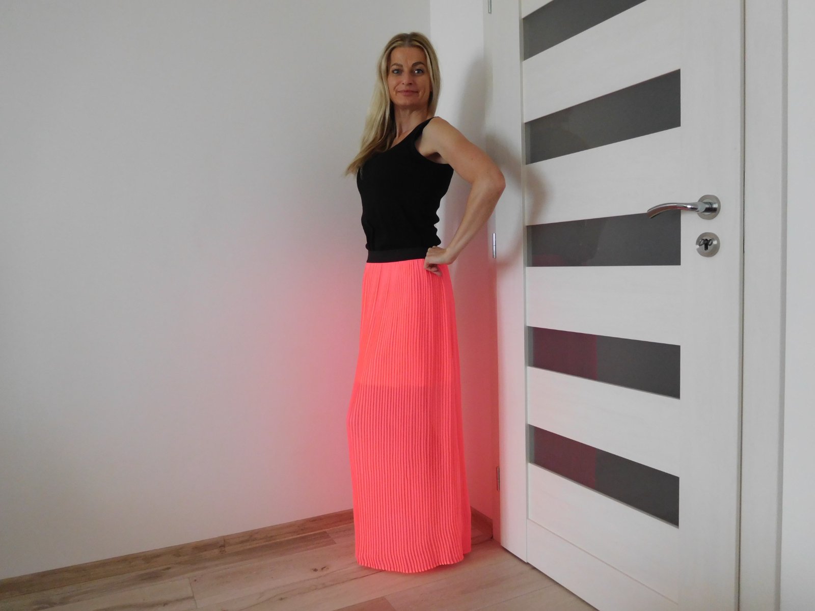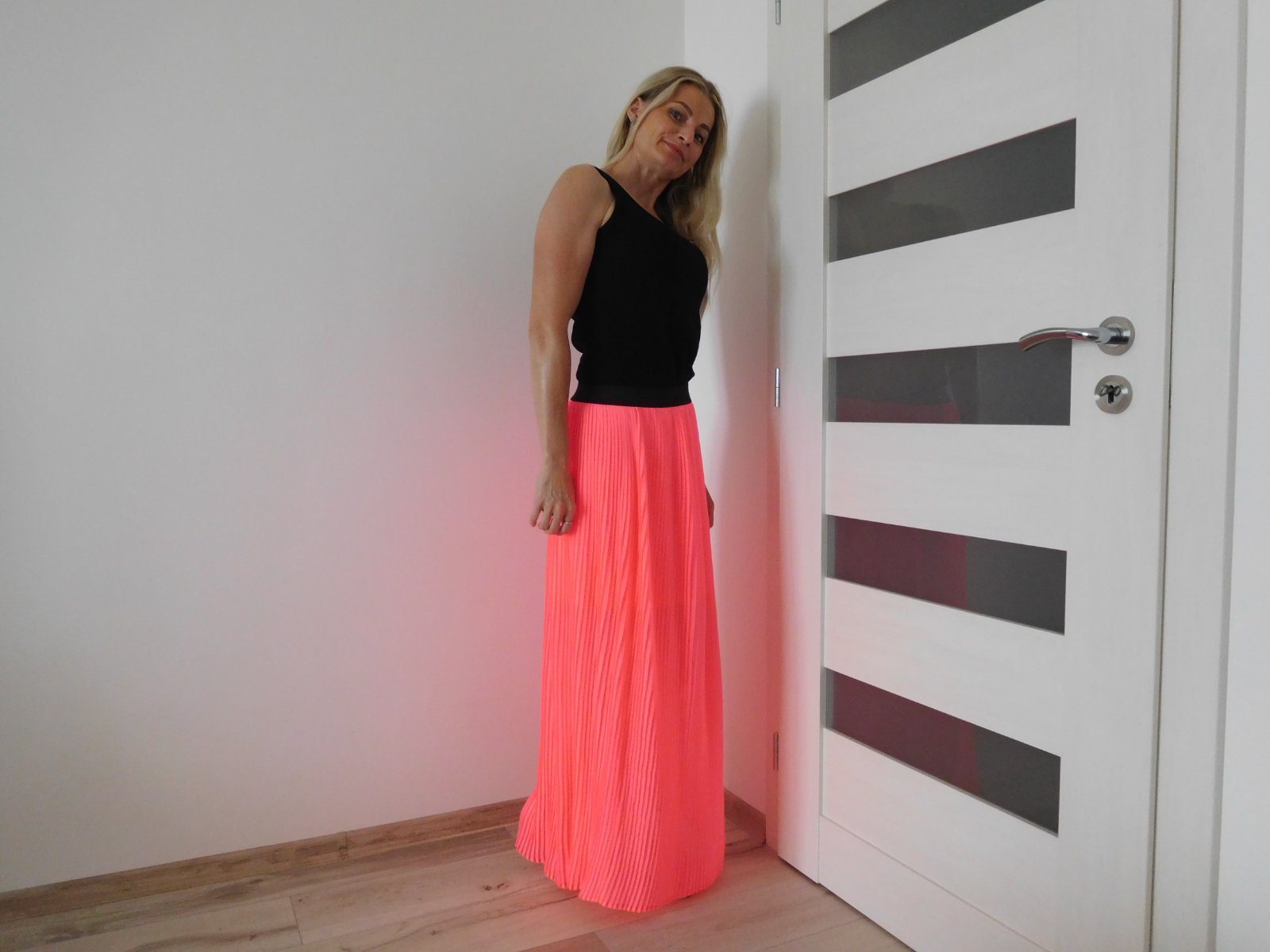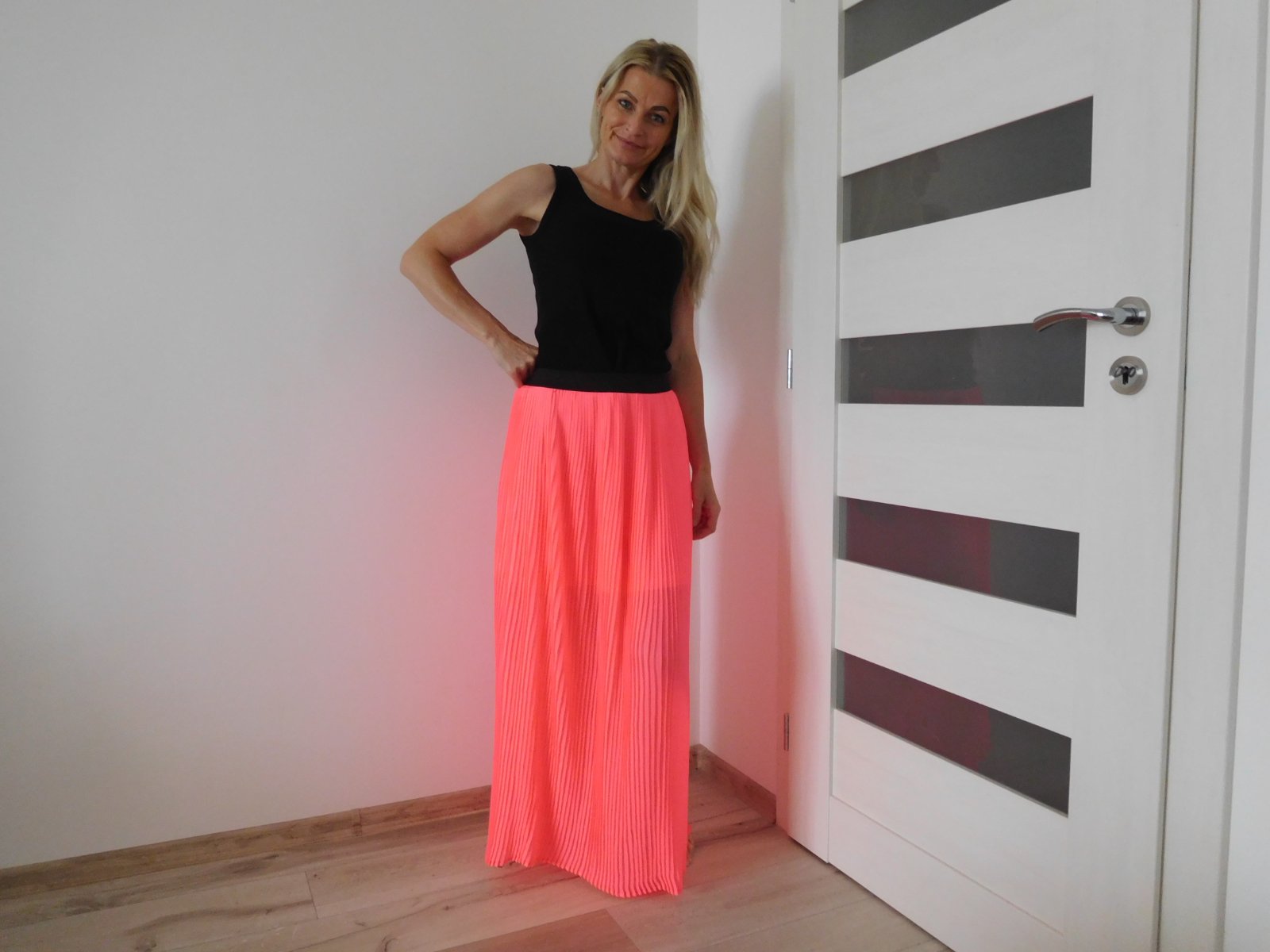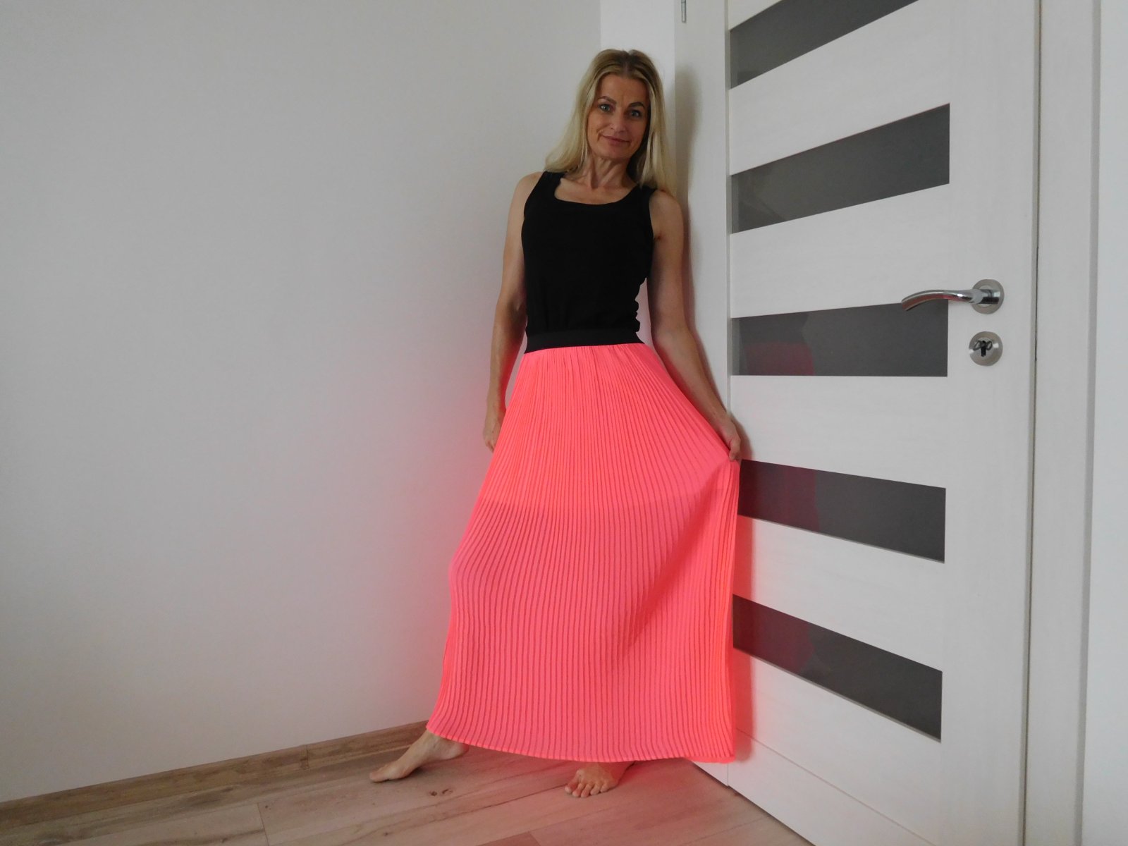 Dámska maxi sukňa zn. Jovonna London, veľ. S - rozmery: dĺžka sukne je 95cm, pás je 2x37cm. Sukňa je plisovaná, do dĺžky mini sukničky je podšitá. Farba je koralová - tmavšia lososová. Popis výrobc...