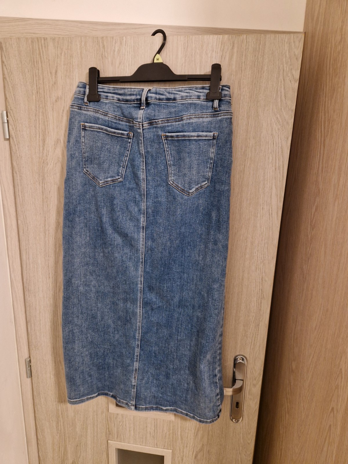 nenosena. velkost asi 40-42. uplne nova, ale mne mala. krasne biela a kvalitna riflovina. dole je biely napis, ktory ani nevidiet, je fakt perfektna. neolutujete