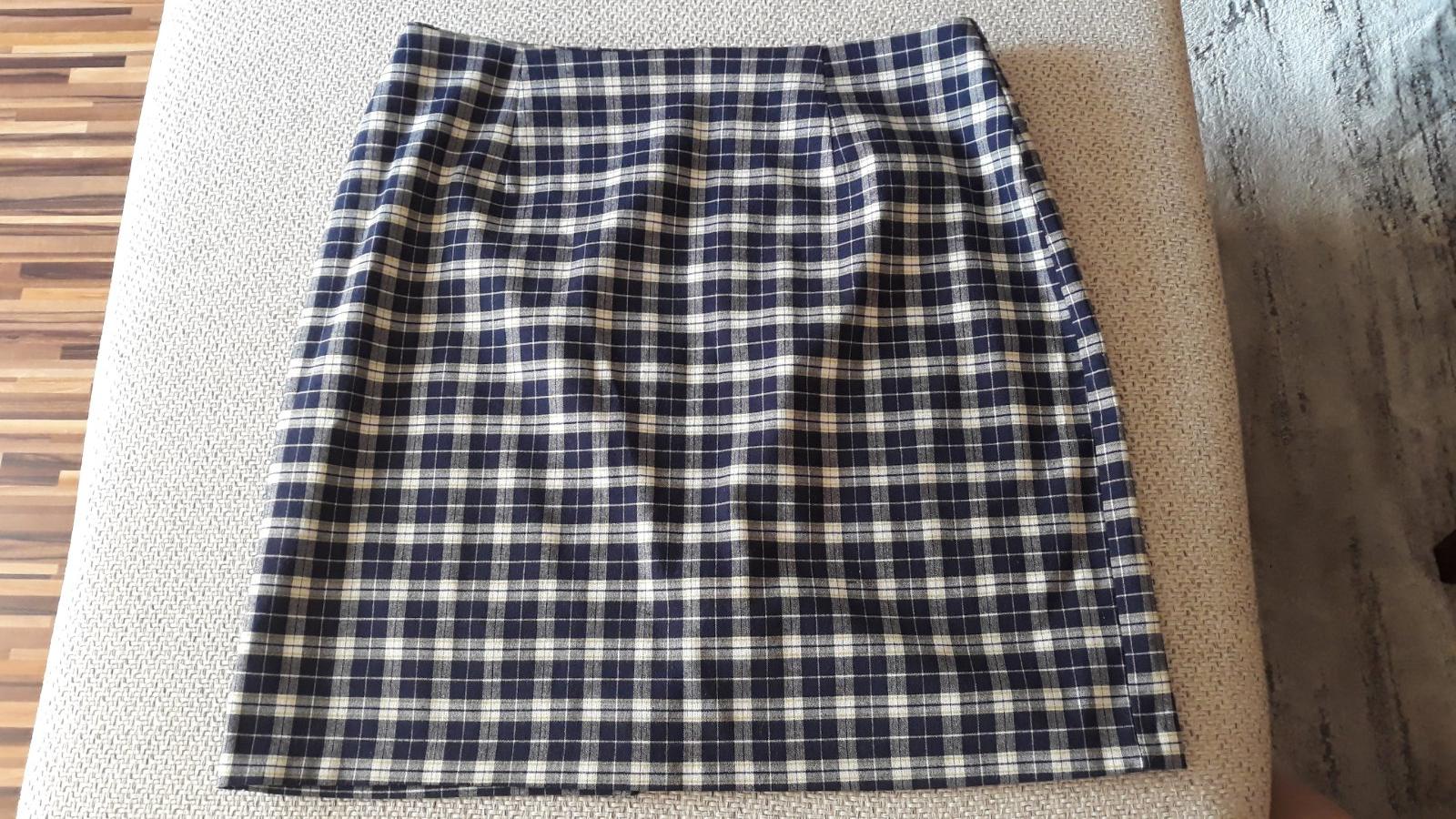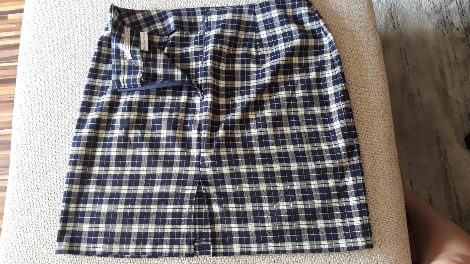 Strečová pohodlná sukňa minimálne nosená. Materiál: 63% polyester, 34% hodváb, 3% spandex. Zapínanie na zips, vzadu 12 cm rázporok.Rozmery: