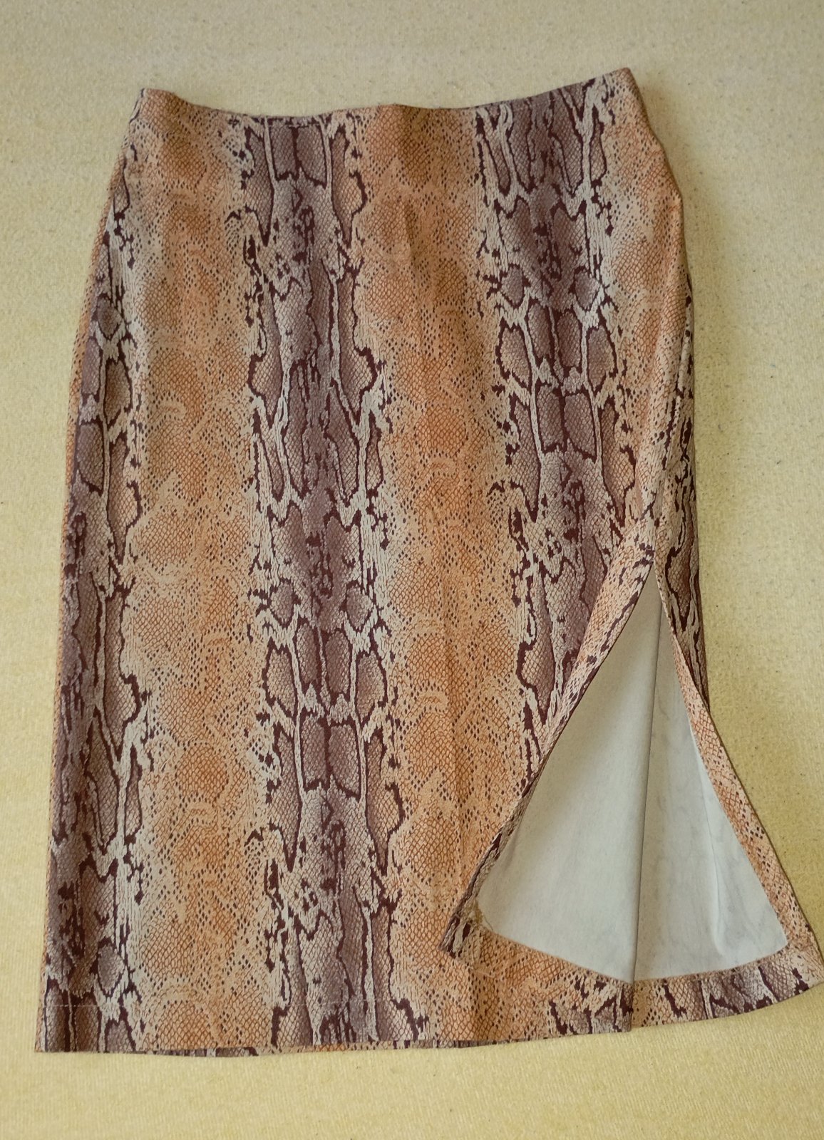 Bledo hnedá sukňa s hadím vzorom, rázporkom na jednej strane, vhodná na každodenné nosenie. Veľkosť S-M, dĺžka 57cm, pás 2x32cm.
