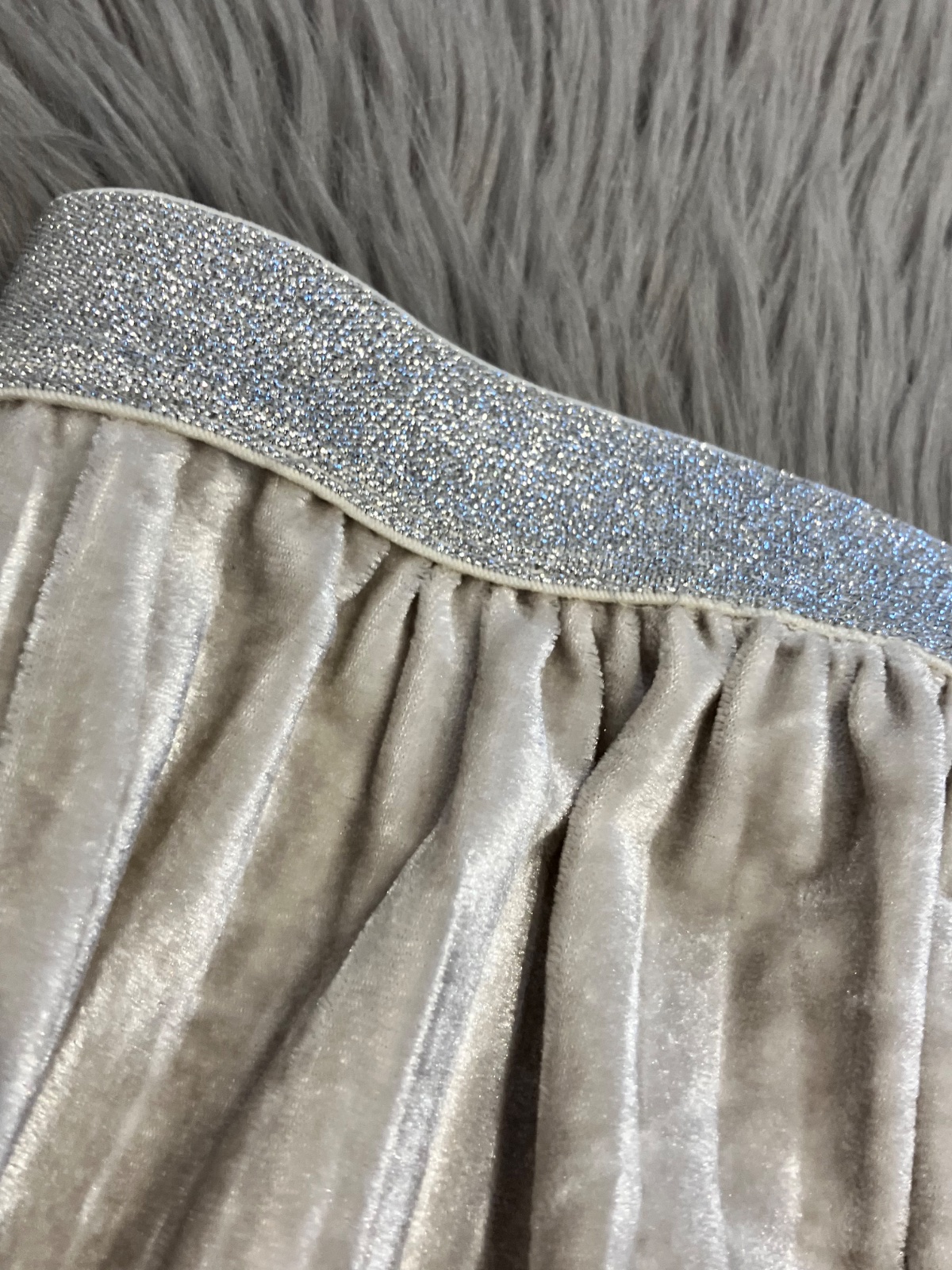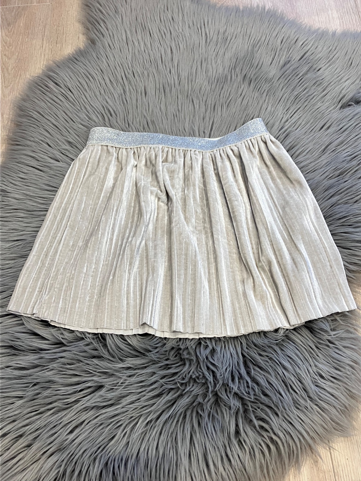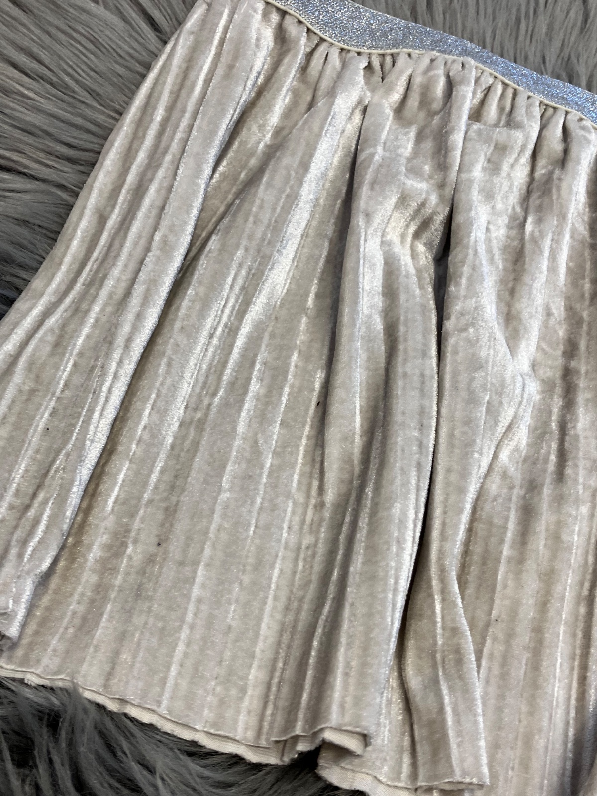 Dievčenská sukňa, tenká, plisovaná, áčková, lesklá, béžová so strieborným lesklým pásom, elastická, materiál 93%polyester 7%elastan.