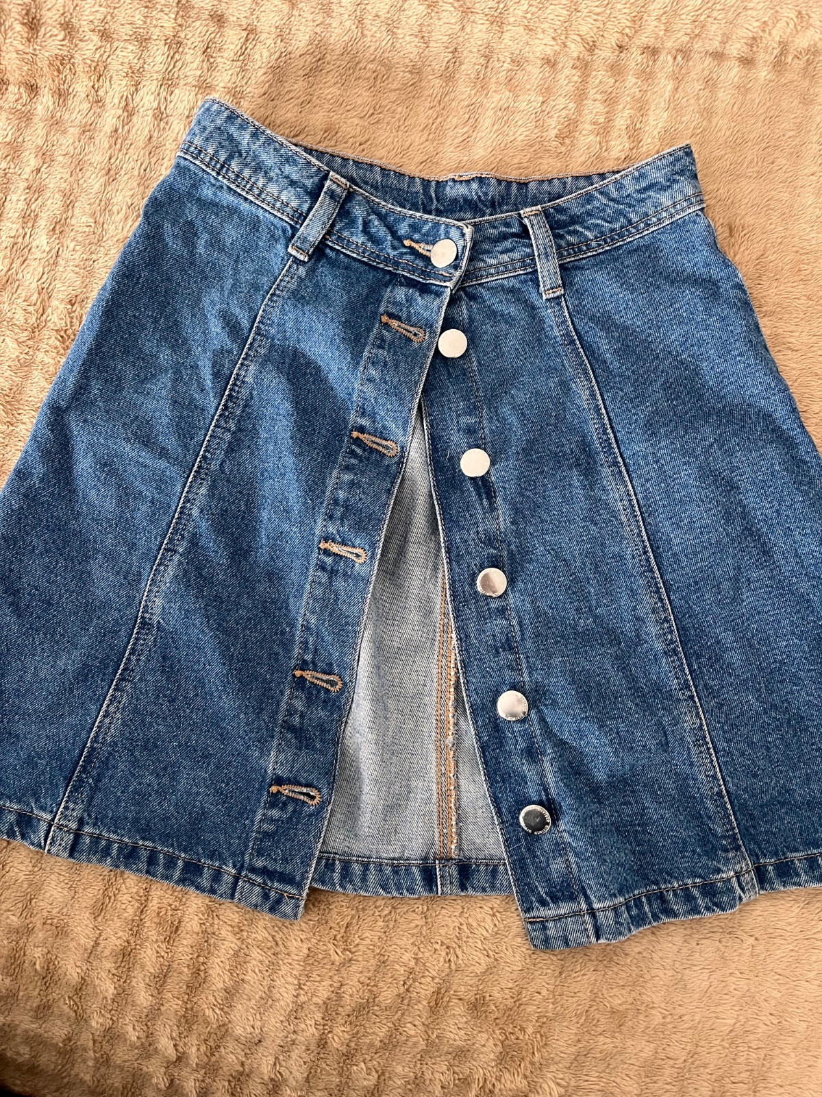 Bavlnená sukňa (nie riflová) je vo veľmi dobrom nosenom stave. Vpredu 2 vrecká + na boku ďalšie 2. V páse 32 cm, dĺžka 39 cm.