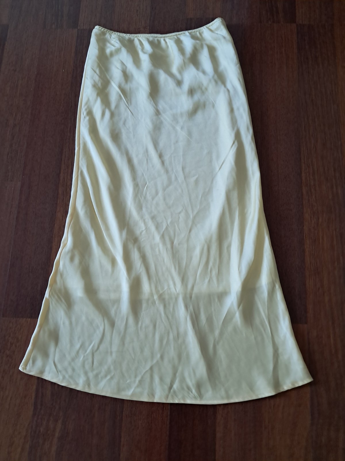 Satenova sukna žltej farby, podsita spodnickou, ako nová, v páse na gumu, rozmery: dl. 91cm, s. 36 cm vklude