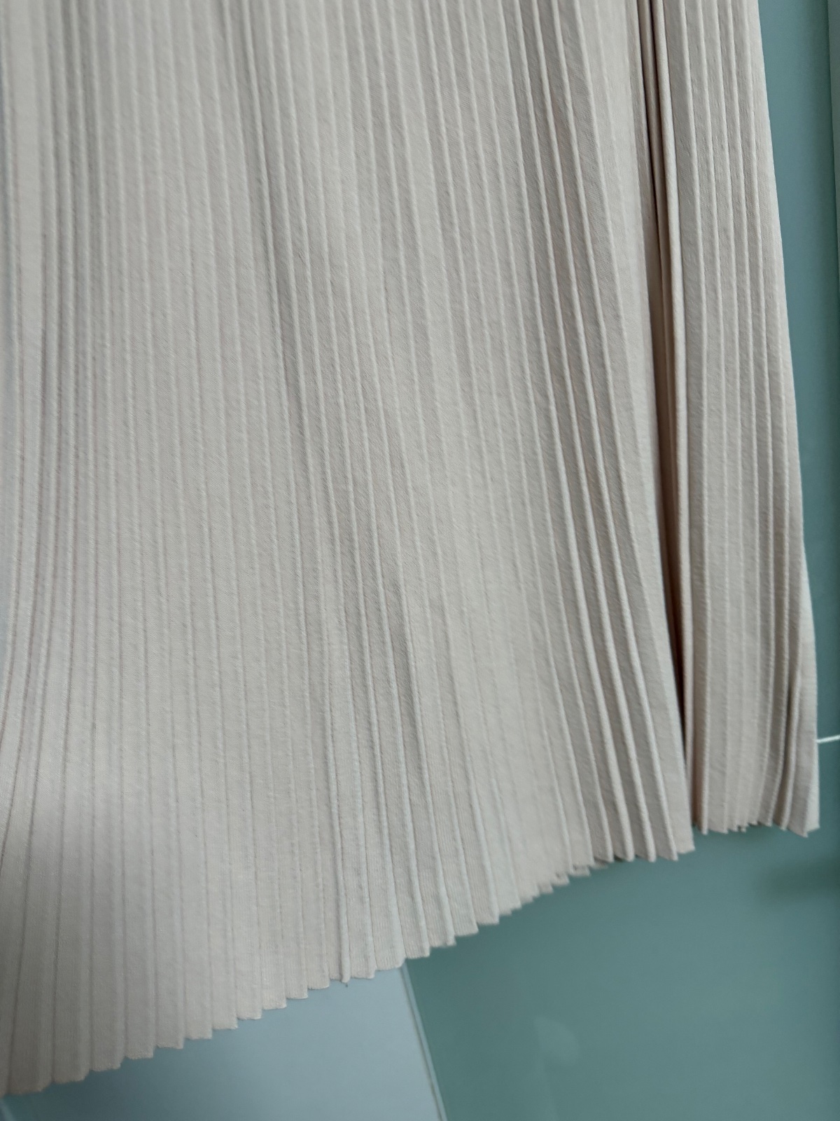 Predám elegantnú plisovanú sukňu Zara Knit v jemnej béžovej (nude) farbe. Sukňa je z príjemného pleteného materiálu, má elastický pás a pekne drží tvar. Vhodná na bežné nosenie aj elegantnejší outfit.Rozmery: dl.73, š.30-46