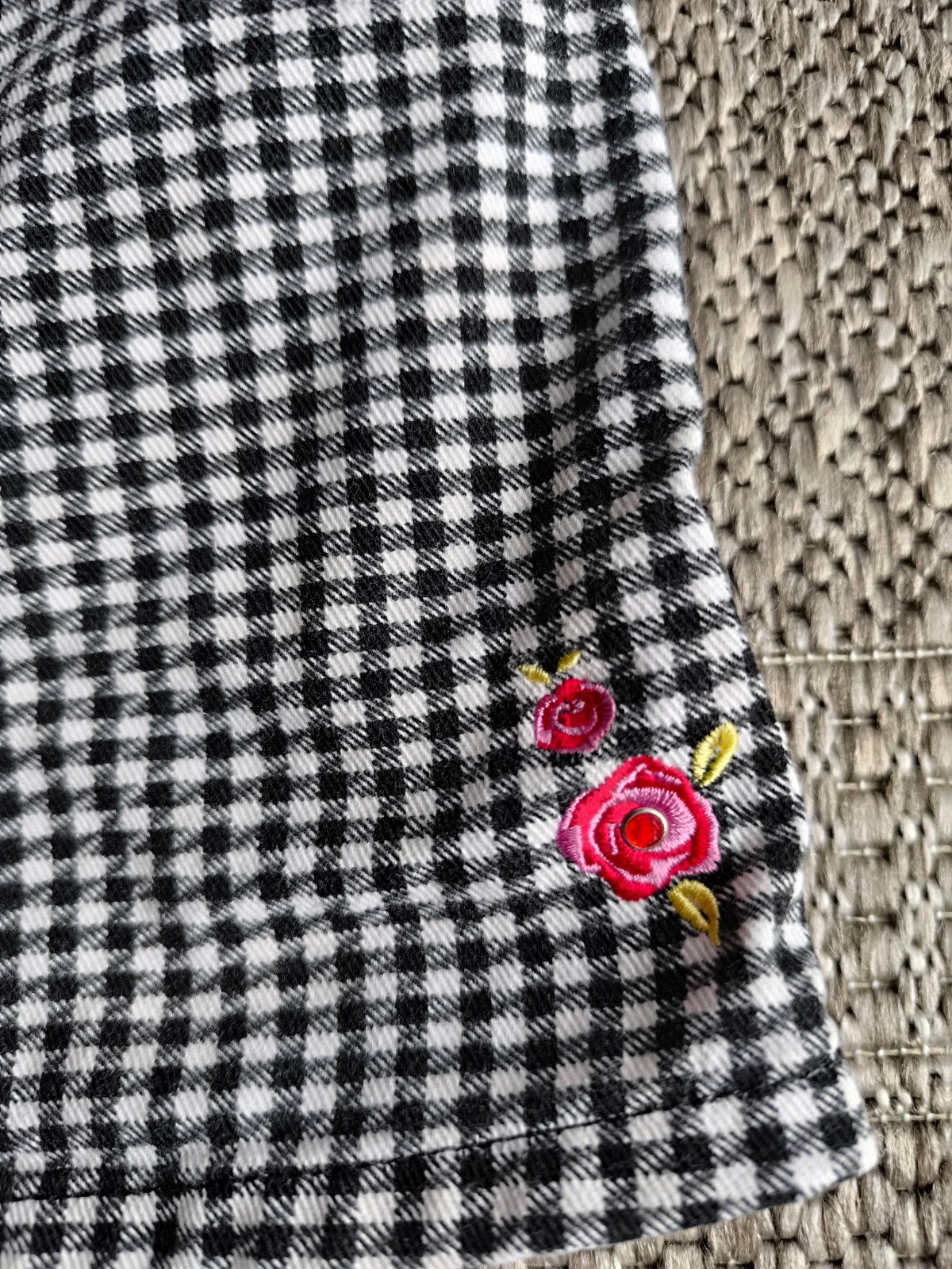 Rifľová, džínsová, jeansová, károvaná sukňa s výšivkou, v super stave. Má 2 vrecká, pútka na opasok. Zapínanie na zips a gombík. Veľkosť 134, 9 rokov. Materiál 100% bavlna. Šírka v páse 28cm až max. 36cm(je tam guma, dobre sa prispôsobí), cez boky max. 43cm, dĺžka 37cm.