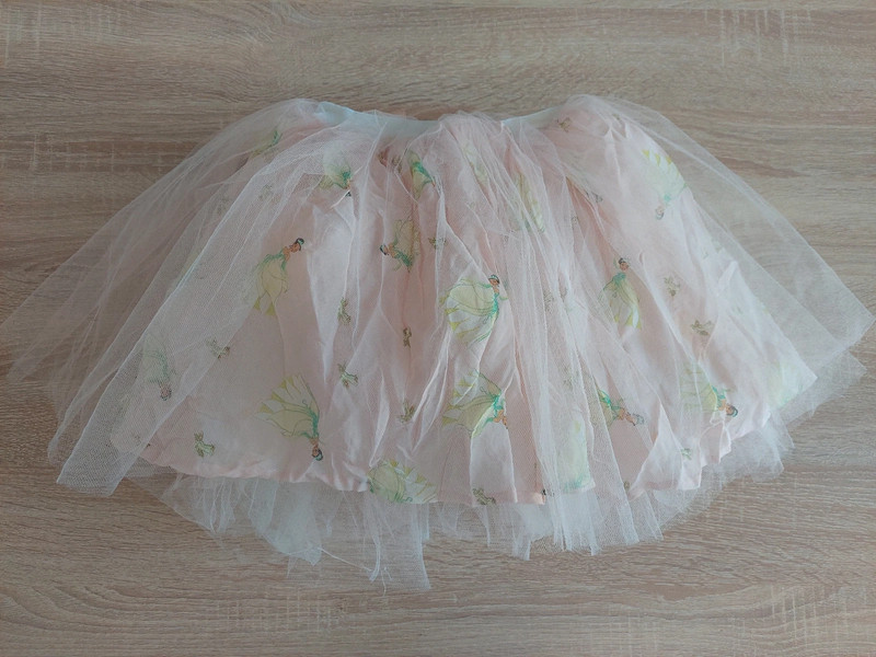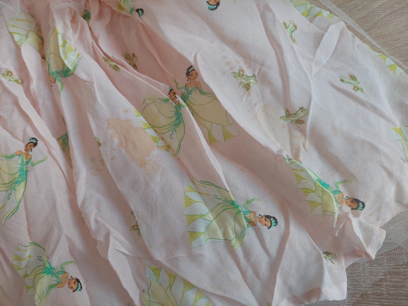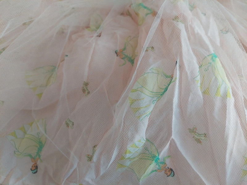 Stav: pekný nosený stav, suknička je na látke s obrázkom na jednom boku ušpinená (neskúšala som prať - zohľadnené v cene). V páse guma + viaže sa stuhou na mašľu. Sukňu tvoria 3 vrstvy jemného tylu, farebná látka s motívom žabieho princa a princeznej a vrchná vrstva jemného tylu. 5-vrstvová suknička, bohato nazberkaná.