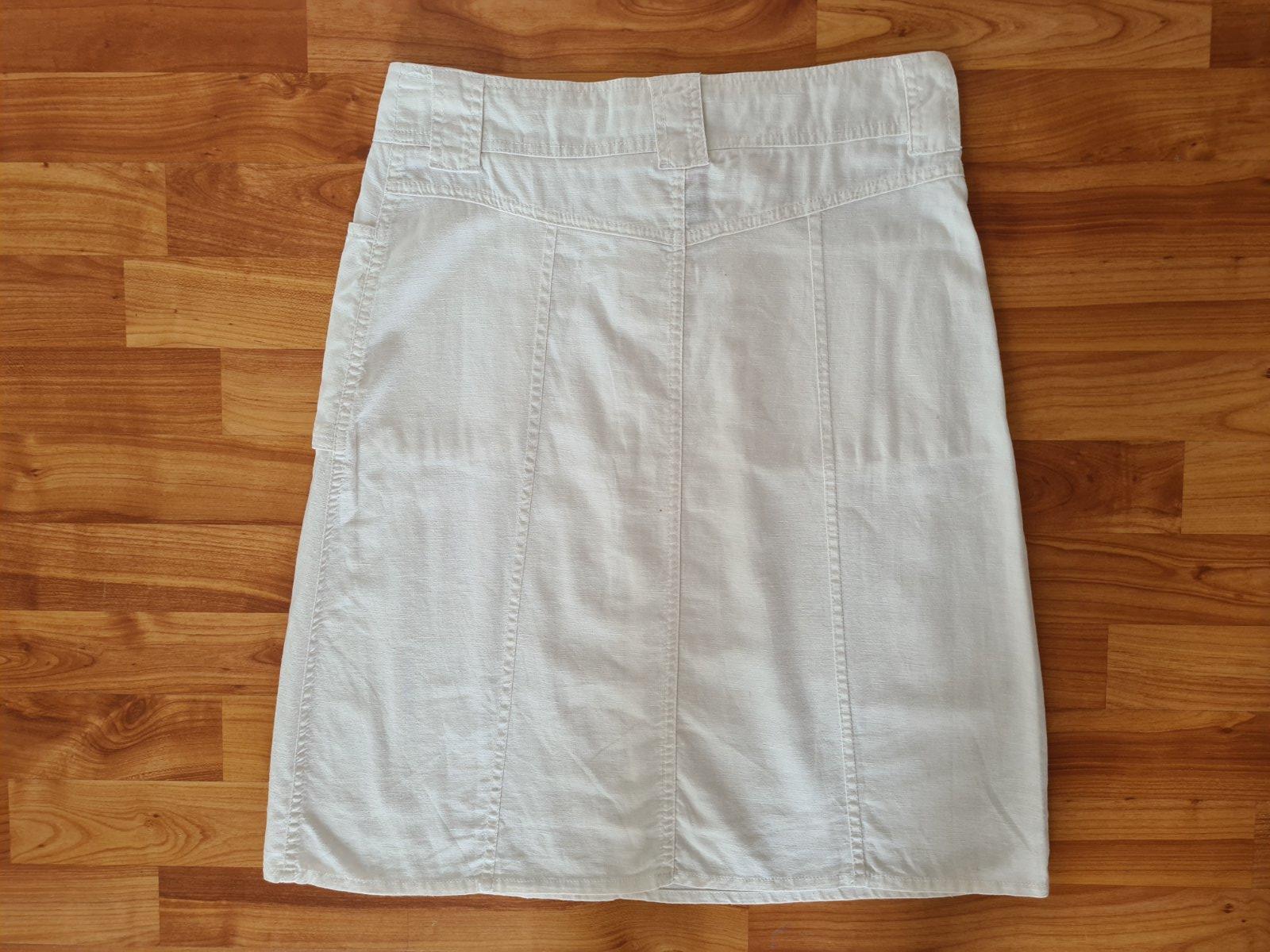 dámska biela elastická jeansová krátka sukňa,vrecká, príjemný kvalitný materiál zloženie: 98 % bavlna, 2 % elastan, stav: výborný, málo nosený, uvádzaná veľkosť na štítku 40, zodpovedá veľkosti M...