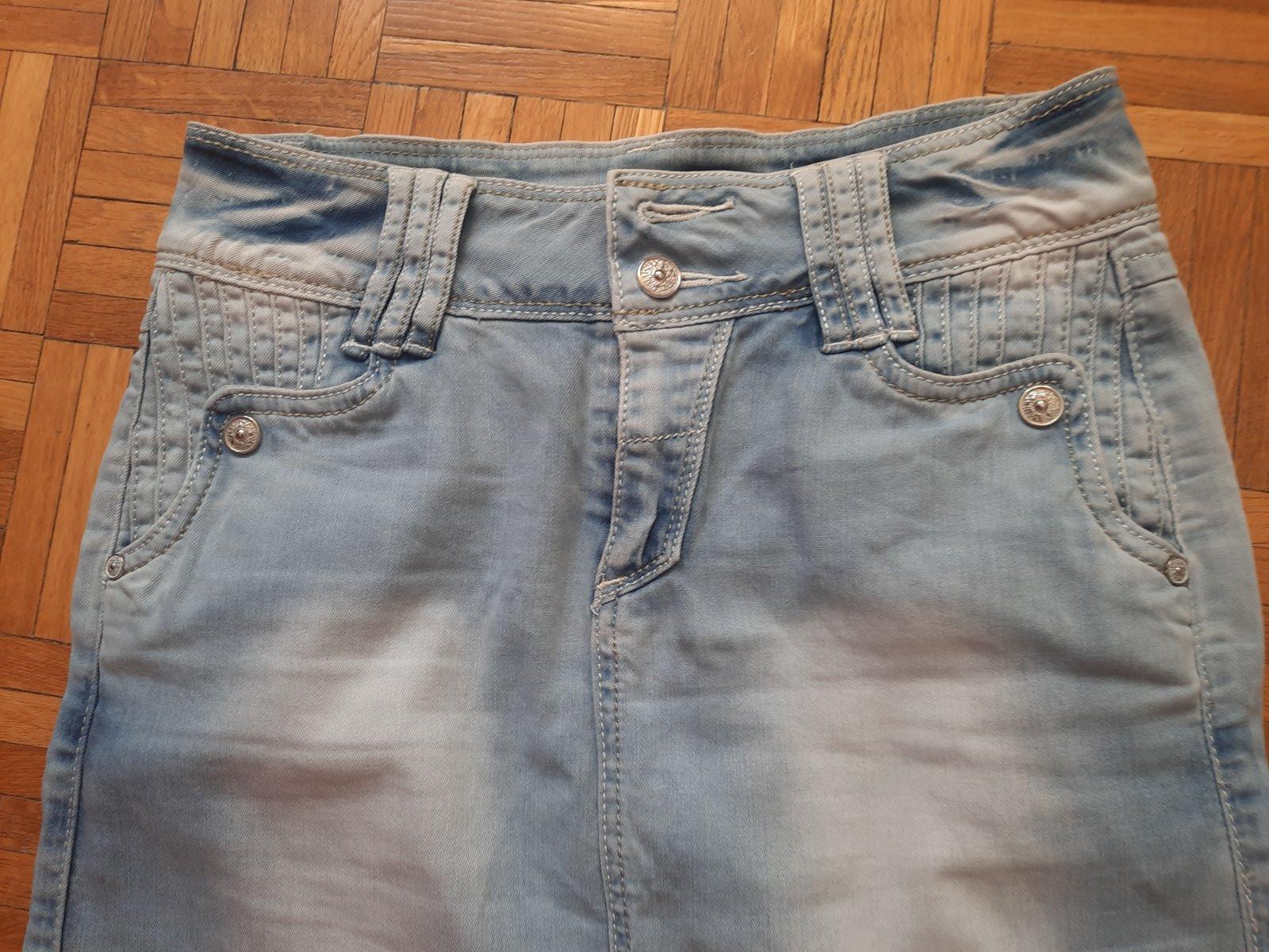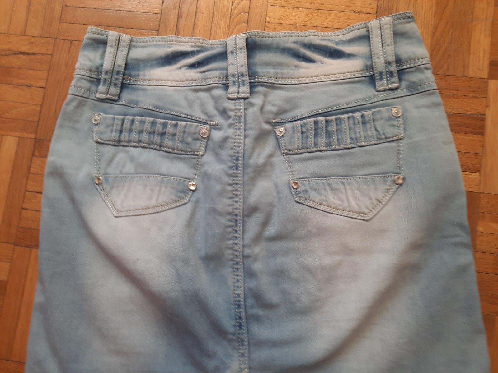 Super rifľová sukňa vyšúchaného vzhľadu. Je elastická, nie je hrubá. Vačky sú vpredu aj vzadu. Veľkostne sedí na S aj menšie M.
