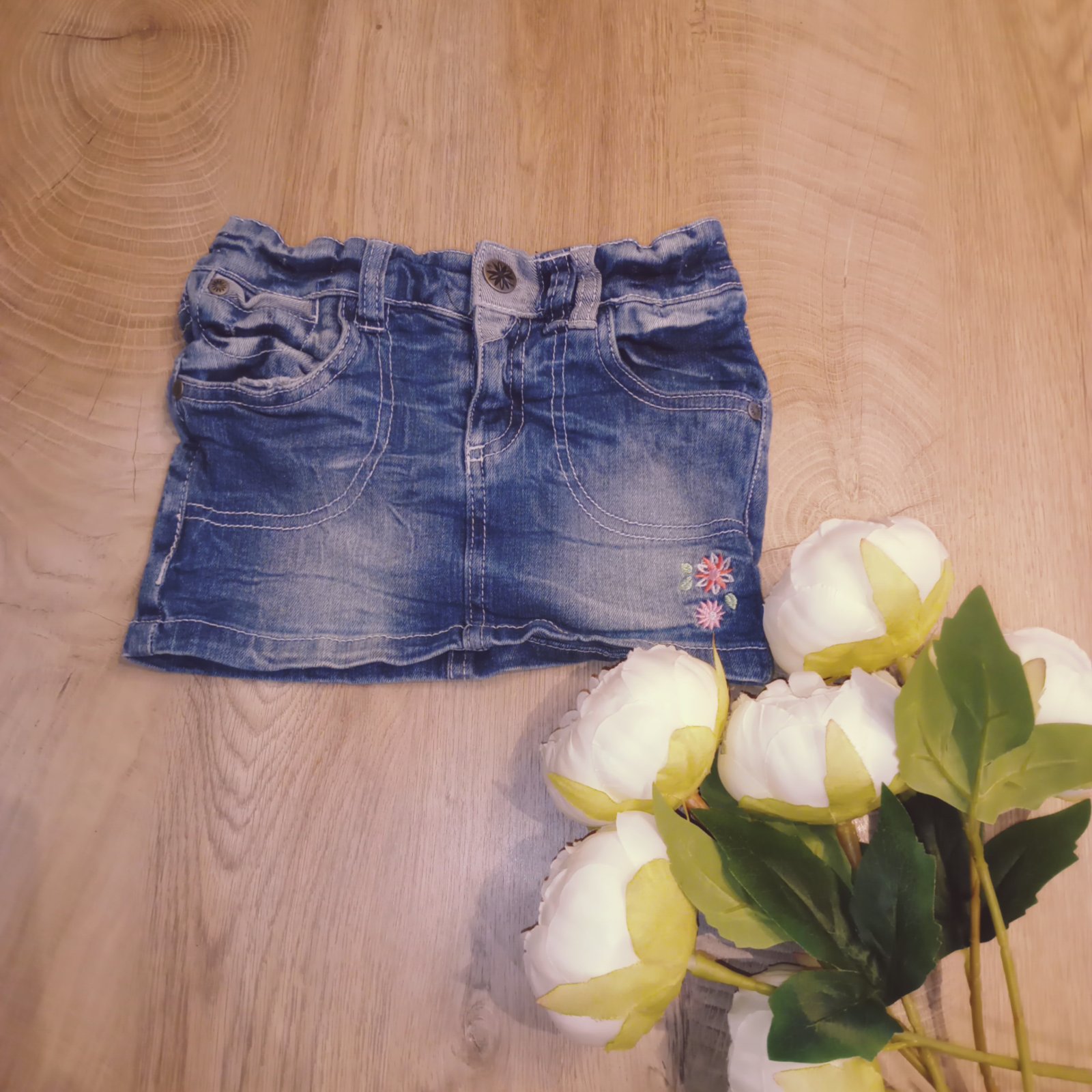 Krásna suknička z tenšej rifľoviny, vhodná na leto. V páse je rugulovateľná gumička. Kupovaná bola spolu s tričkami (viď foto). V prípade záujmu o tričká, je cena za kus 3 €.