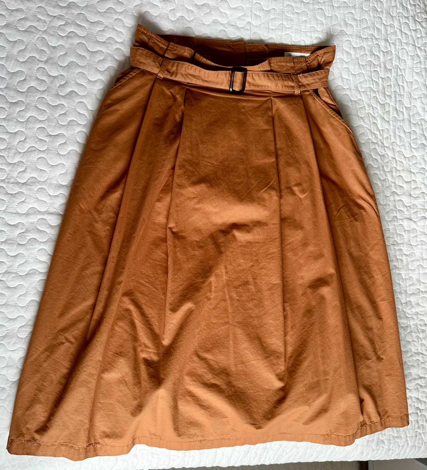 Krásna sukňa horčicovej farbe, v top stave. Na boku má vrecká, v zadu zips a má aj opasok.