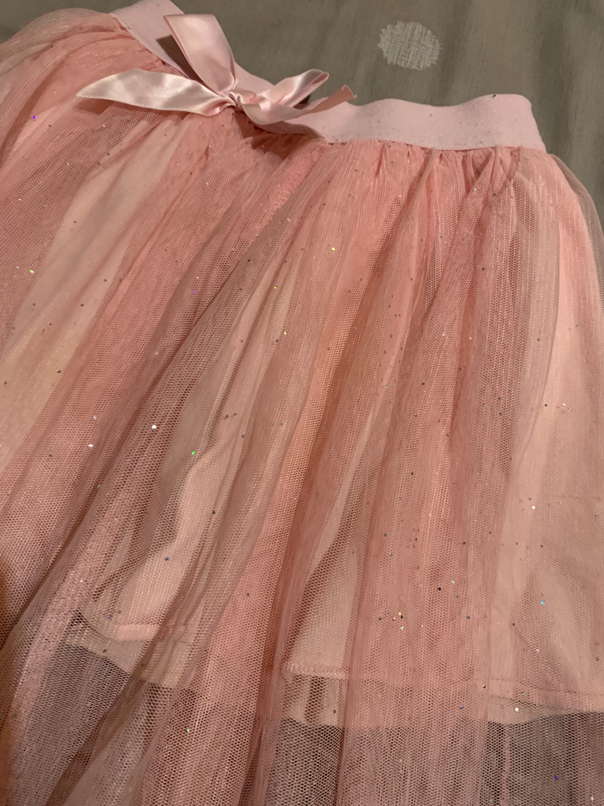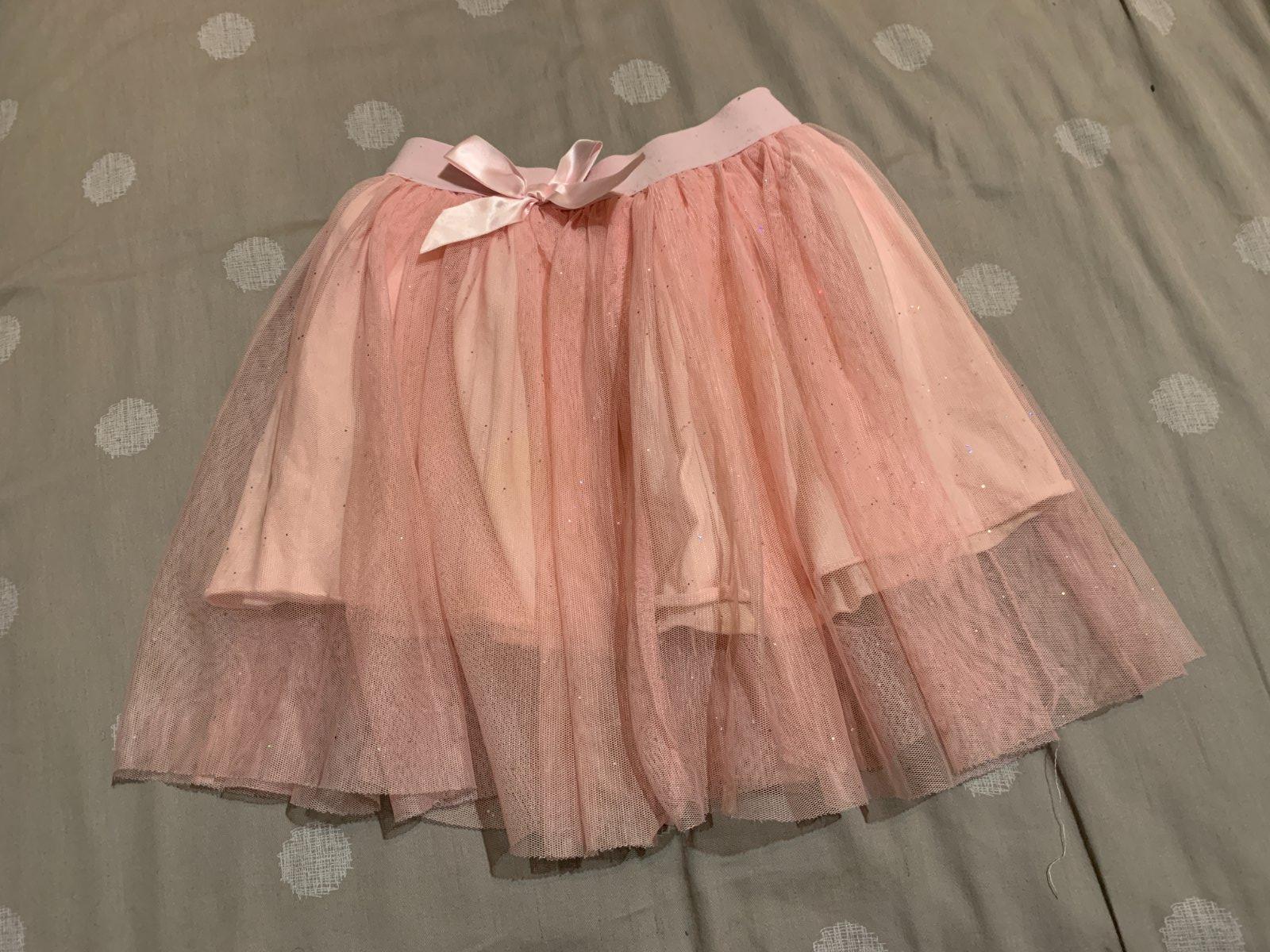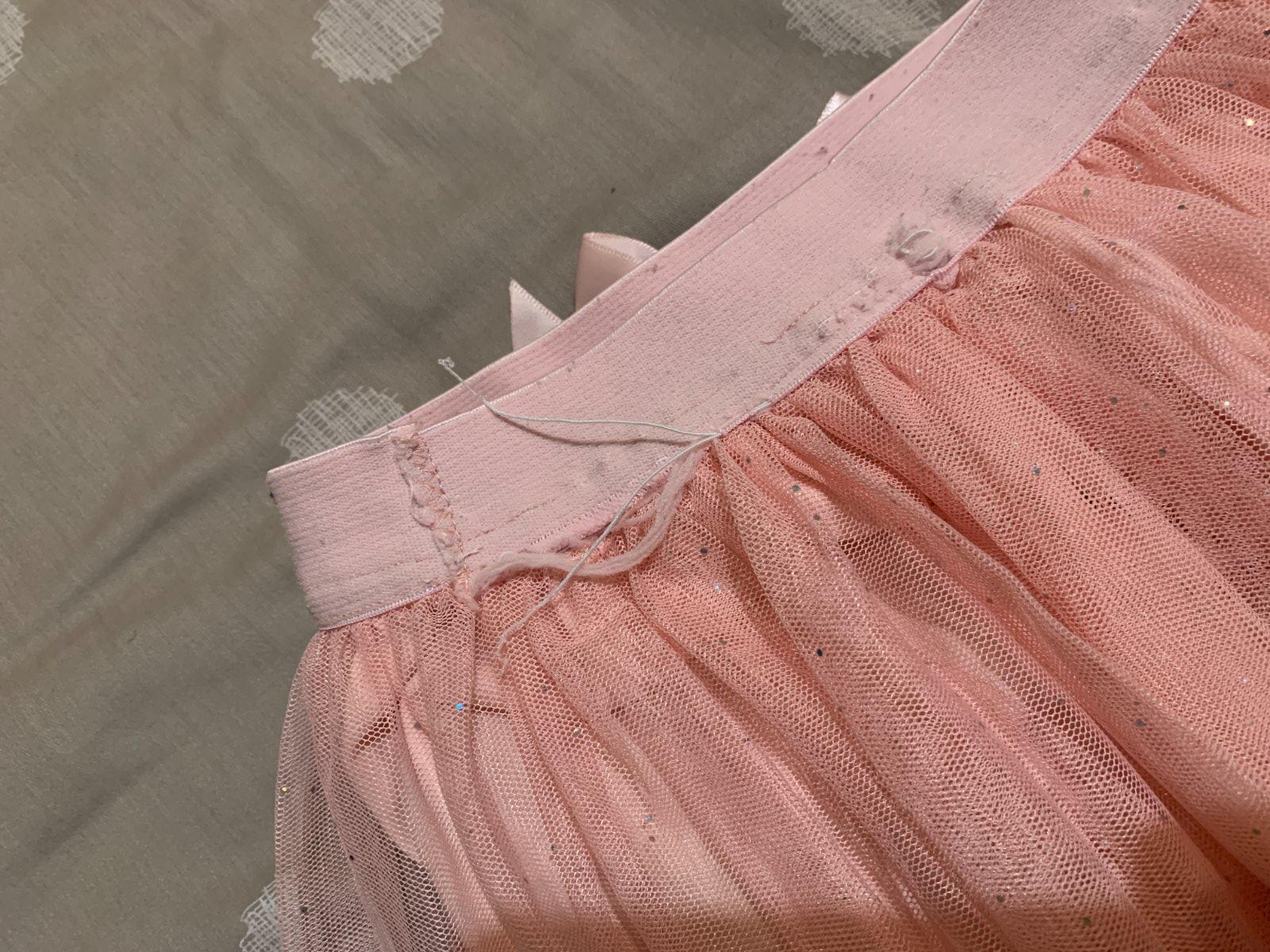 Tylová suknička, vzadu na páse na kúsku odpáraná, ale šikovná mamina si s tým poradí. Resp. na hranie ani možno nevadí. Veľkosť kľudne až 110.