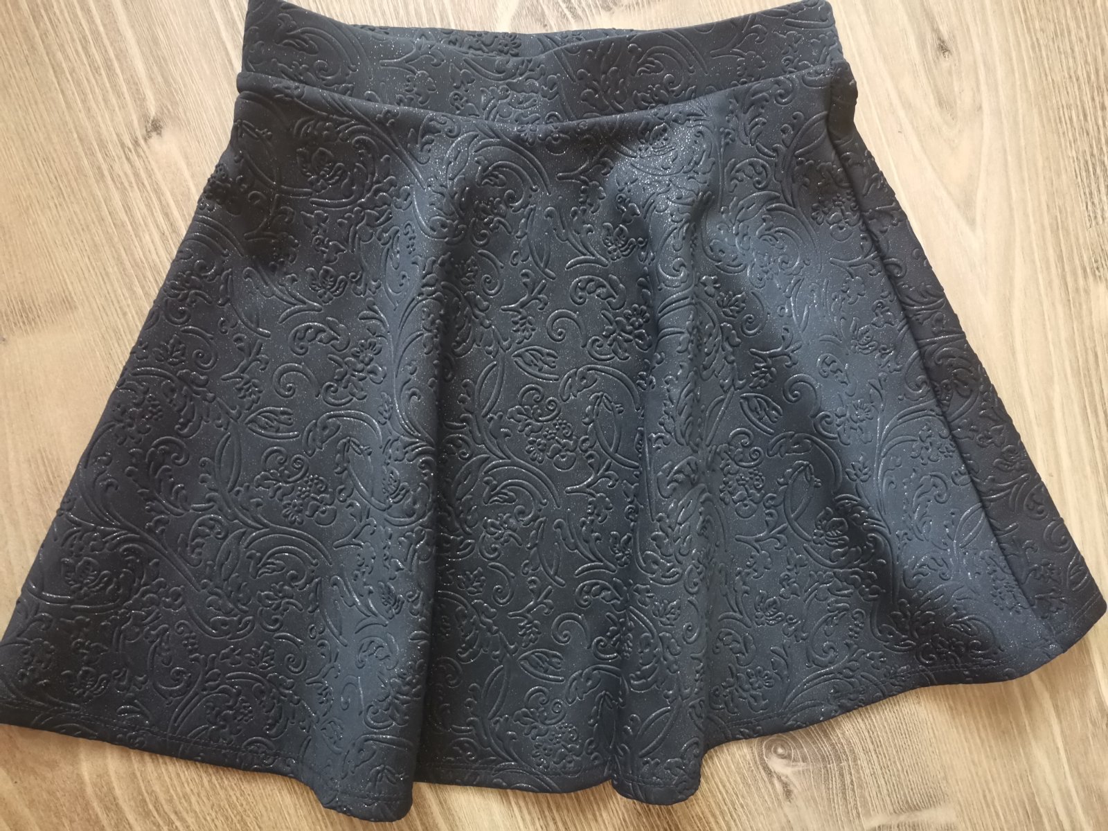 Top stav, čierna sukňa s reliéfnym vzorom s jemnými trblietkami zlatej farby, neotláčajú sa a neopadávajú, na bežný deň i príležitosť. Detské číslo, asi tak XS.