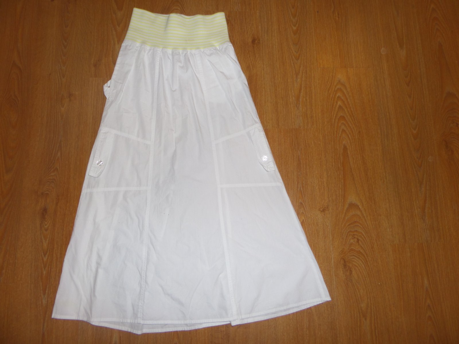 Pekná biela sukňa s miernymi trblietkami, nie veľmi lesklá, vhodná na letné dni či dovolenku, oblečená párkrát na dovolenke, bez poškodení, sedí na veľ.40/42, možno aj viac, má v páse gumu.