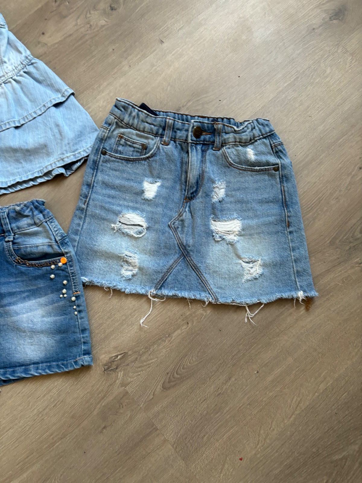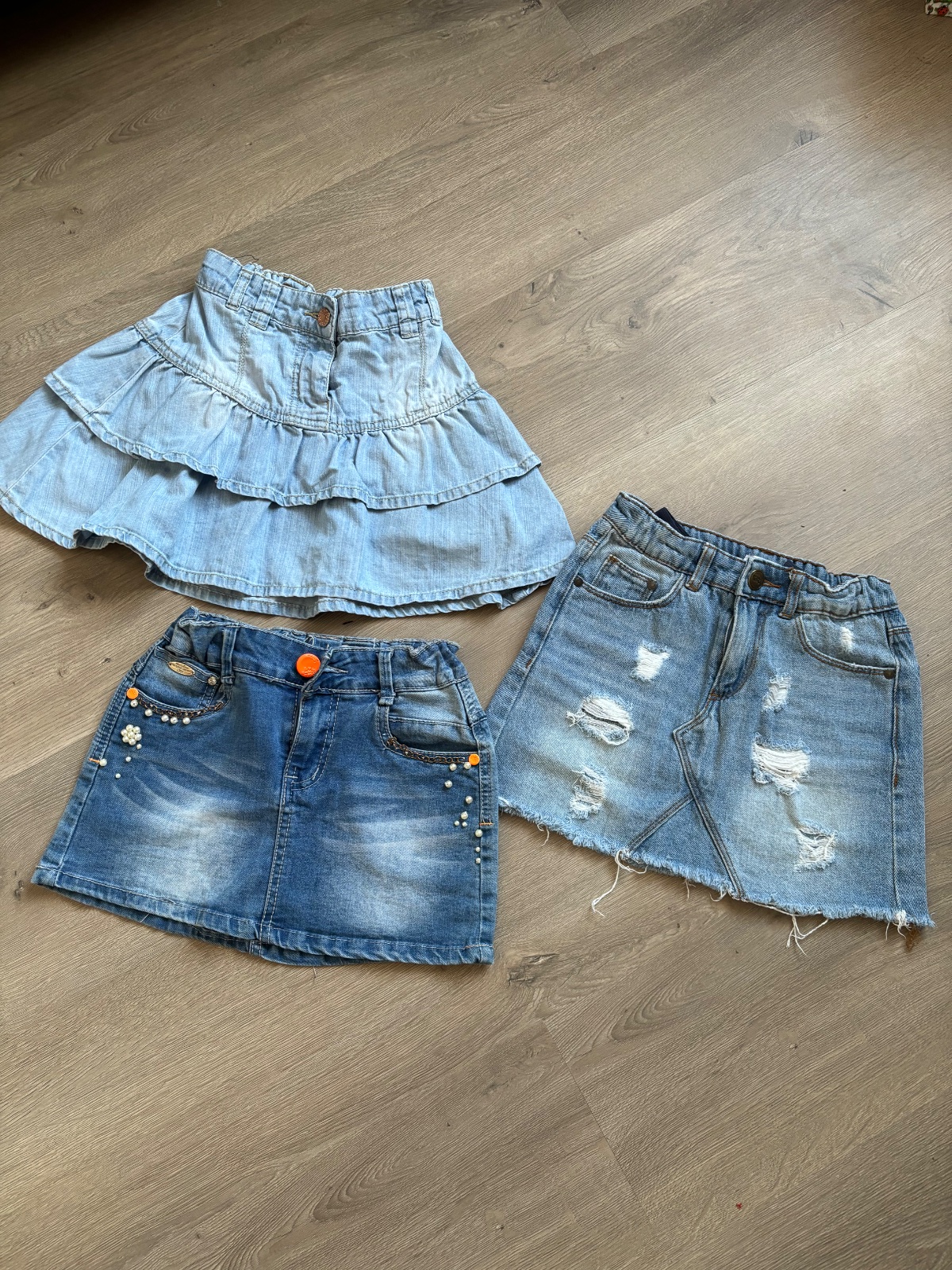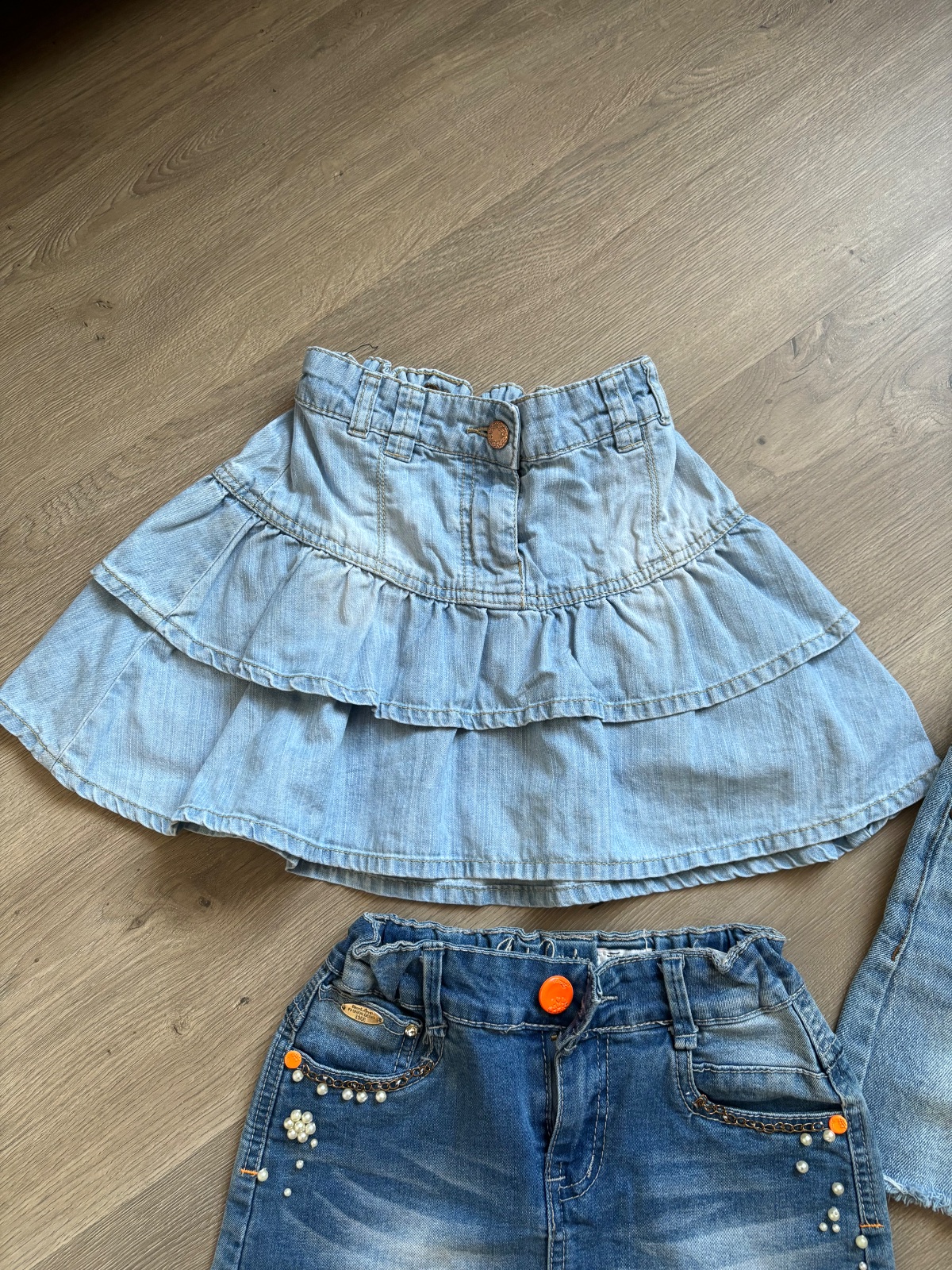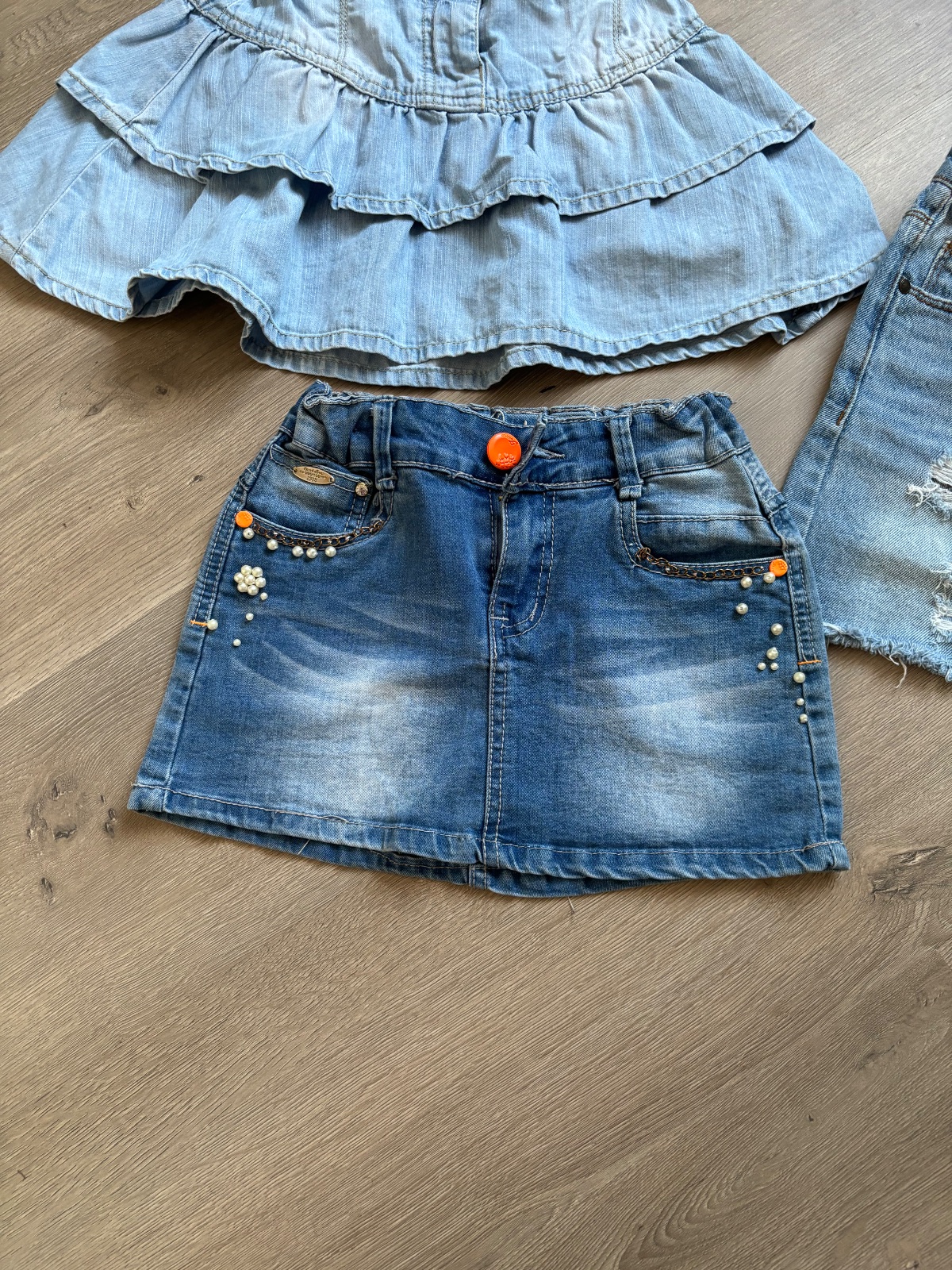 Roztomilá bodkovaná riflová suknička s volánom Raz oblečená, nestihli sme vynosiť Vel.uvedená 134, celková dĺžka 34cm, pás je nastaviteľný na gombíkovú gumu, max 2x30cm Top stav ako nová Zdarma p...