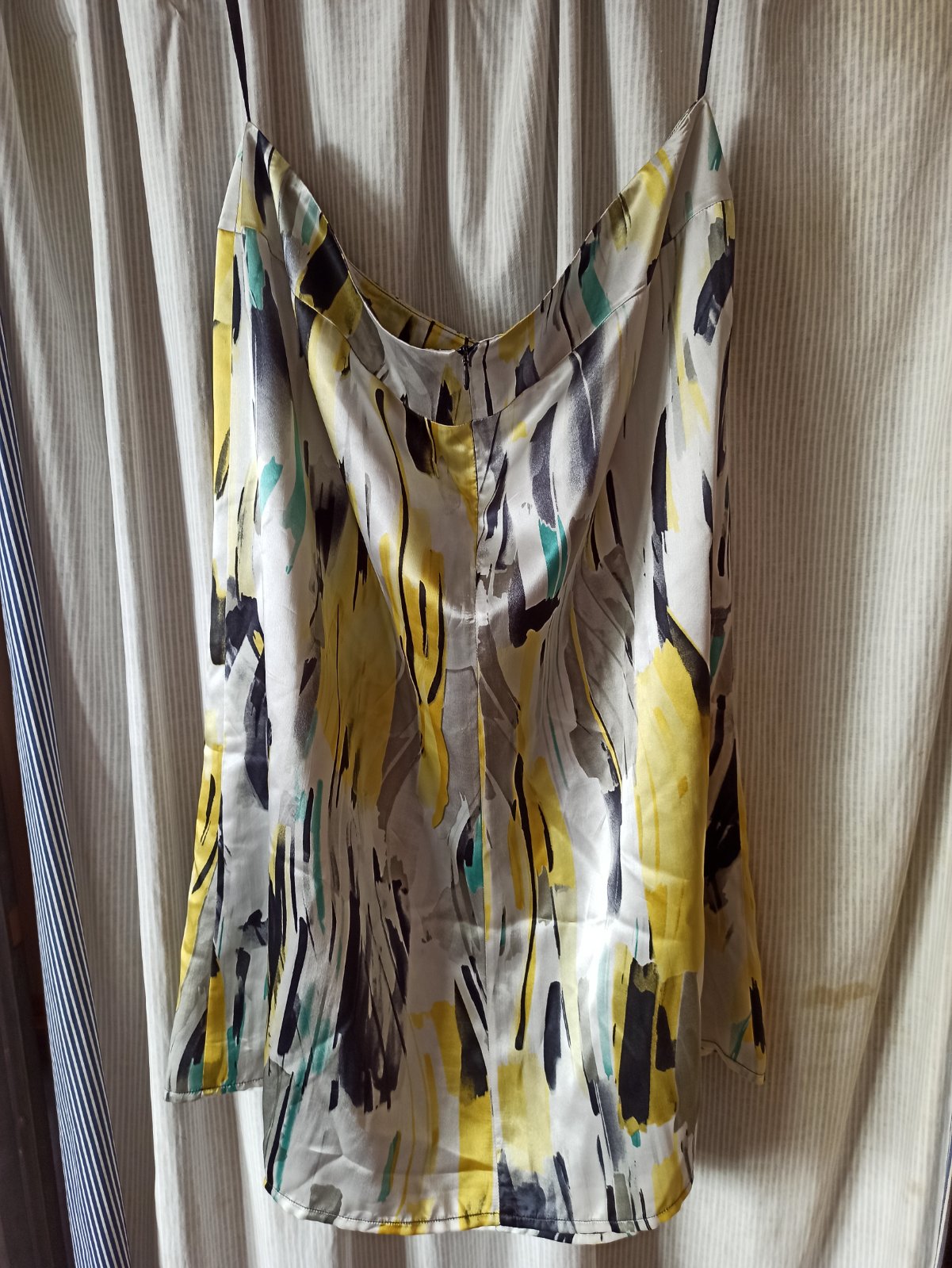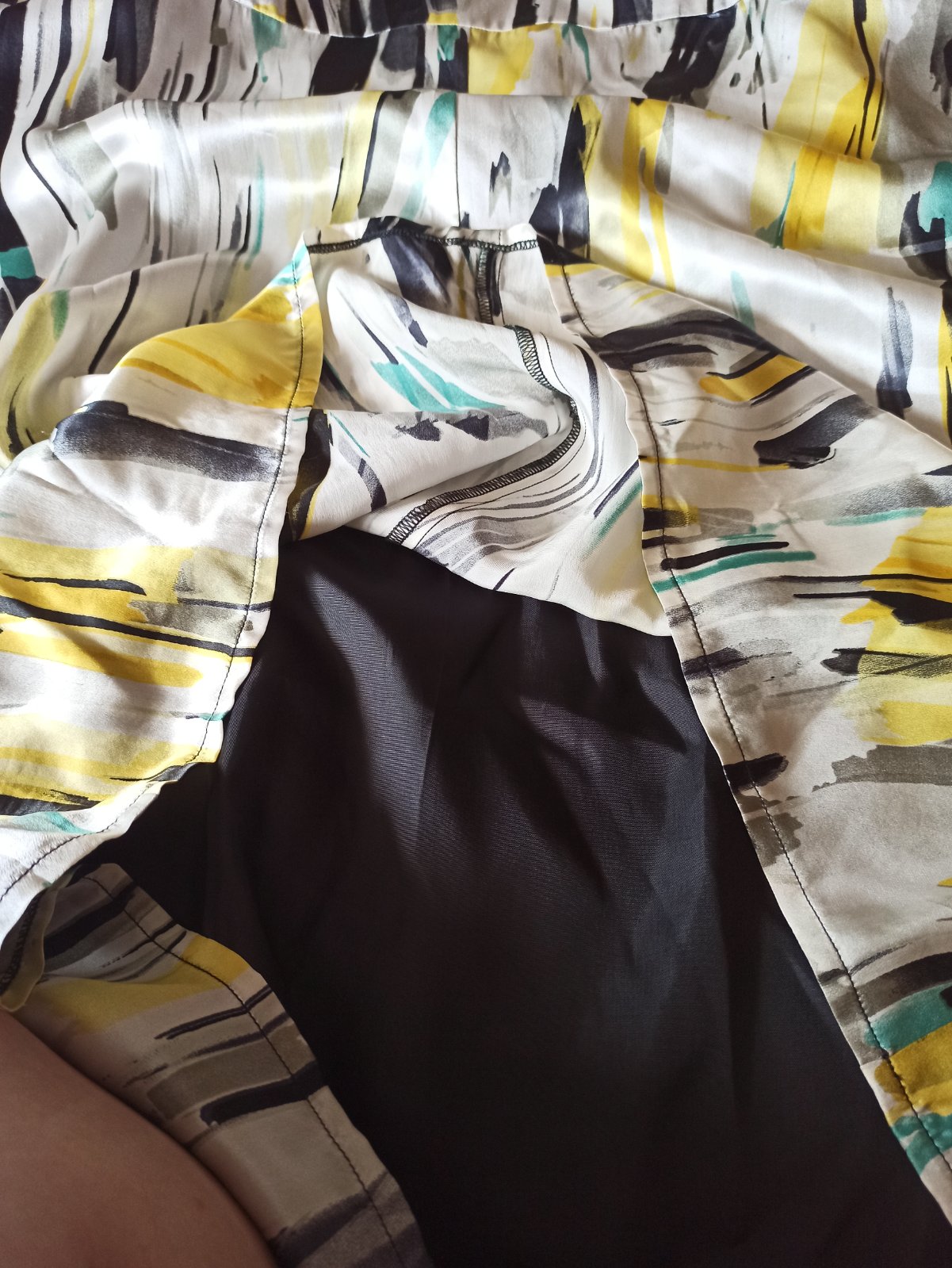 Pás 52x2cm, malo nosena, ľahký, vzdušný materiál,dlzka69 cm, látka akoby jemný satén, nenatajuje sa, vzadu zips, spodnicka cierna, veľkosť 48, písaná aj veľkosť 20