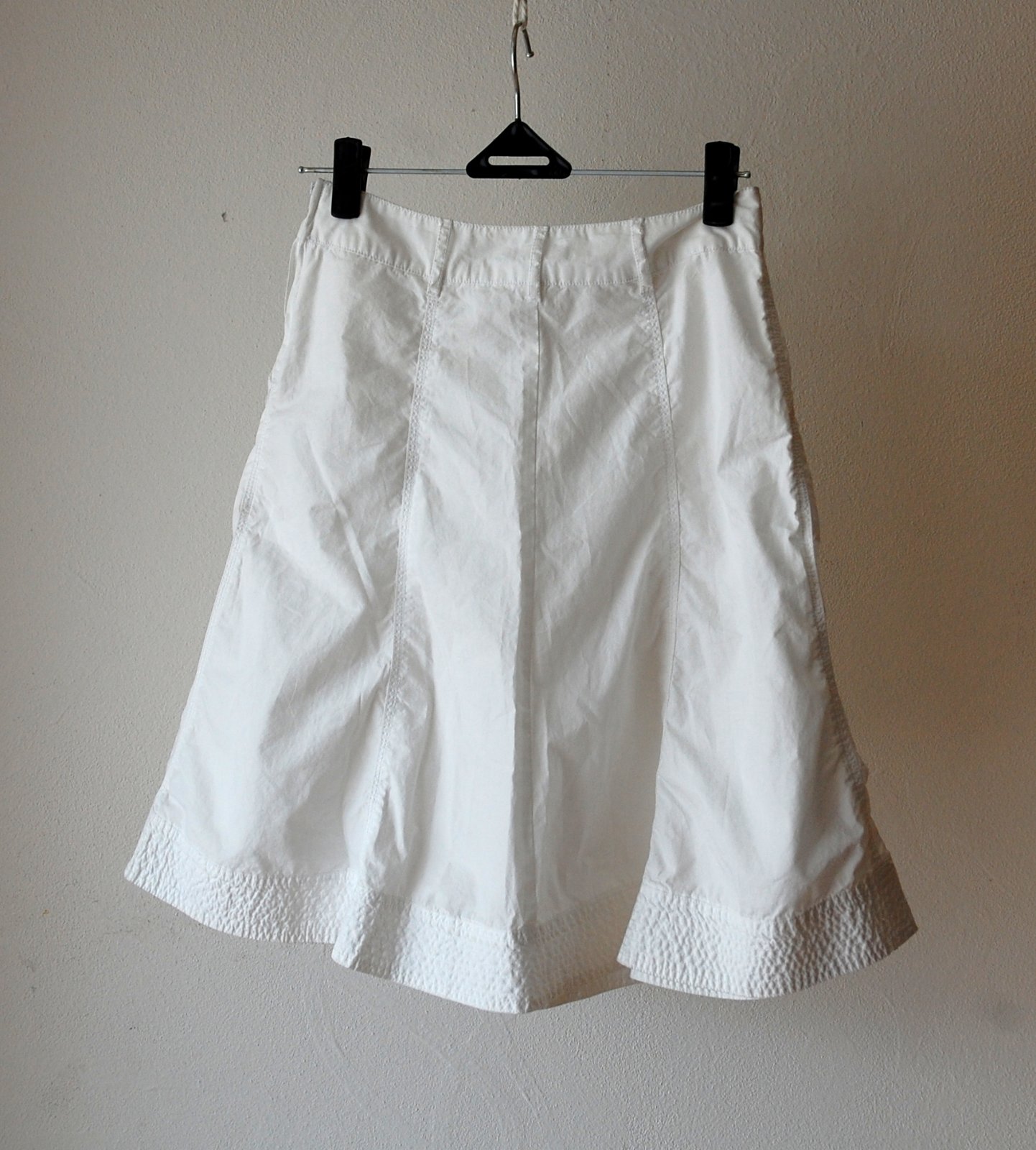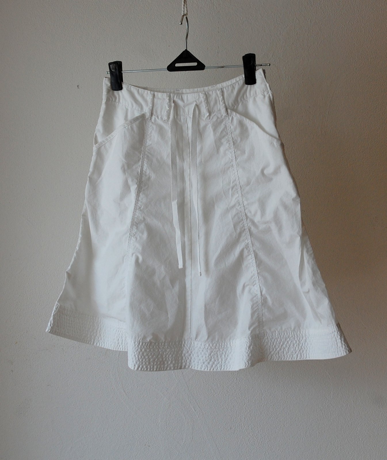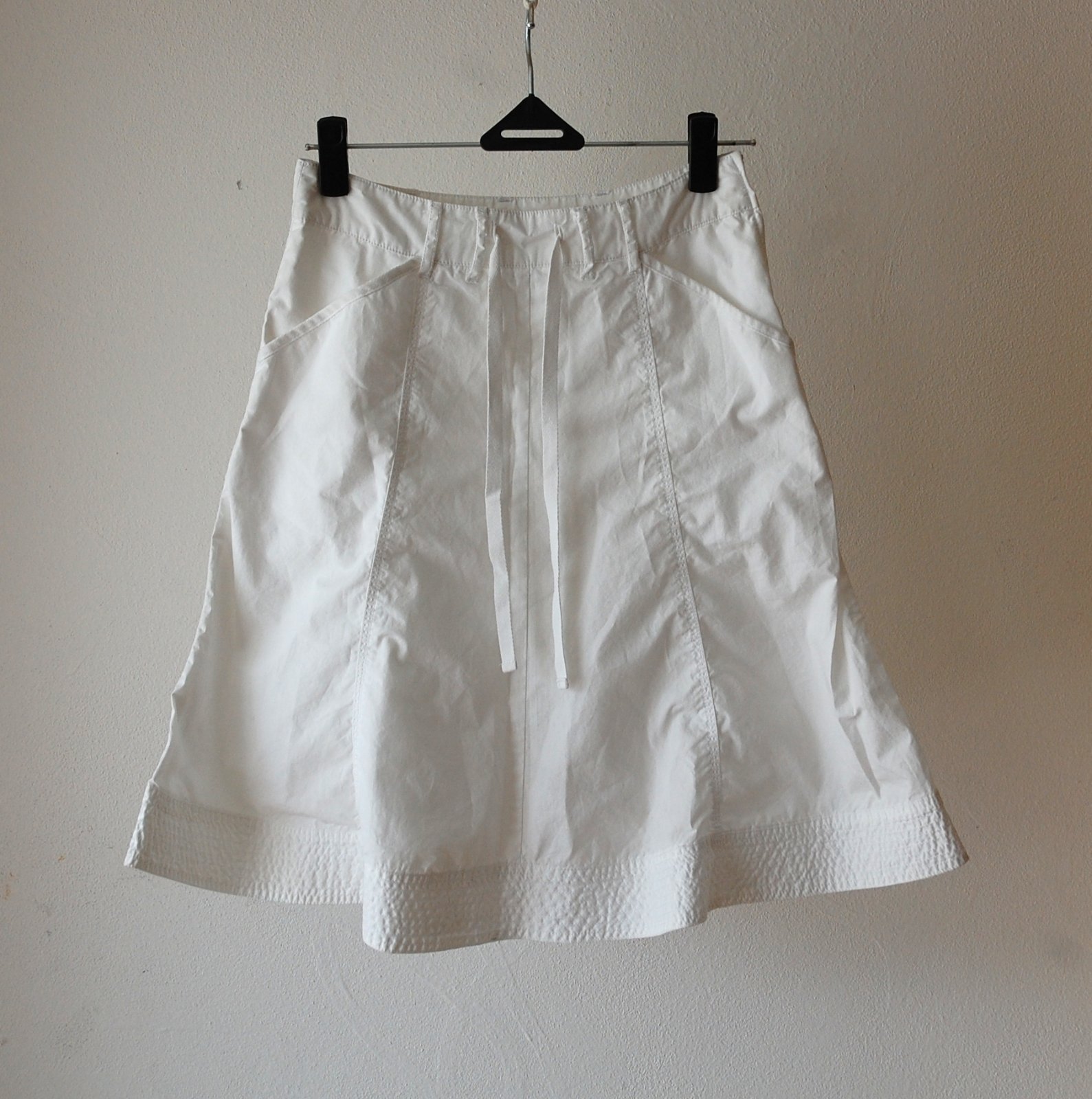 Biela bavlnená sukňa so šnúrkou v páse a detailmi prešitia. ležérny, športový alebo pracovný. sťahovacia šnúrka v páse, asymetrický spodný lem a výrazné prešívanie.