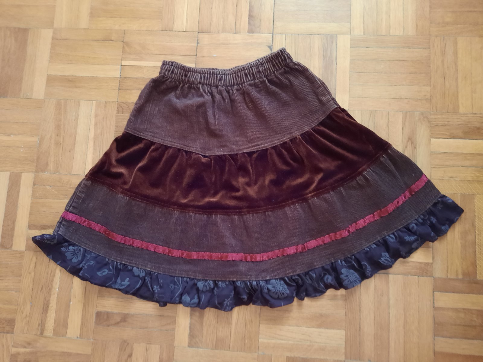 Predám veľmi peknú menčestrovú sukňu kombinovanú s hladkým semišom (velúr). Je zošitá z viacerých častí. Dole je ozdobená aj stuhou. Pás je na gumu. Sukňa sa postupne rozširuje do A-čka.
