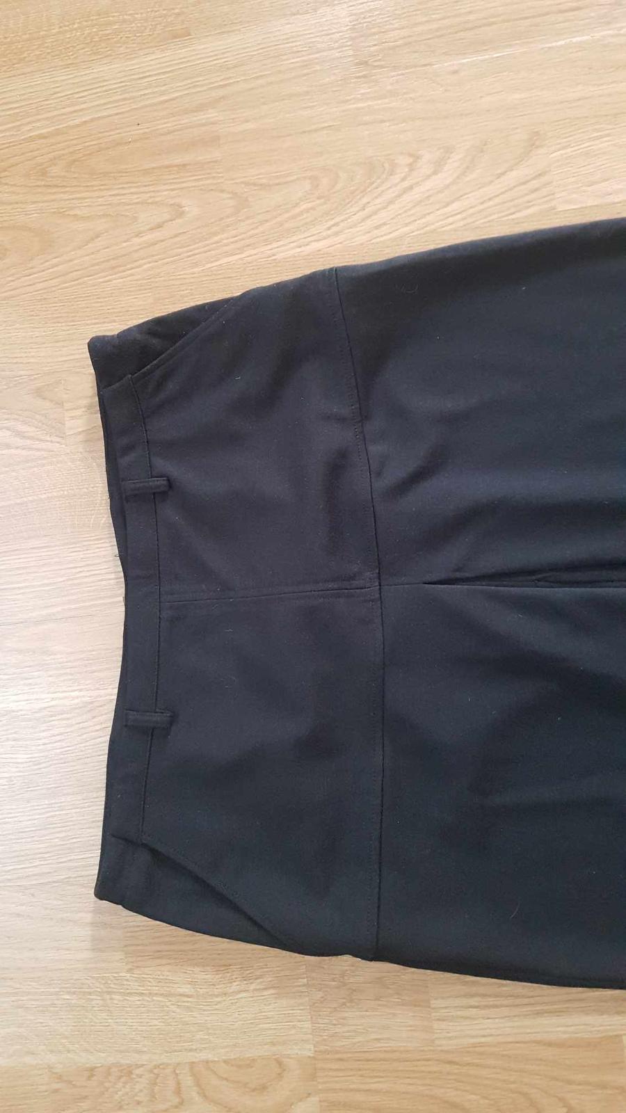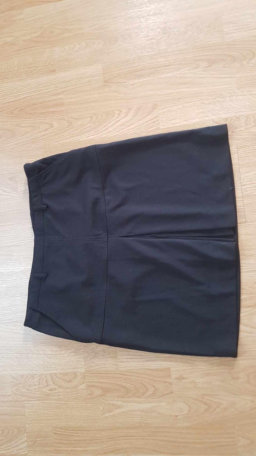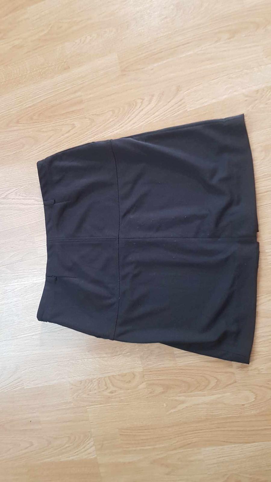 čierna sukňa po bokoch s vreckami, má v predu rozparok, na boku zips. Pás je 44 x 2 cm, natiahne sa do 48 x 2 cm. Celková dĺžka je 52 cm, v páse sú pútka na tenký opasok.