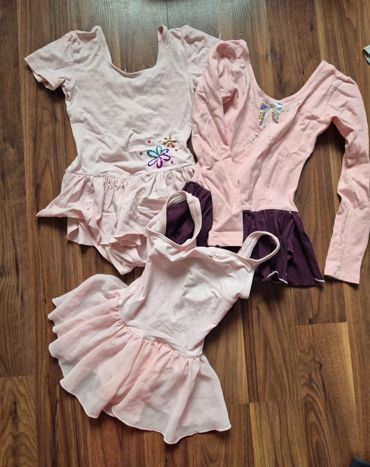 Krásne baletné dresy. Veľkosť 128-134. Nosene, bez vad. Spodný dres darujem, má jeden flak.