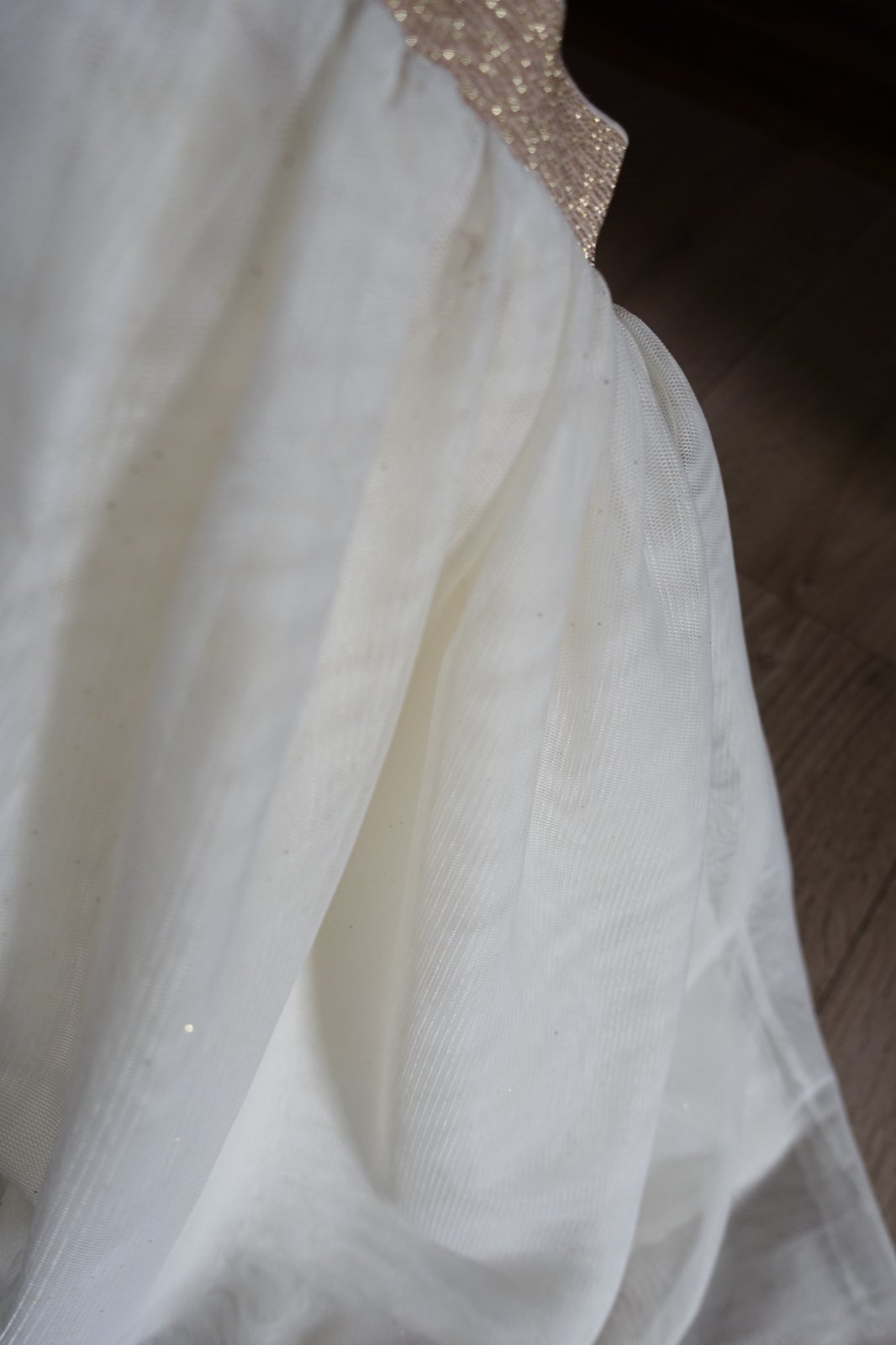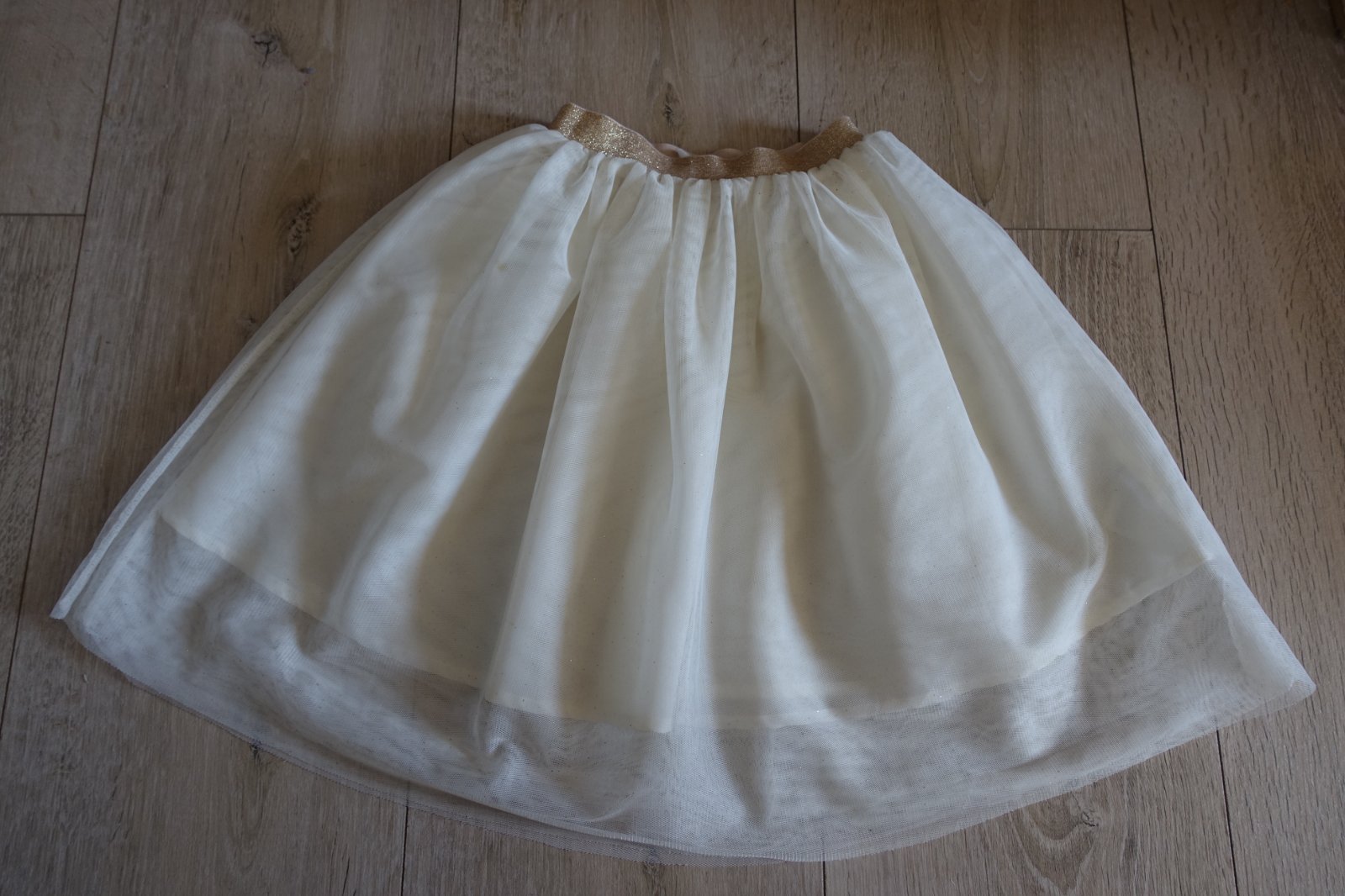 Predám krásnu 2 vrstvovú krémovú sukničku so zlatými trblietkami a zlatou trblietajúcou sa gumičkou na páse so spodničkou. Nádherná. Je krajšia v skutočnosti ako na foto. Pekne sa trbliece, trblietka neopadávajú. Mali sme ju 1 krát, ale je v peknom stave, až top stav. Má maličkú chybičku krásy, na úplnom spodku na konci kúlilinček chýba, ale keď je oblečená to vôbec nevidno. Bolo to tak od novoti. Viď foto. Inak top stav. Dĺžka po spodničku je 39 cm a ešte je na spodku o 8 cm predĺžená. Šírka pásu v kľude je 23,5 cm.