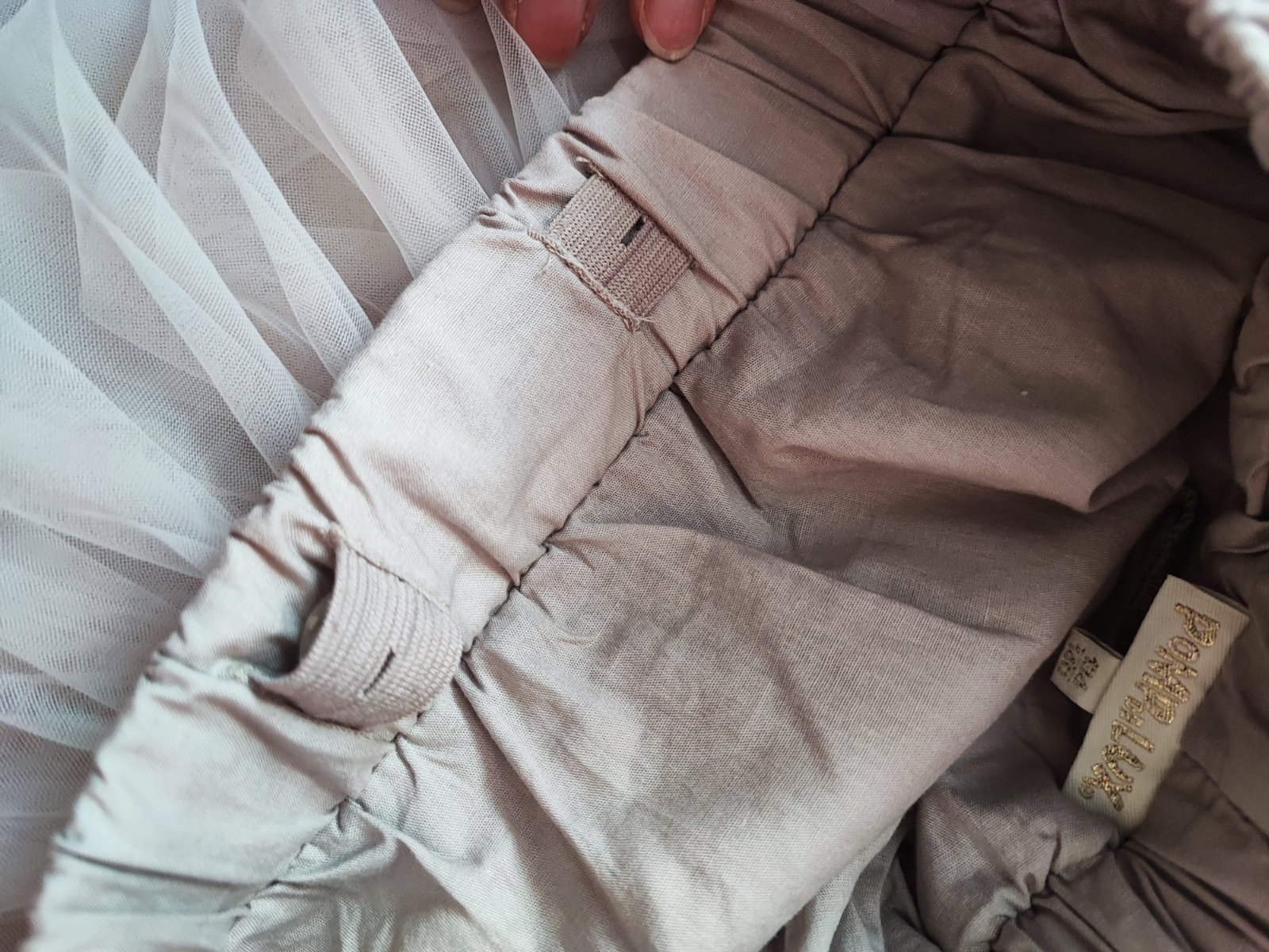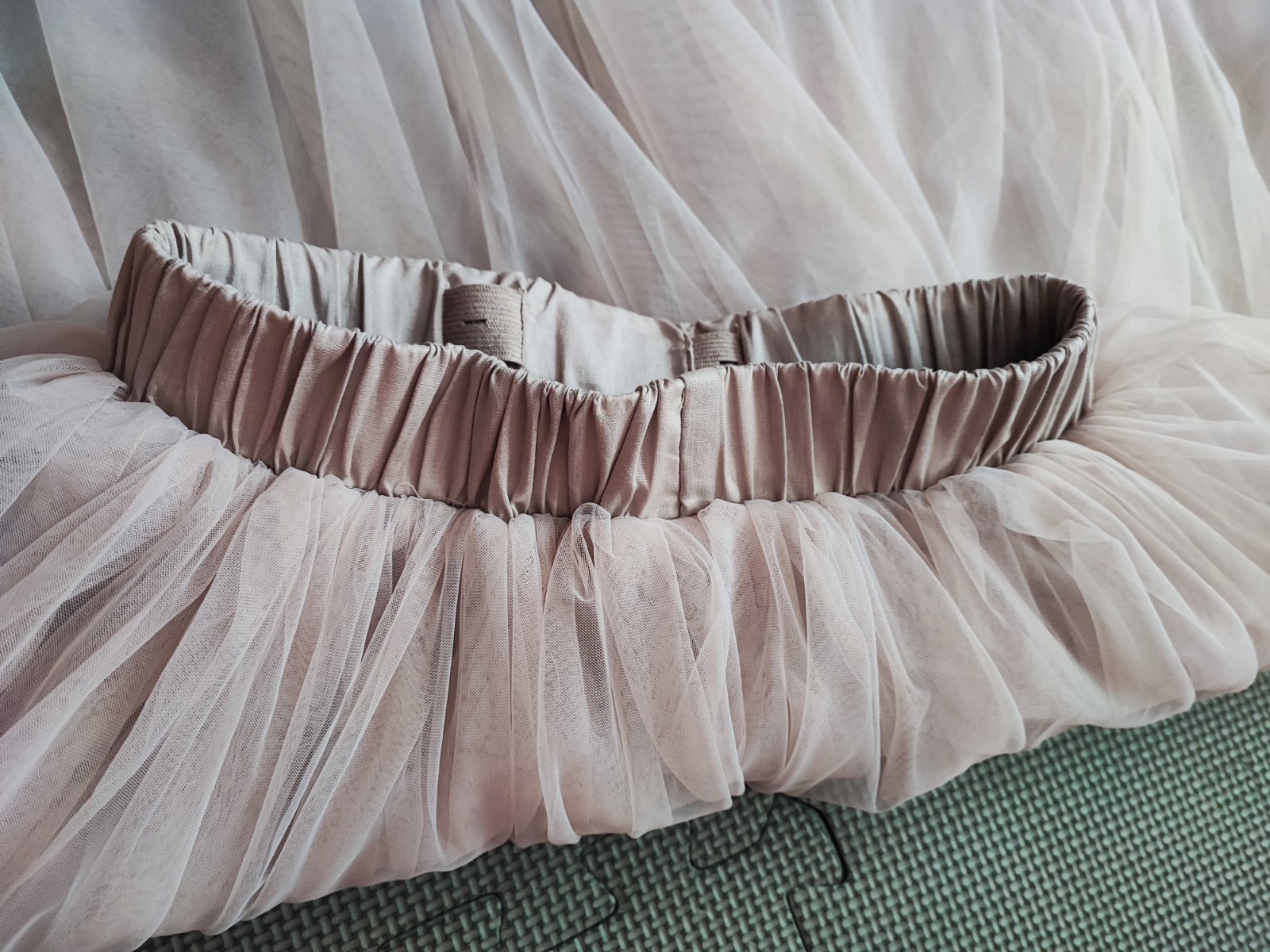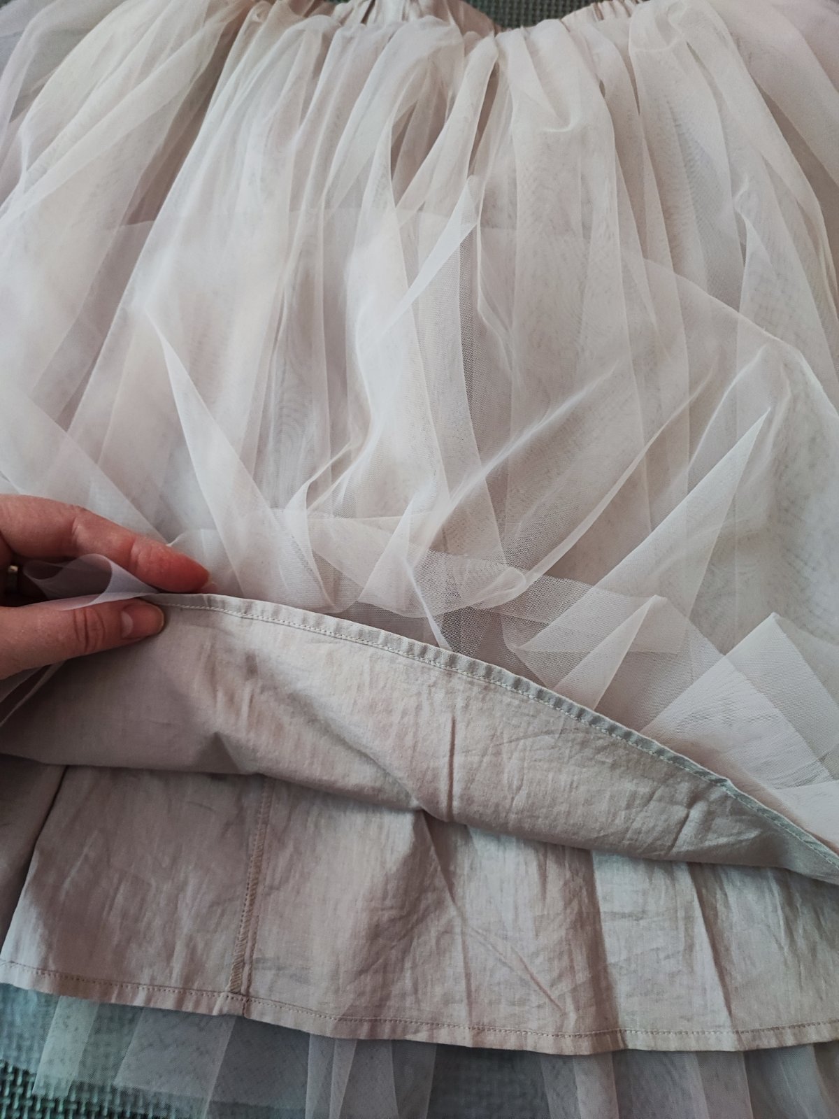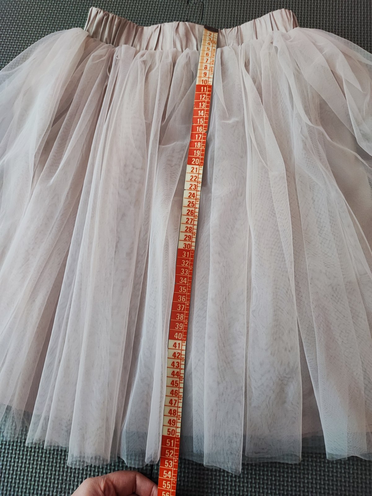 Nádherná bohatá sukňa. Raz oblečené na slávnostnom obede. Bez poškodenia. Farba je taká bledo ružovo fialovo šedá. Neviem ju presne identifikovať. Pás je na gumu a dá sa aj regulovať. Podšitá je bavlnenou látkou.