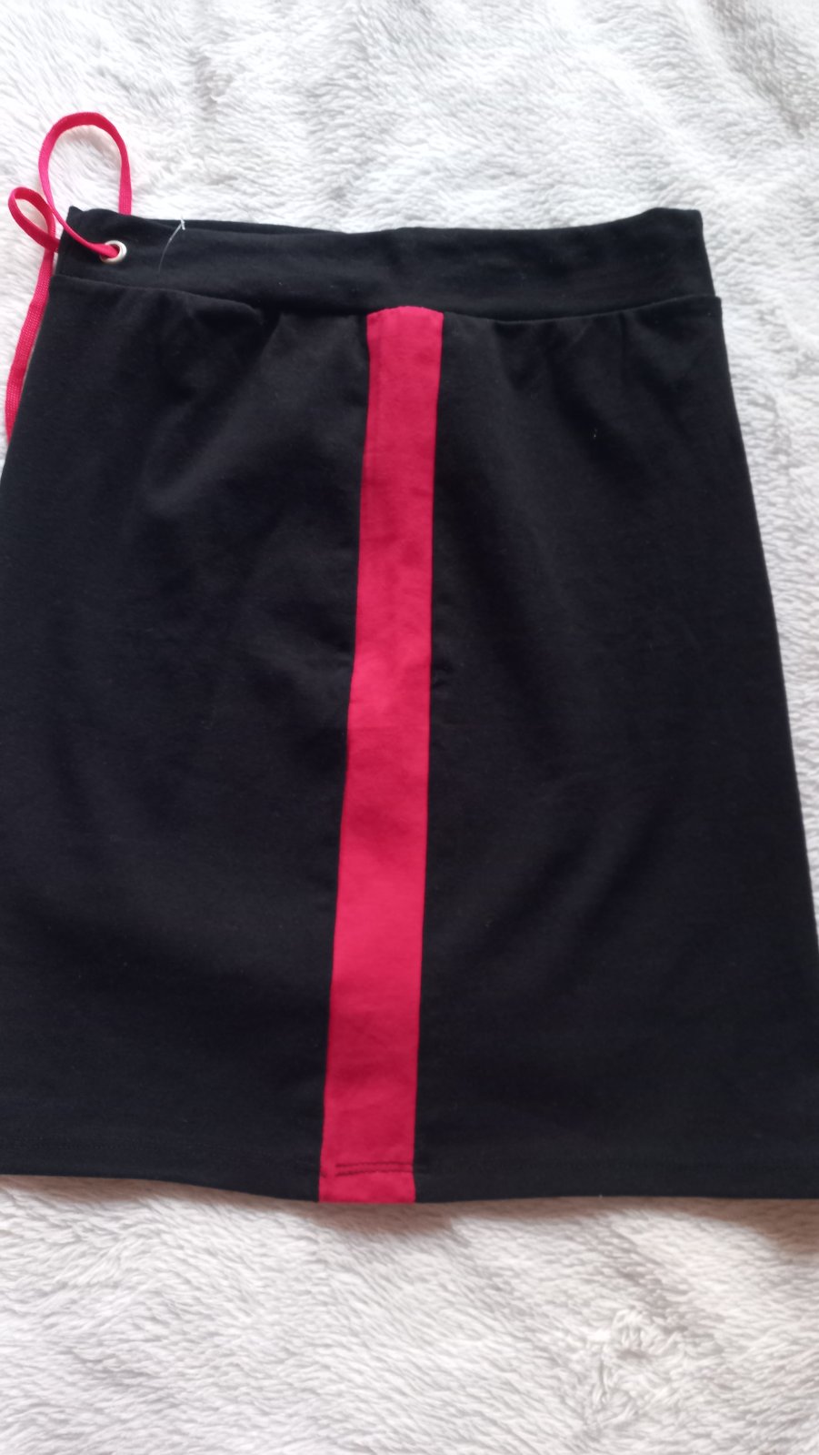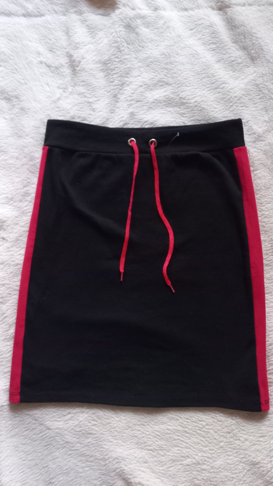Veľmi pekná suknička, úplet. Zloženie je 95 %bavlna a 5 % lycra. Po bokoch červené pruhy. V páse šnúrka. Boky 43 cm, dĺžka 50 cm. Na štítku je veľkosť L a tak aj bola objednaná, no sedí tak na S/M velkost. ZN: YAKUP'S