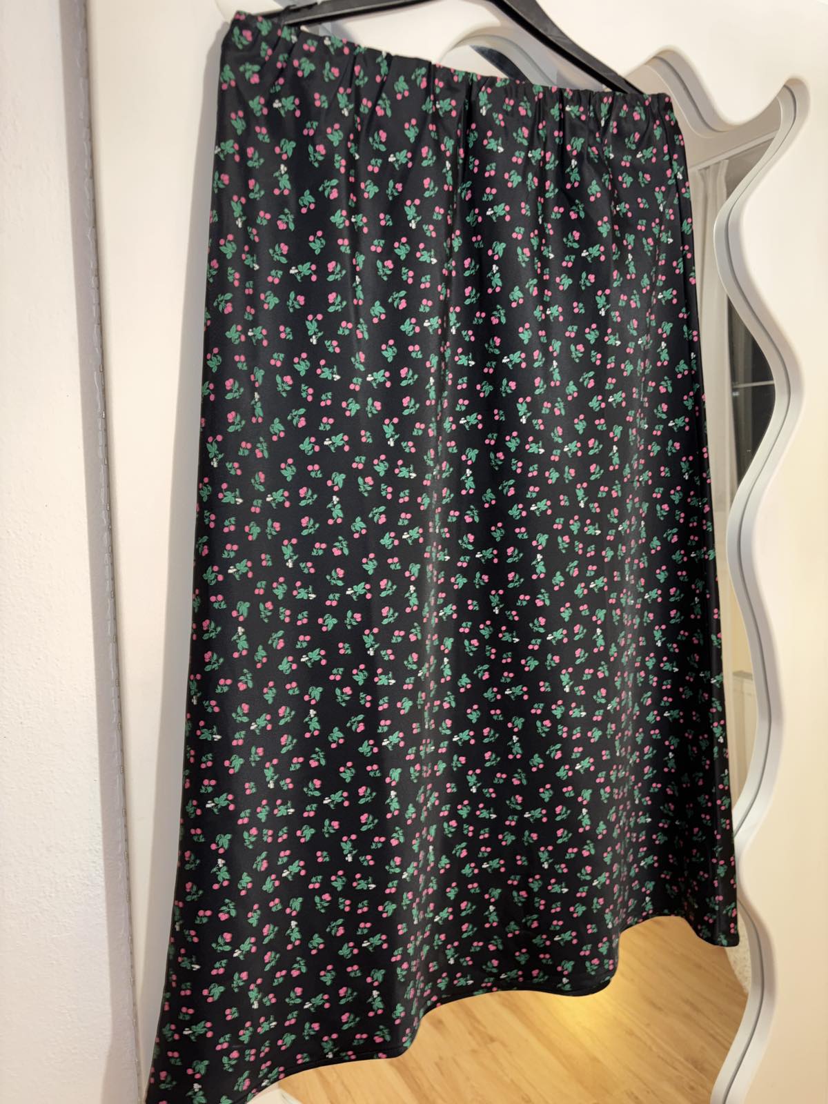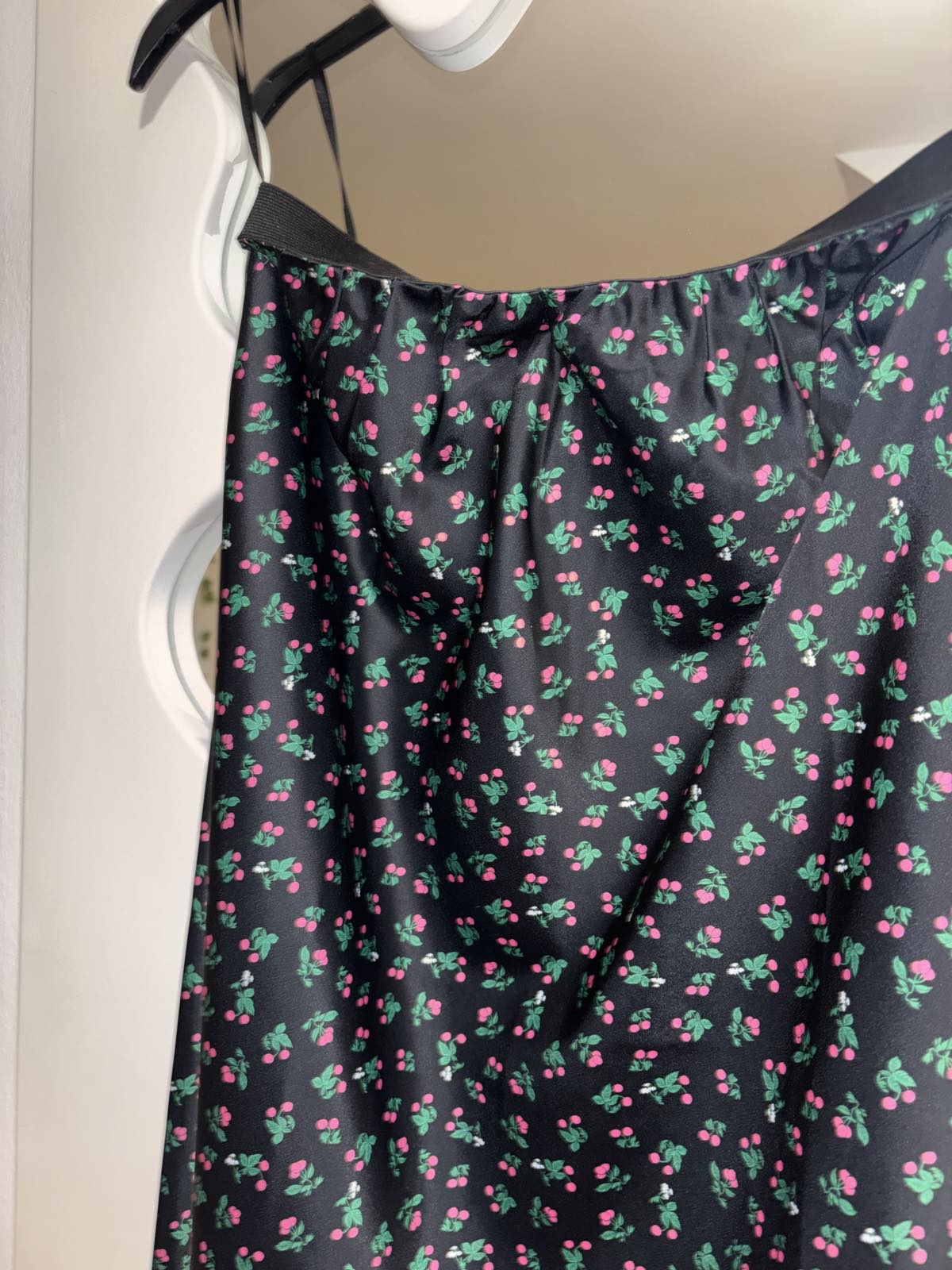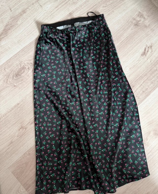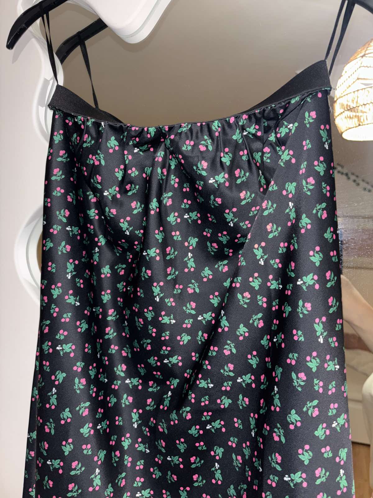 SkladomNová bez visačky, saténová, čierna s čerešňami, pružný pás, veľkosť M, pás v pokoji 35 cm, dĺžka 81 cm