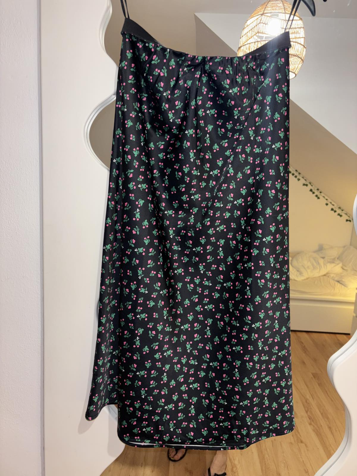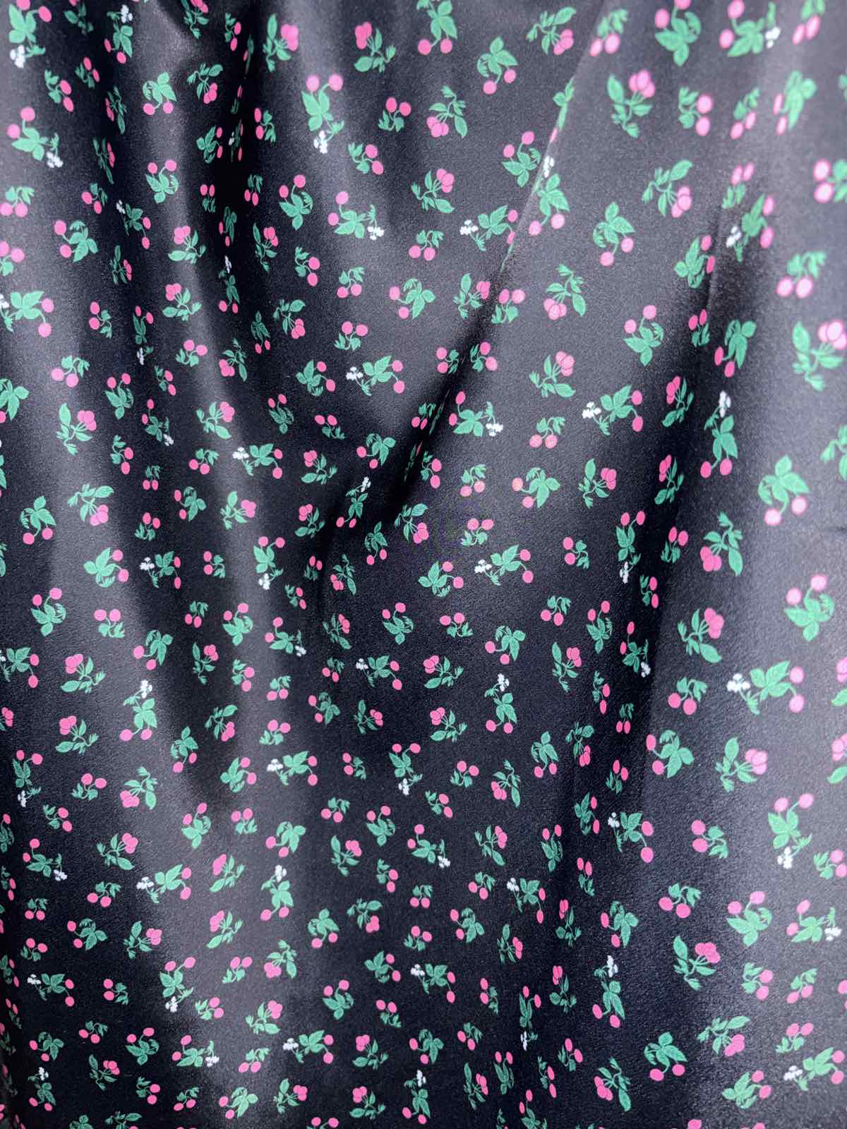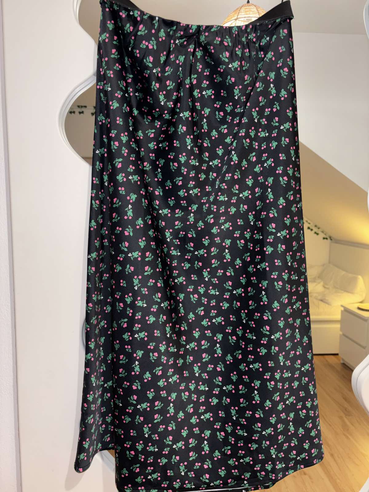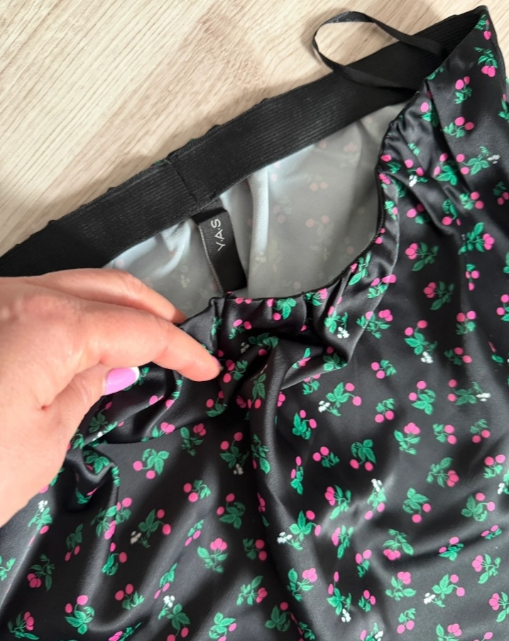 SkladomNová bez visačky, saténová, čierna s čerešňami, pružný pás, veľkosť M, pás v pokoji 35 cm, dĺžka 81 cm