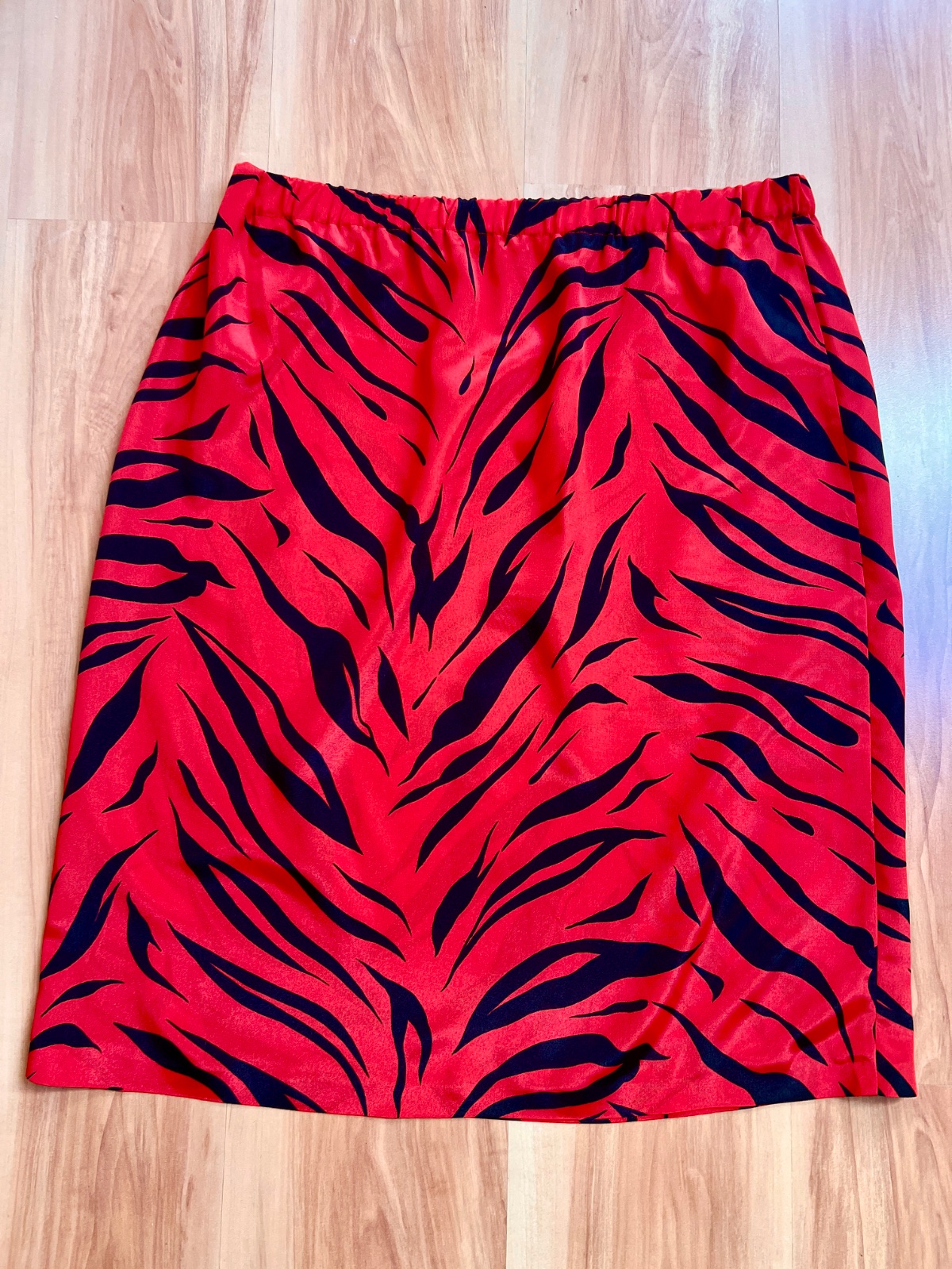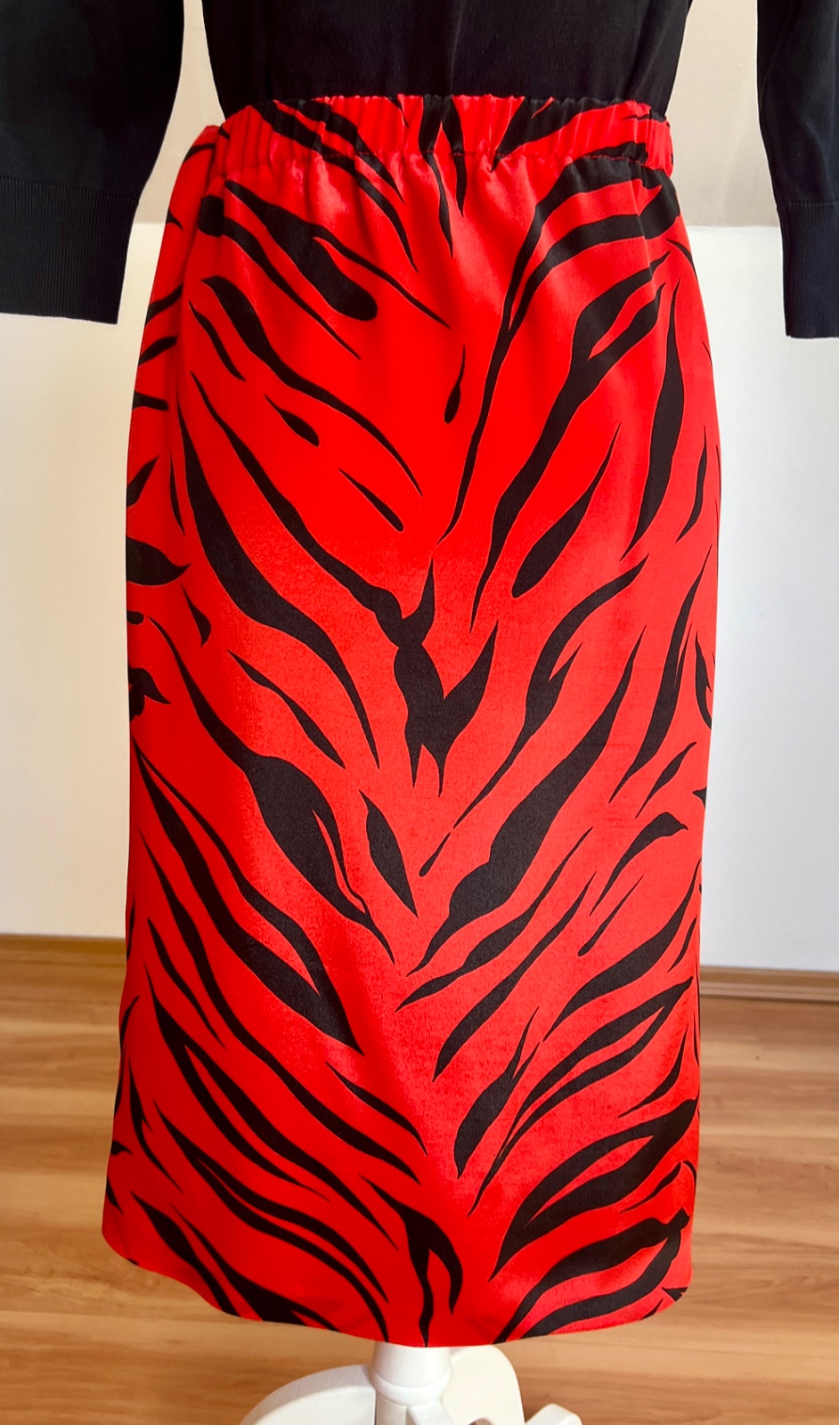 Tenká lesklá sukňa s červeno-čiernym tigrovaným vzorom. V páse je na gumičku a pre ľahšie chodenie má aj rozparok. Veľkosť L.