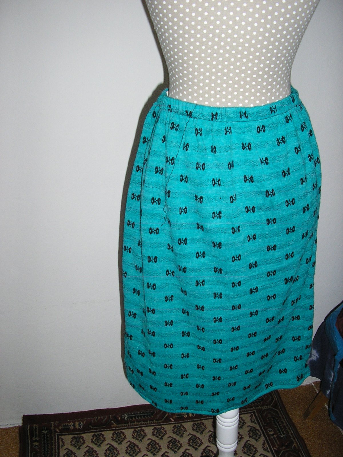 Miery: pás 33-45 cm x2, d – 62 cm. Úpletová zelená sukňa s čiernym vzorom, rovného strihu, v pase vtiahnutá guma, nenosená.cena 4,-