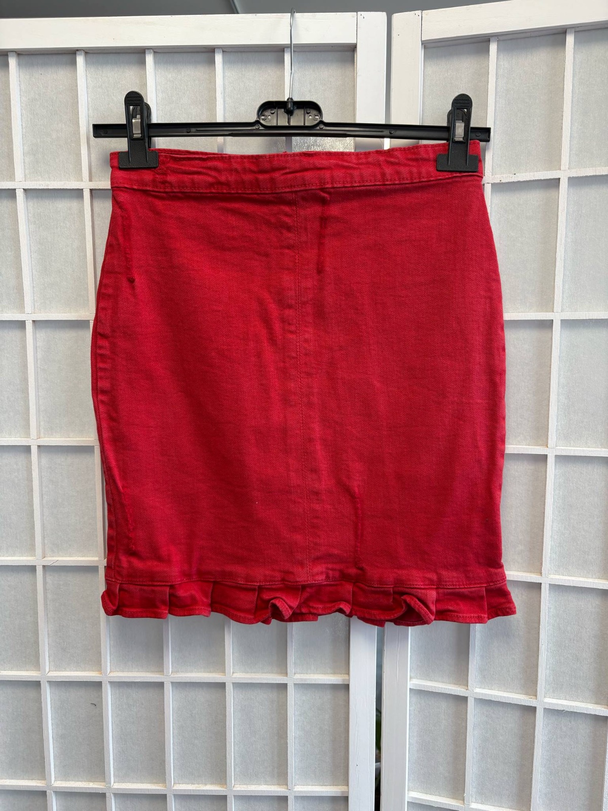 Tehlovocervena kockovana sukňa. Veľkosť S. Vpredu na zips. Vzadu 2 vrecká. Obsahuje elastan. Dĺžka 39 cm. Boky 92 cm, bedra 80 cm.