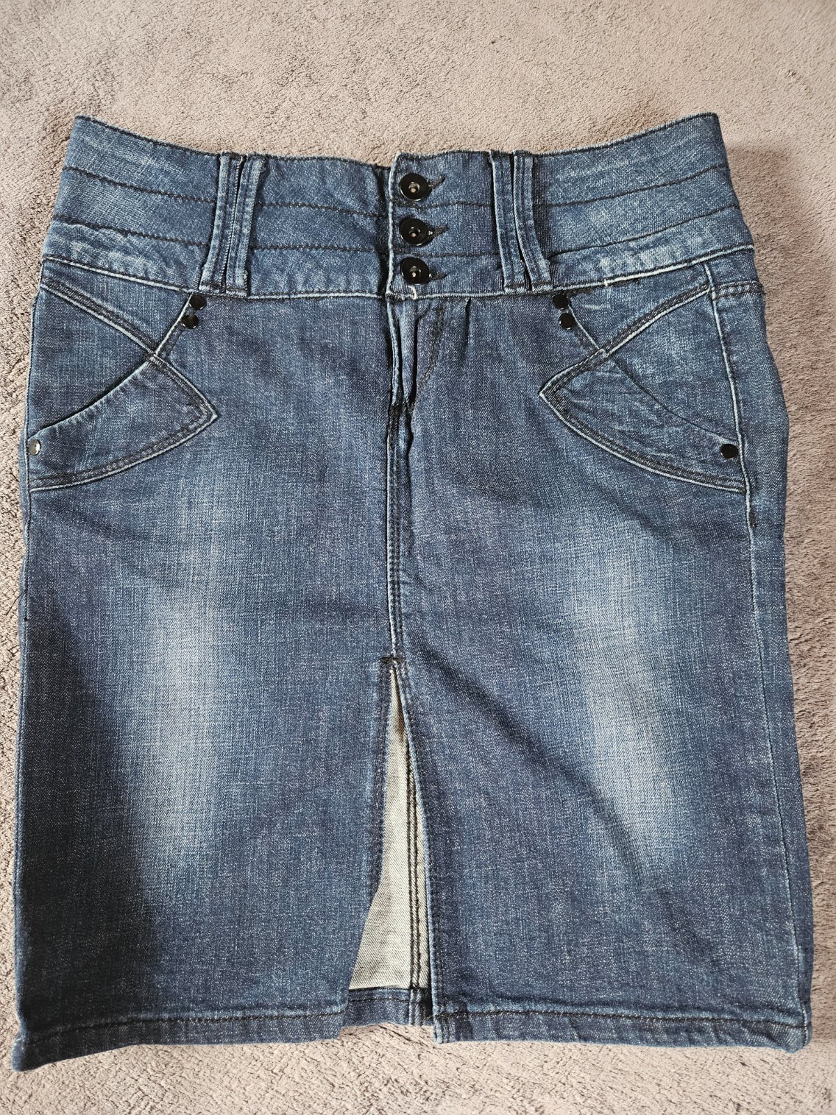 Predám riflovu vysuchanu suknu zn.Reserved, veľkosť 38, máličko nosena, nafúknuty strih, na gombíky, bedrova, krásne sedí, pás 41 cm, dĺžka 34 cm,