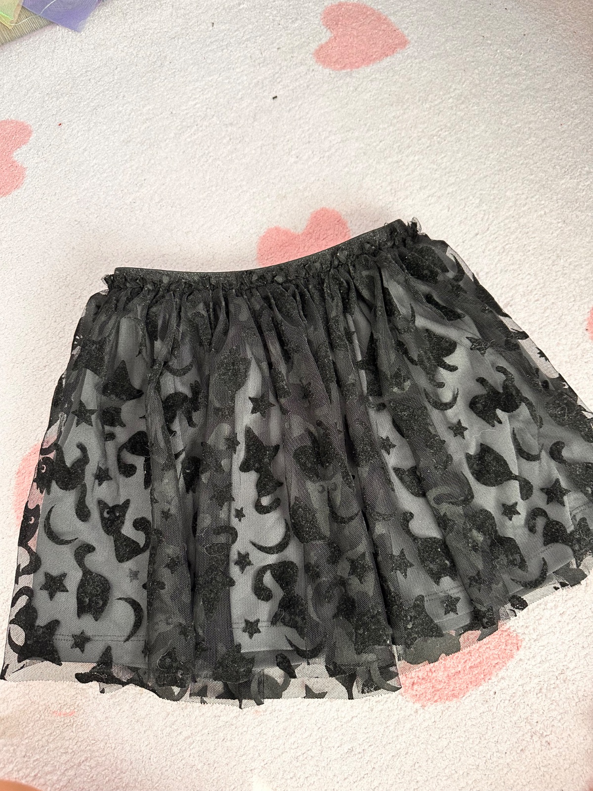 Krásna tylová suknička na gumku s motívom mačiek pôvodne kupena na jesen/aj ako helloweenska/ kedze bola predavana cez helloween.cize nositelna aj bezne aj napr ako sucast nejakej masky na karneval. Potlac a sieťka čierna,je nepriesvitna a pod vonkajšou vrstvou su dalsie tylove tmavosive vrstvy. Bez poškodení,malo nosena