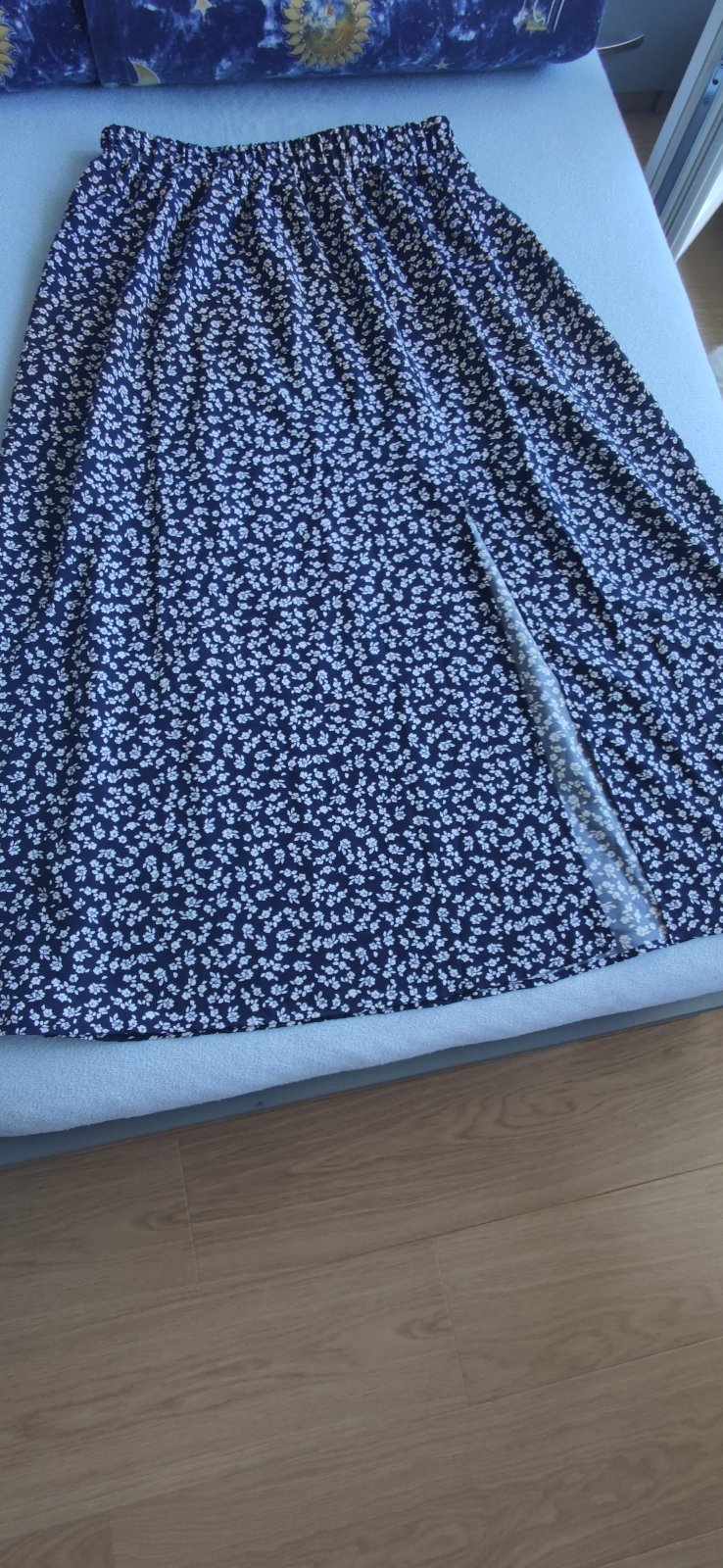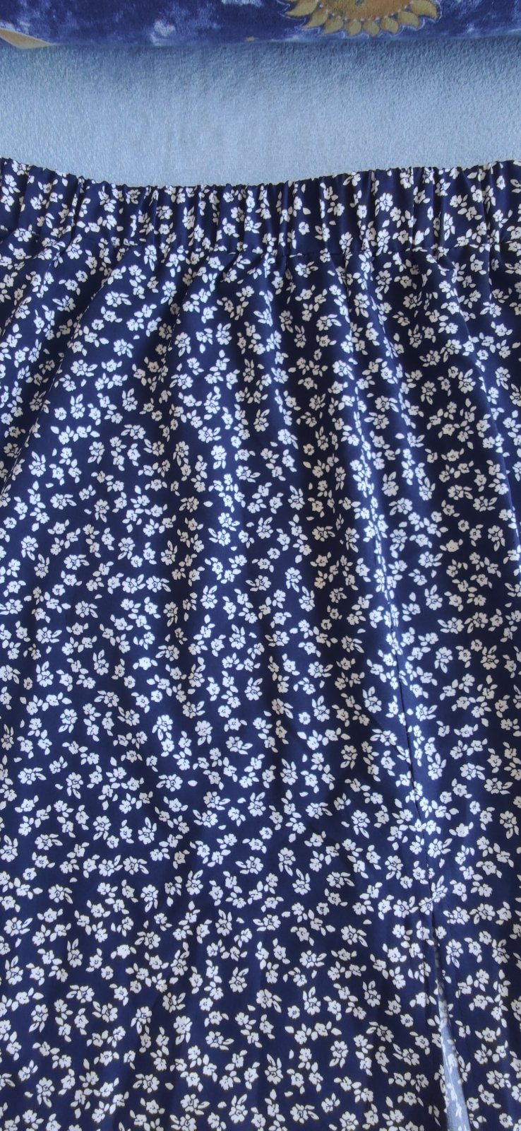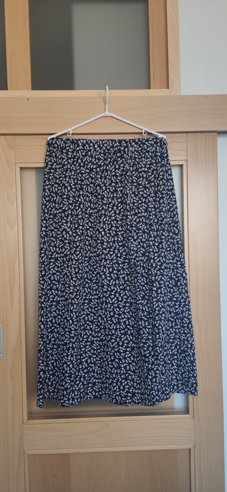 Predám raz oblečenú dámsku sukňu. Je ľahká, pohodlná. Pás na gumičku. Farba tmavomodrá s bielymi kvietkami. Veľkosť L.