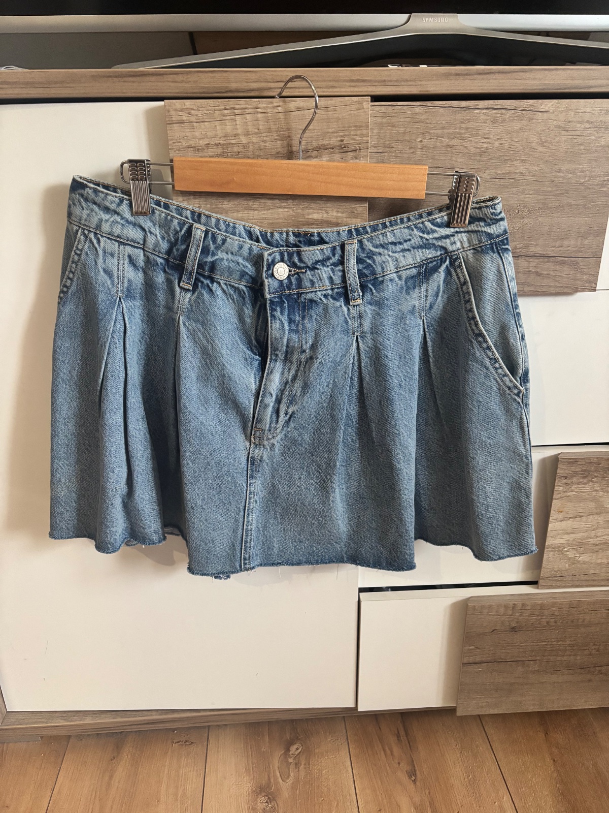 Skladaná riflová mini sukňa s efektom “strapkania sa” po okraji