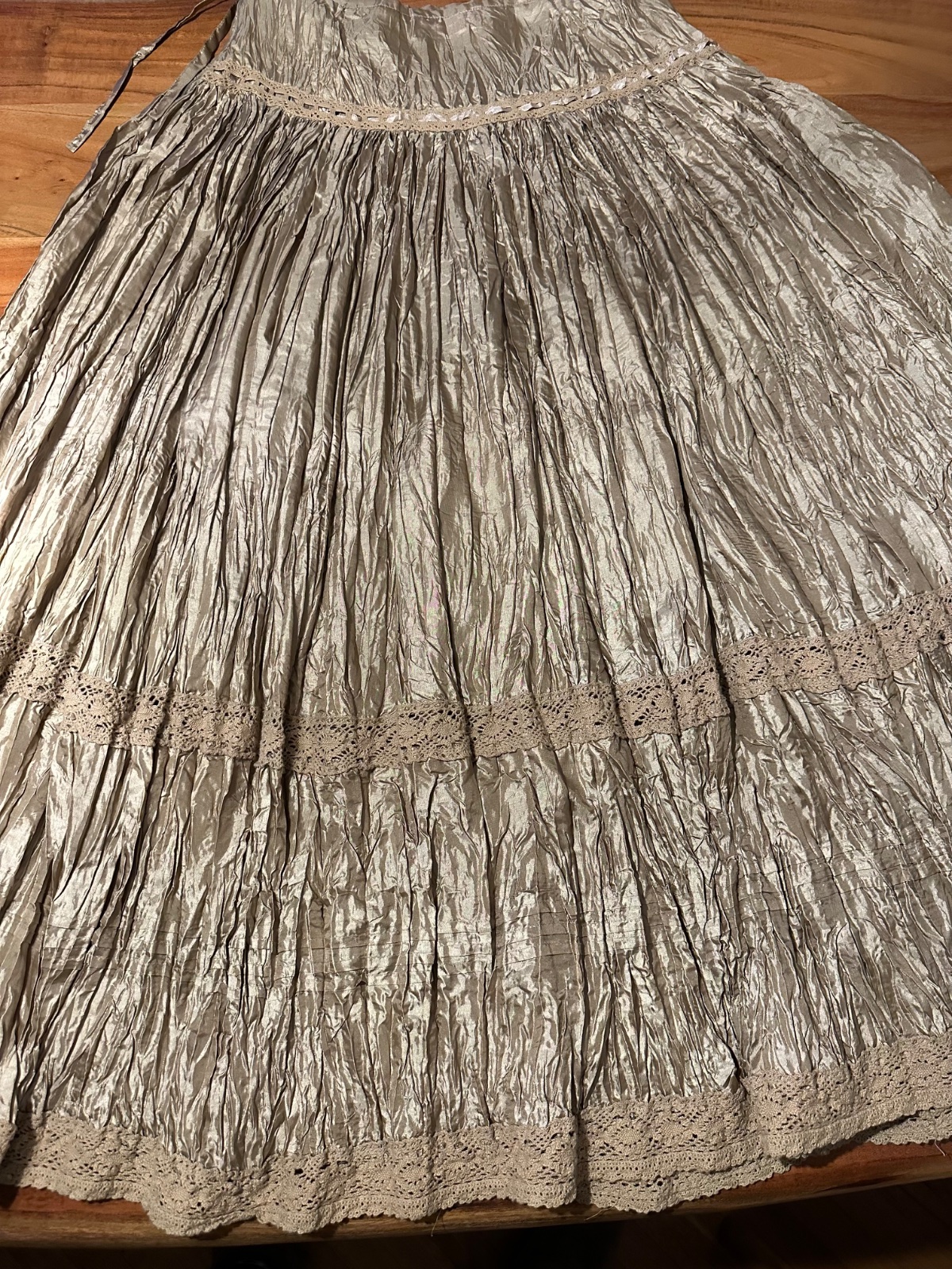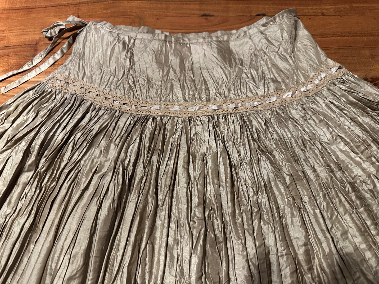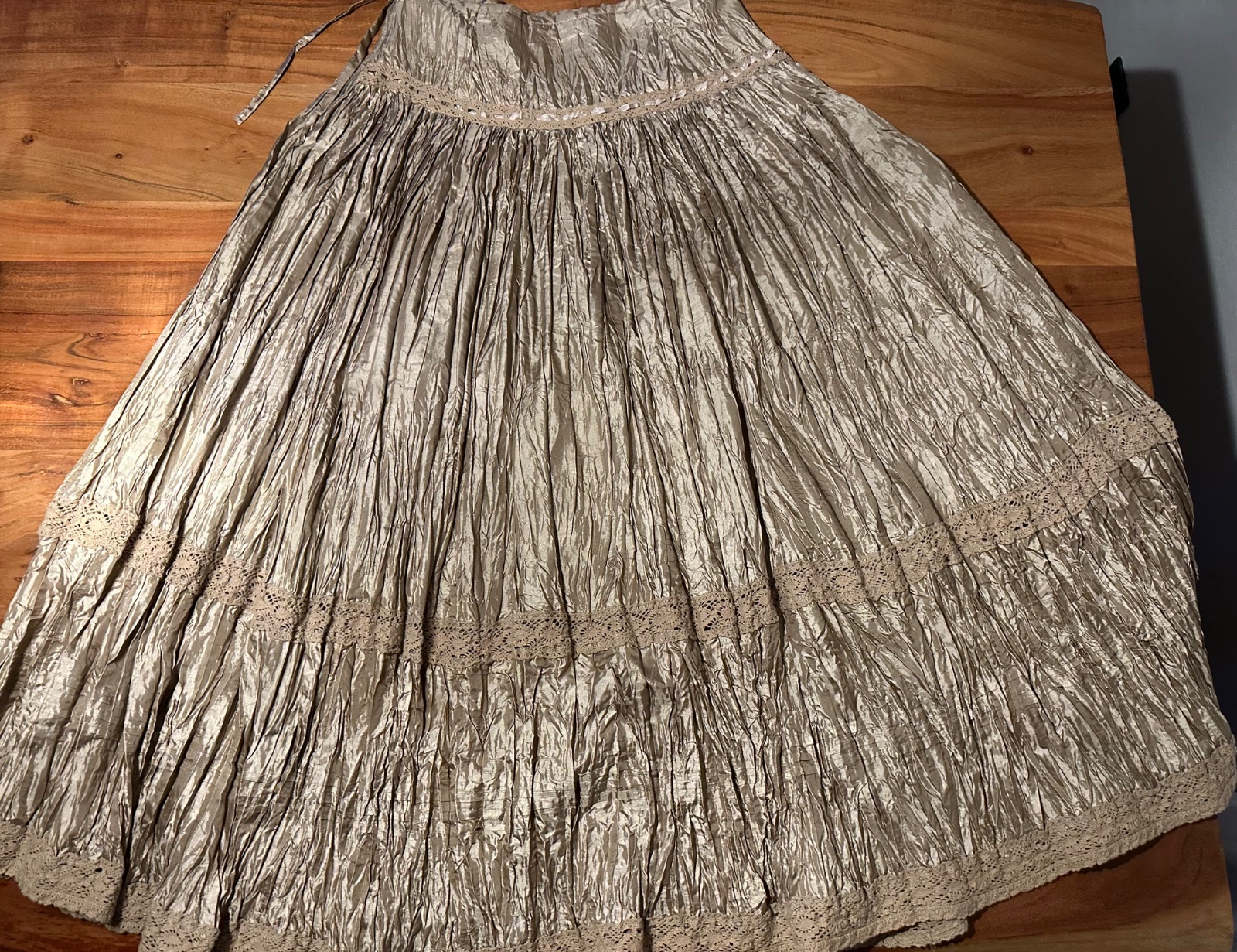 Luxusná široká sukňa. Tlmený odtieň zlatej. Pokrčený vzhľad, hladké sedlo, zapínanie na zips, stiahnutie na šnúrku. Po celej ploche všité pásy hrubšej čipky v rovnakom odtieni. Šírka pás 75 cm, dĺžka 92 cm. Výborný stav, okrem zipsu, dá sa zapnúť, ale bolo by ho treba vymeniť. Sukňa je neprehliadnuteľná, dobre sa kombinuje. Na akúkoľvek spoločenskú príležitosť. Príjemná na telo, ľahko sa perie, nežehlí, len sa vysuší na ramienku.