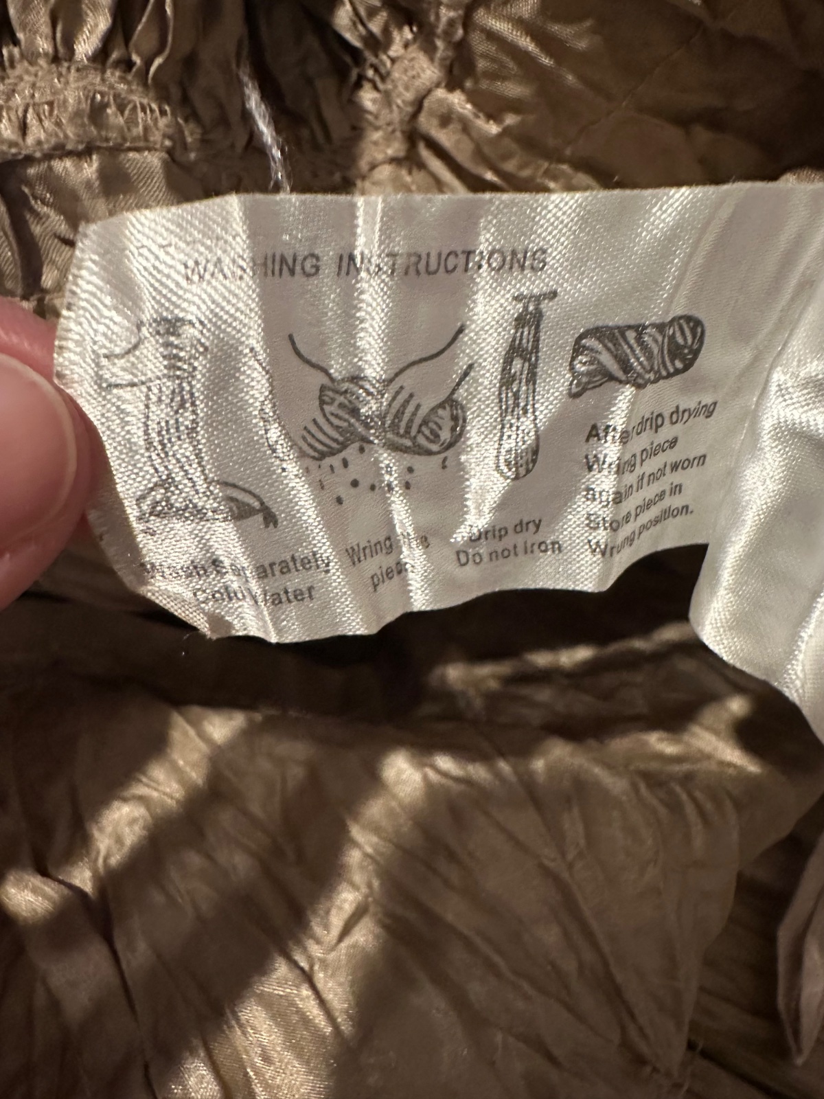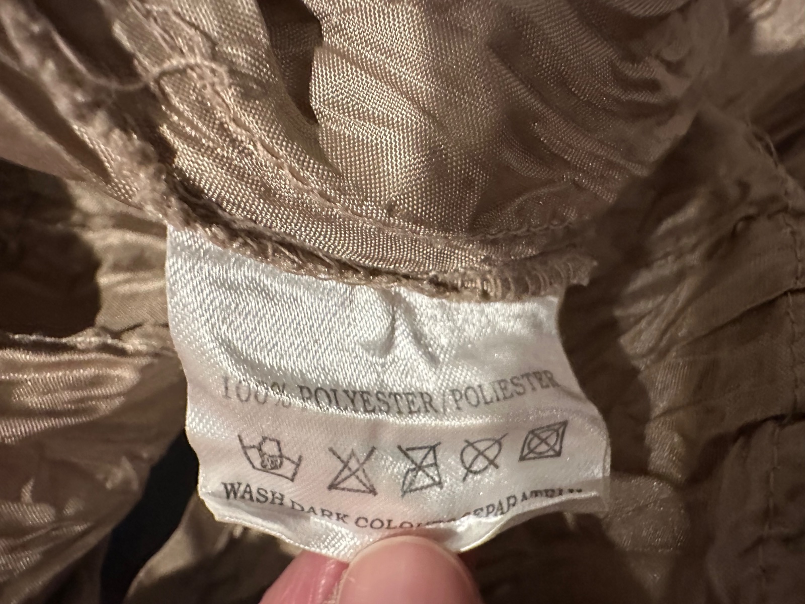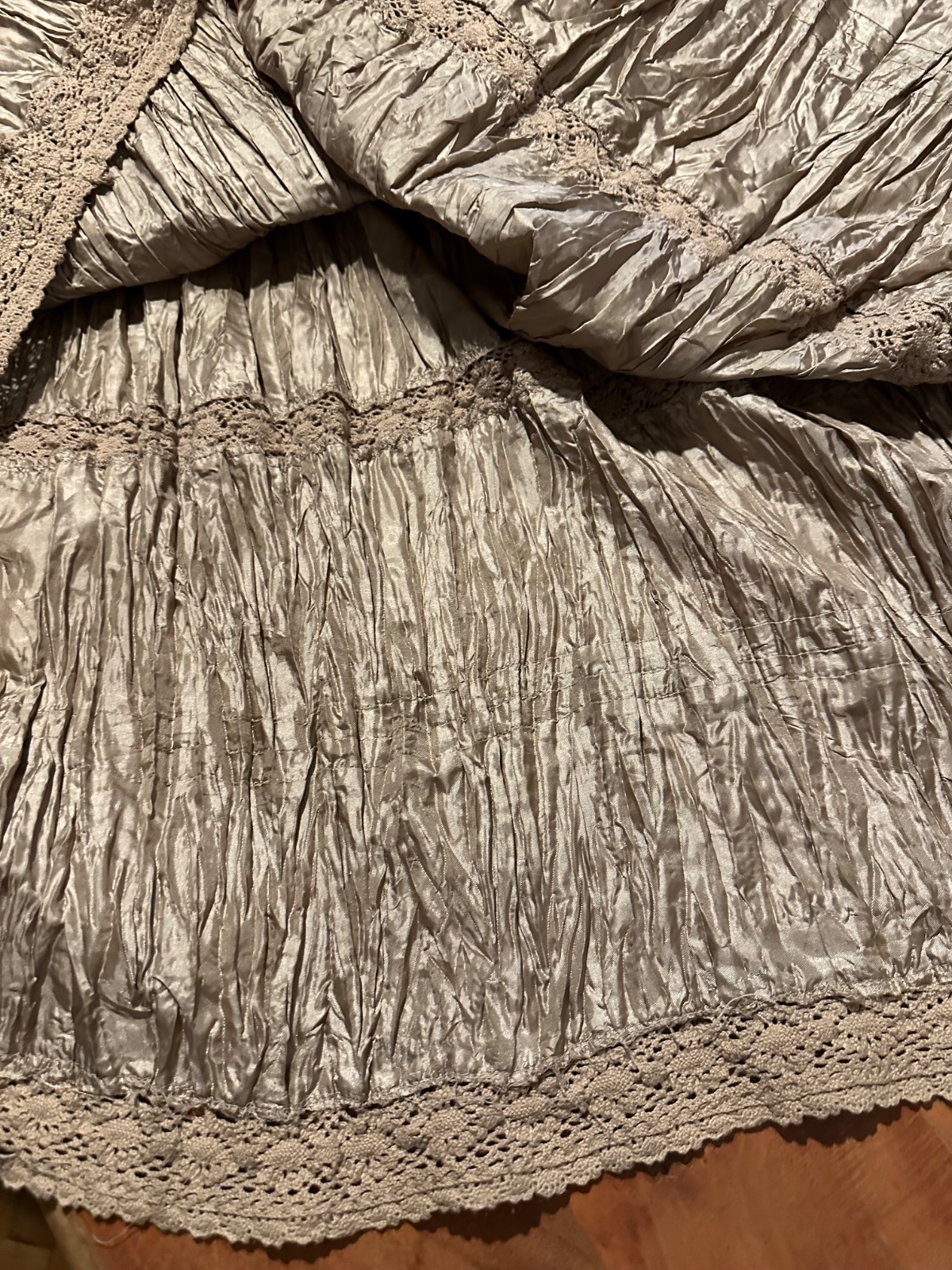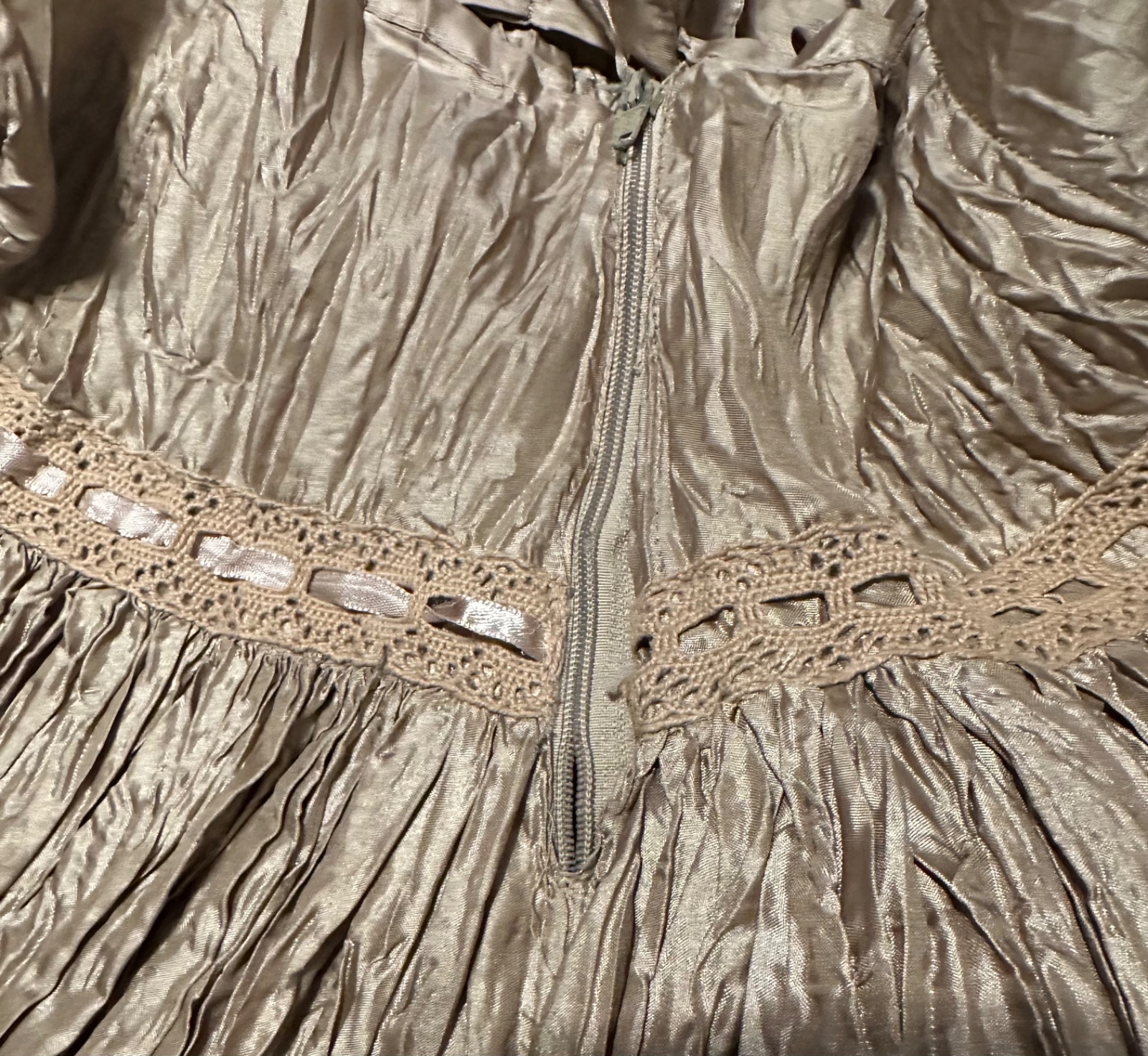 Luxusná široká sukňa. Tlmený odtieň zlatej. Pokrčený vzhľad, hladké sedlo, zapínanie na zips, stiahnutie na šnúrku. Po celej ploche všité pásy hrubšej čipky v rovnakom odtieni. Šírka pás 75 cm, dĺžka 92 cm. Výborný stav, okrem zipsu, dá sa zapnúť, ale bolo by ho treba vymeniť. Sukňa je neprehliadnuteľná, dobre sa kombinuje. Na akúkoľvek spoločenskú príležitosť. Príjemná na telo, ľahko sa perie, nežehlí, len sa vysuší na ramienku.