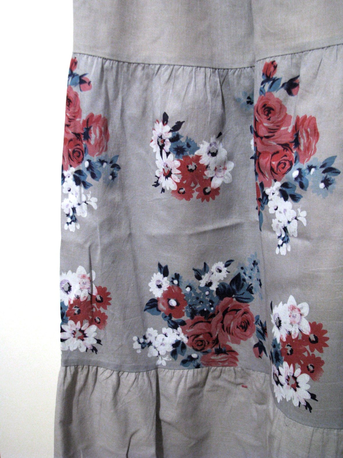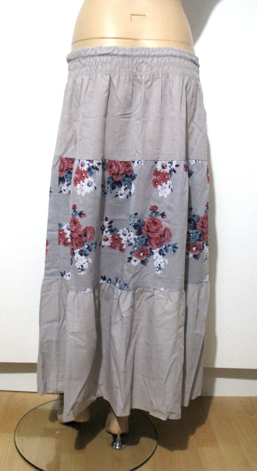 Svetlosivá bavlnená letná sukňa s potlačou kvetín, dlhá alebo midi podľa výšky. Výborne zachovalá, bez poškodení. Veľkosť univerzálna, v páse je guma, takže sa dá prispôsobiť. Nastavená je asi na XL - XXL. V prípade záujmu premeriam.